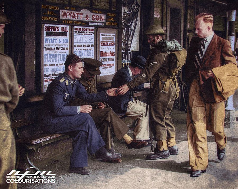 Photo: Captured Luftwaffe Pilot, Oberleutnant Johannes Wilhelm at Chichester railway station with Wyatt & Son advertisement behind. He was shot down in his 'Stuka' on 18 August 1940 over Fishbourne Creek, Chichester and is on his way to London with Military Police for questioning. Photo credit: RJM Colourisations.