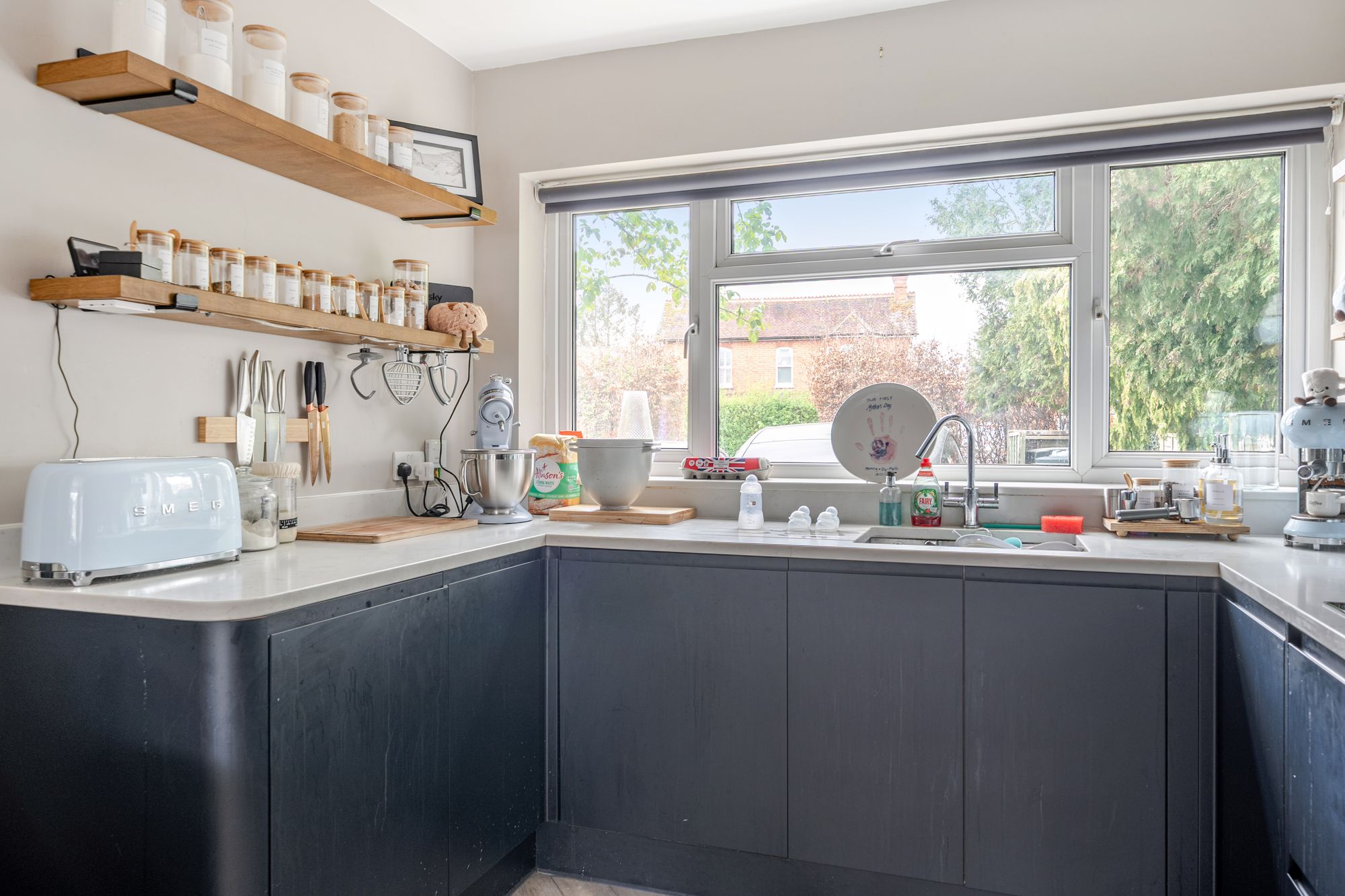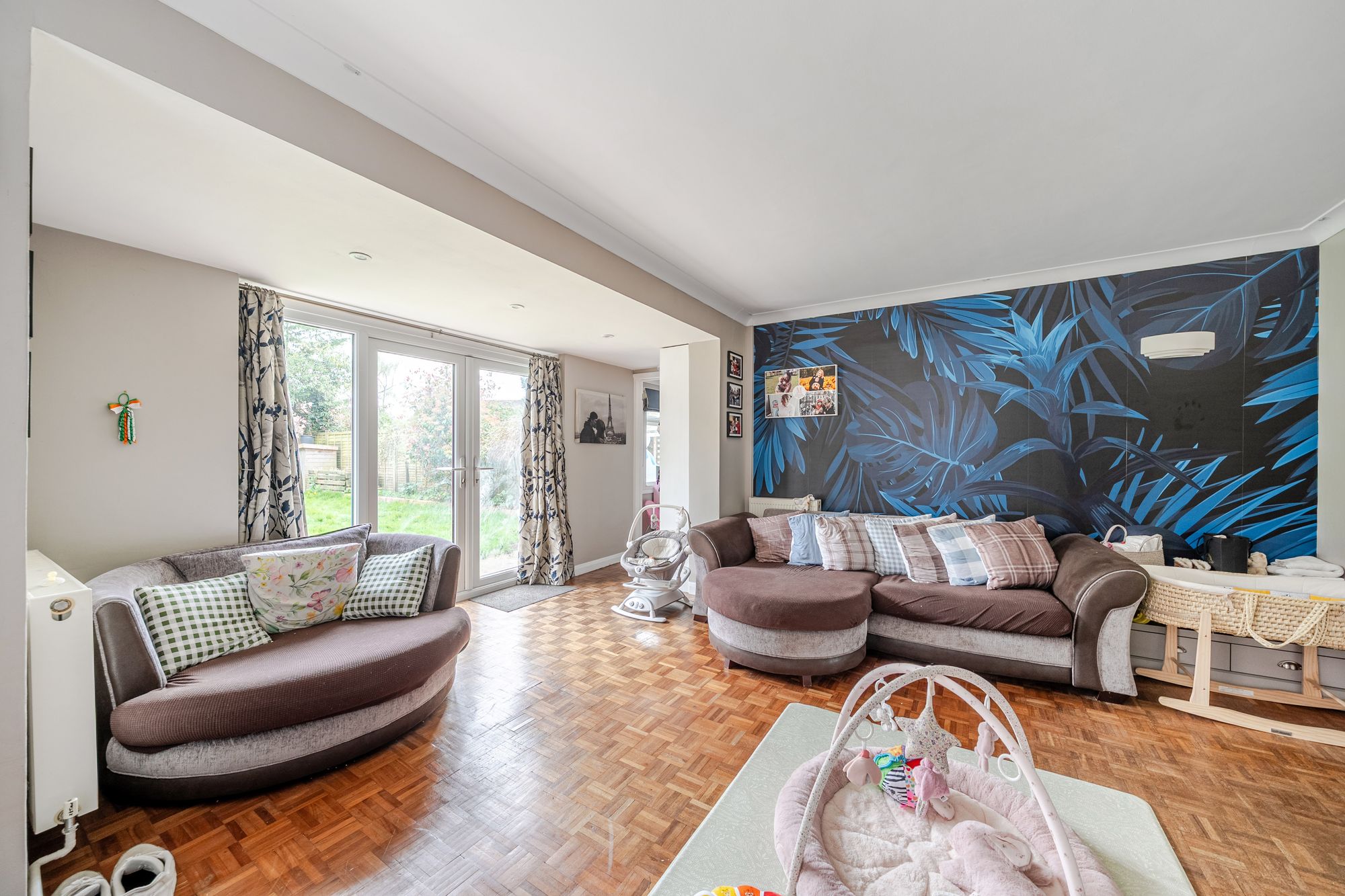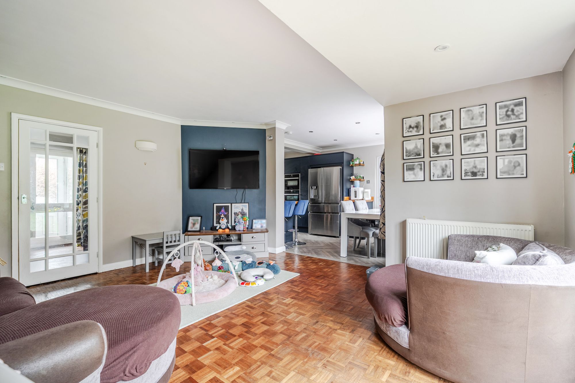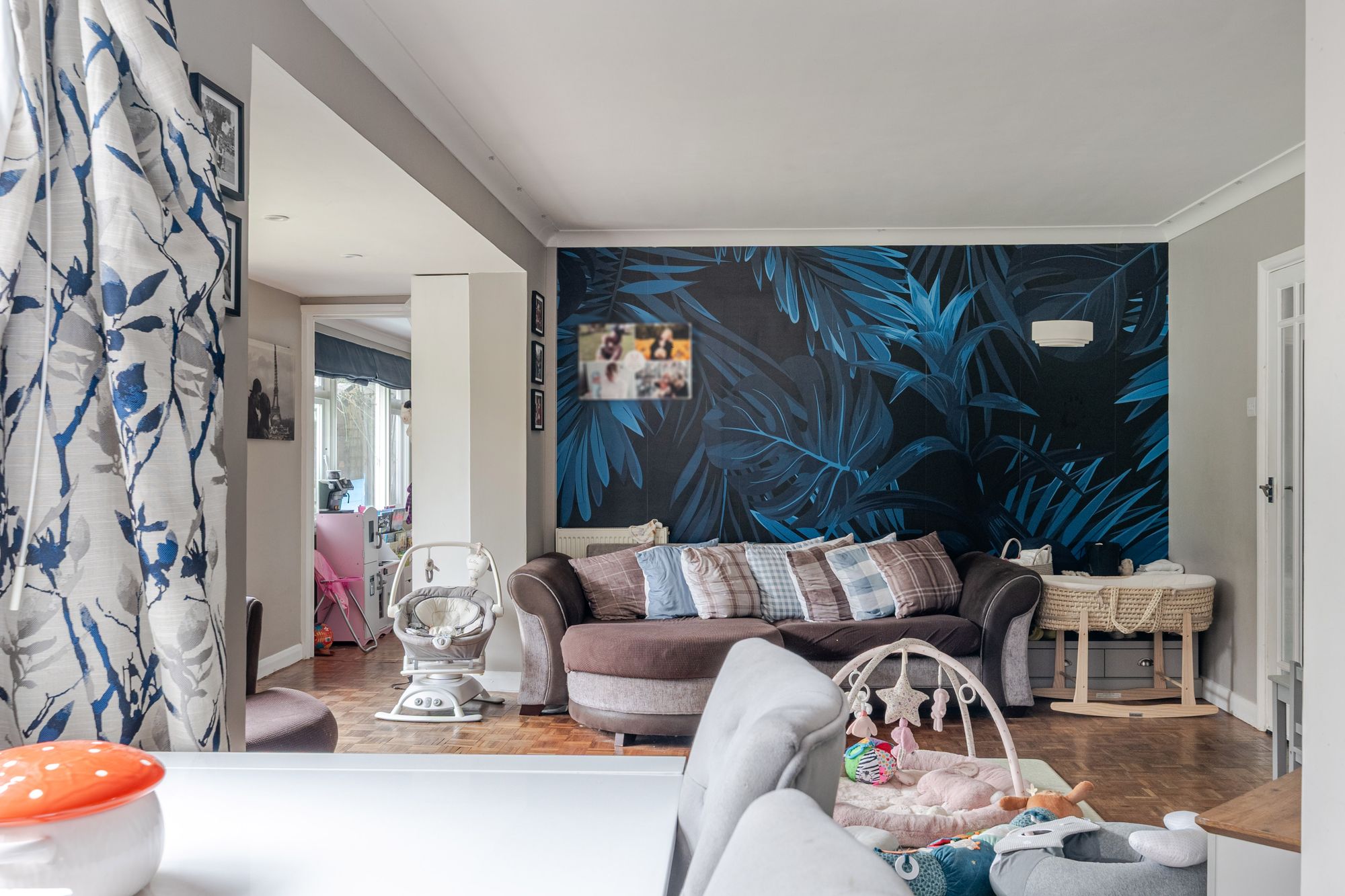 The property welcomes you with a spacious entrance hall featuring elegant parquet flooring, setting the tone for the rest of the home. The modern kitchen is finished with contemporary blue units, complemented by quartz and wood worktops, and is equipped with a double oven, induction hob, integrated dishwasher, and an American fridge freezer, making it perfect for both every-day living and entertaining with ample space for a dining table. The generous sitting room is a comfortable retreat, enhanced by an open fire and French doors, creating a light and inviting atmosphere. A second reception room offers flexibility as a study, play room, or additional living space, depending on your family's needs. Practical features include a separate utility room and a ground floor cloakroom, ensuring convenience for busy households.