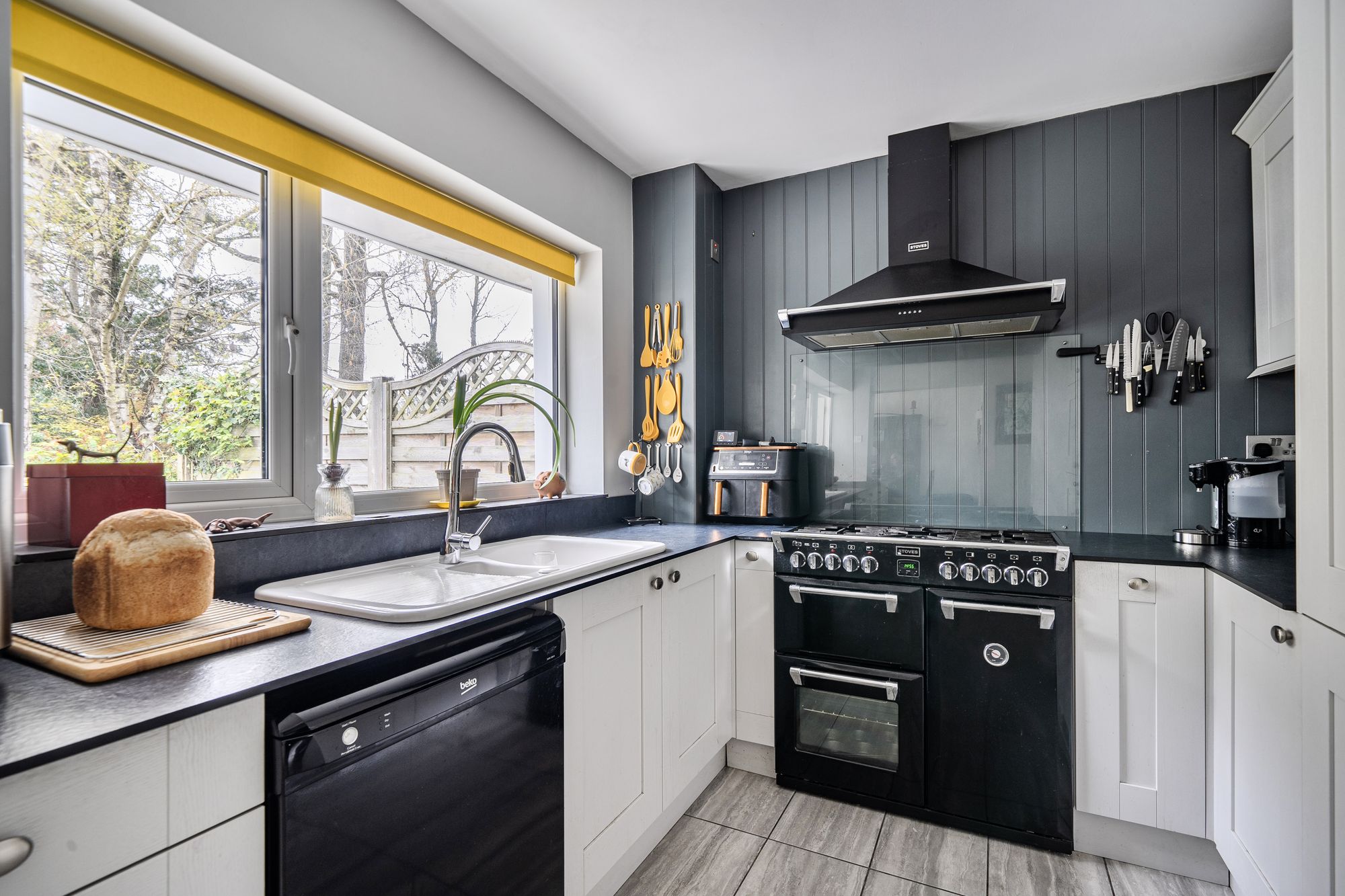 Upon entering, you are welcomed by a generous sitting room featuring a striking fireplace complete with log burner, creating a warm and inviting atmosphere for relaxing or entertaining guests. The modern kitchen is well appointed with a range cooker, dishwasher, integrated fridge and freezer, and an excellent selection of cupboards, ensuring ample storage and workspace for culinary enthusiasts. Adjoining the kitchen, the dining room benefits from a large picture window that floods the space with natural light and provides a pleasant outlook. The ground floor also includes a versatile bedroom with direct access to the front, which could easily serve as a home office or treatment room if required, and is complemented by a contemporary wet room for convenience.