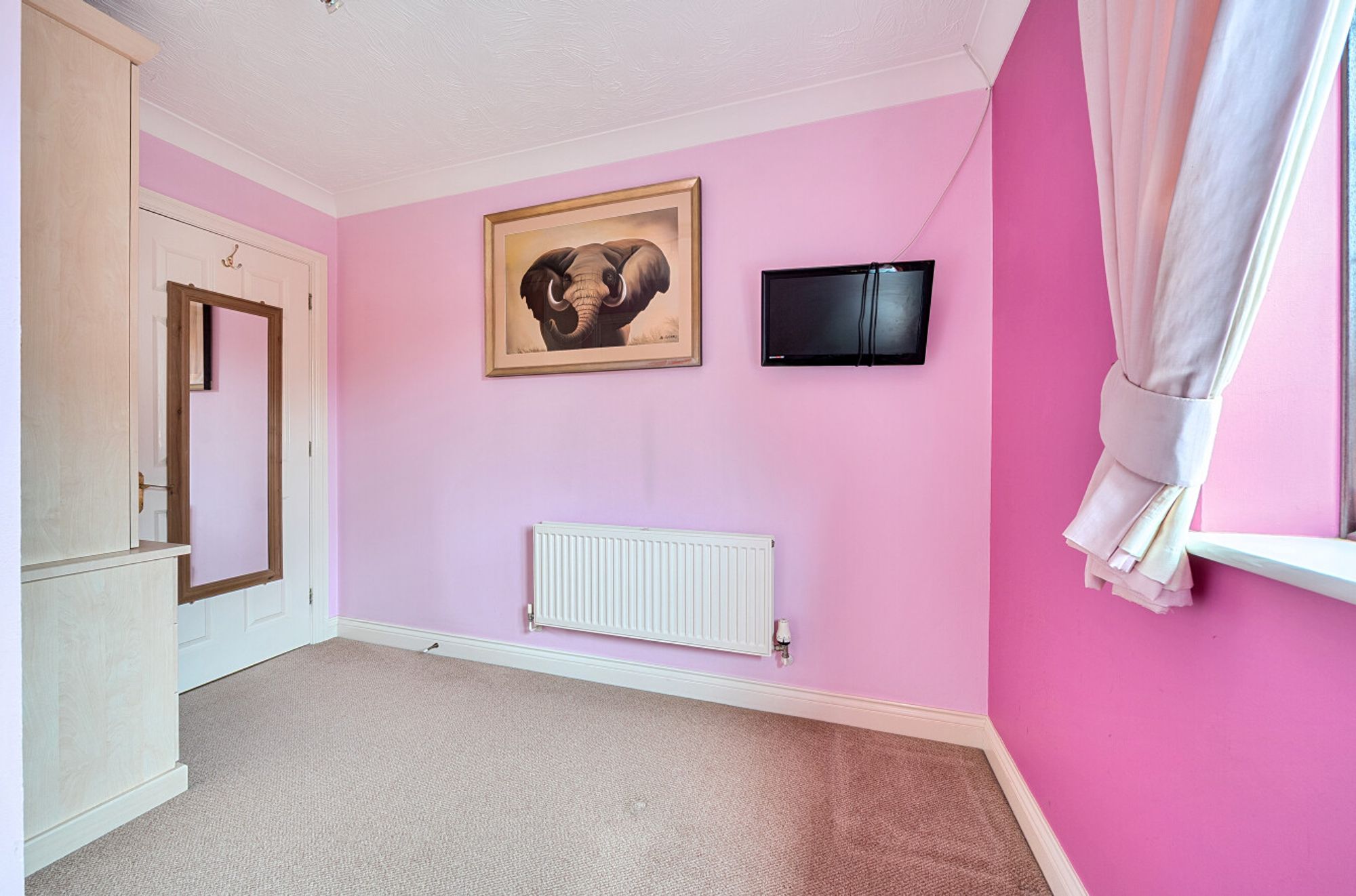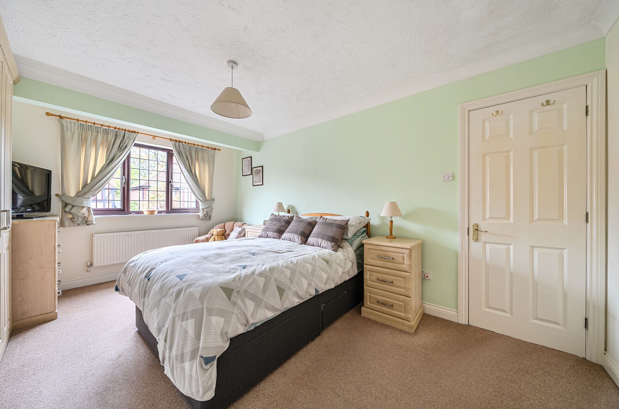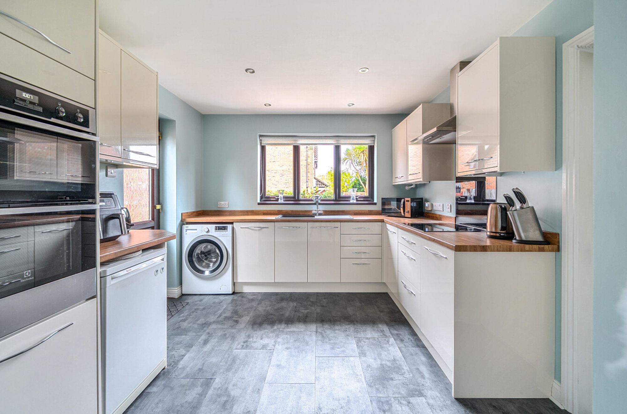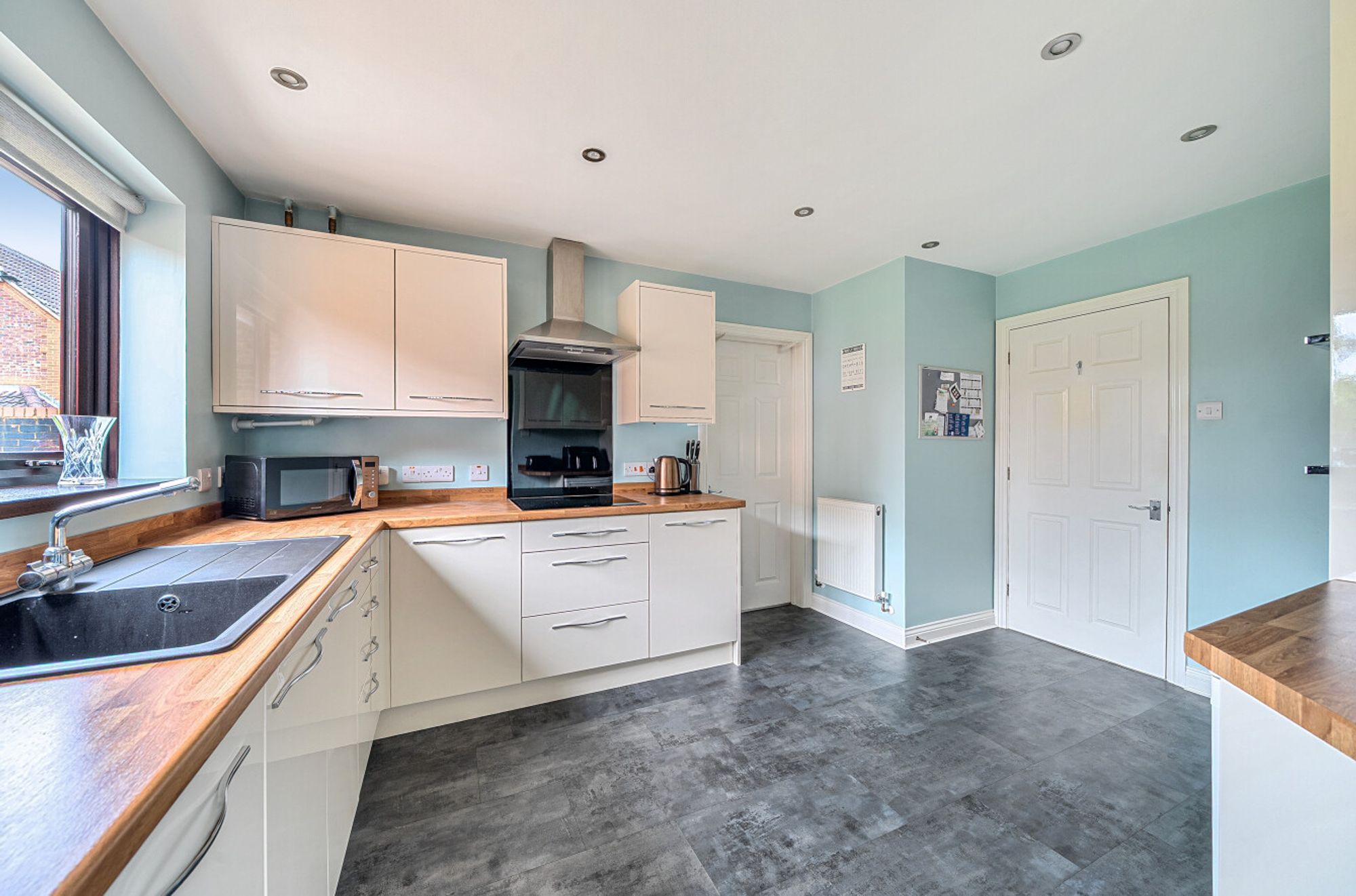 The modern fitted kitchen offers ample worktop and cupboard space, along with integrated appliances and a pleasant outlook over the garden. There is also convenient access to the side of the property and garage.