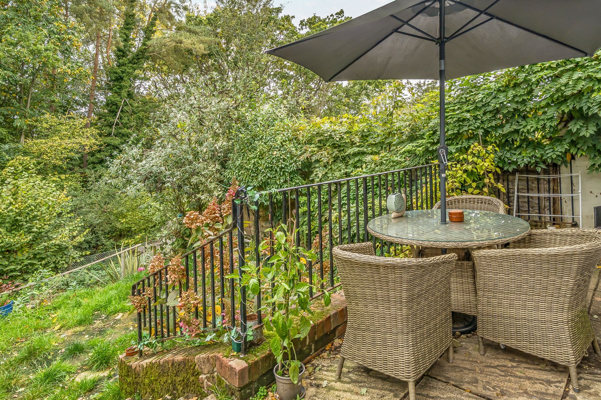 Outside, the private rear garden features a paved seating area leading down to a lawn with mature shrubs and woodland backdrop, perfect for outdoor dining and enjoying the sunshine. The property also benefits from a single garage in a nearby block, offering secure parking and additional storage.