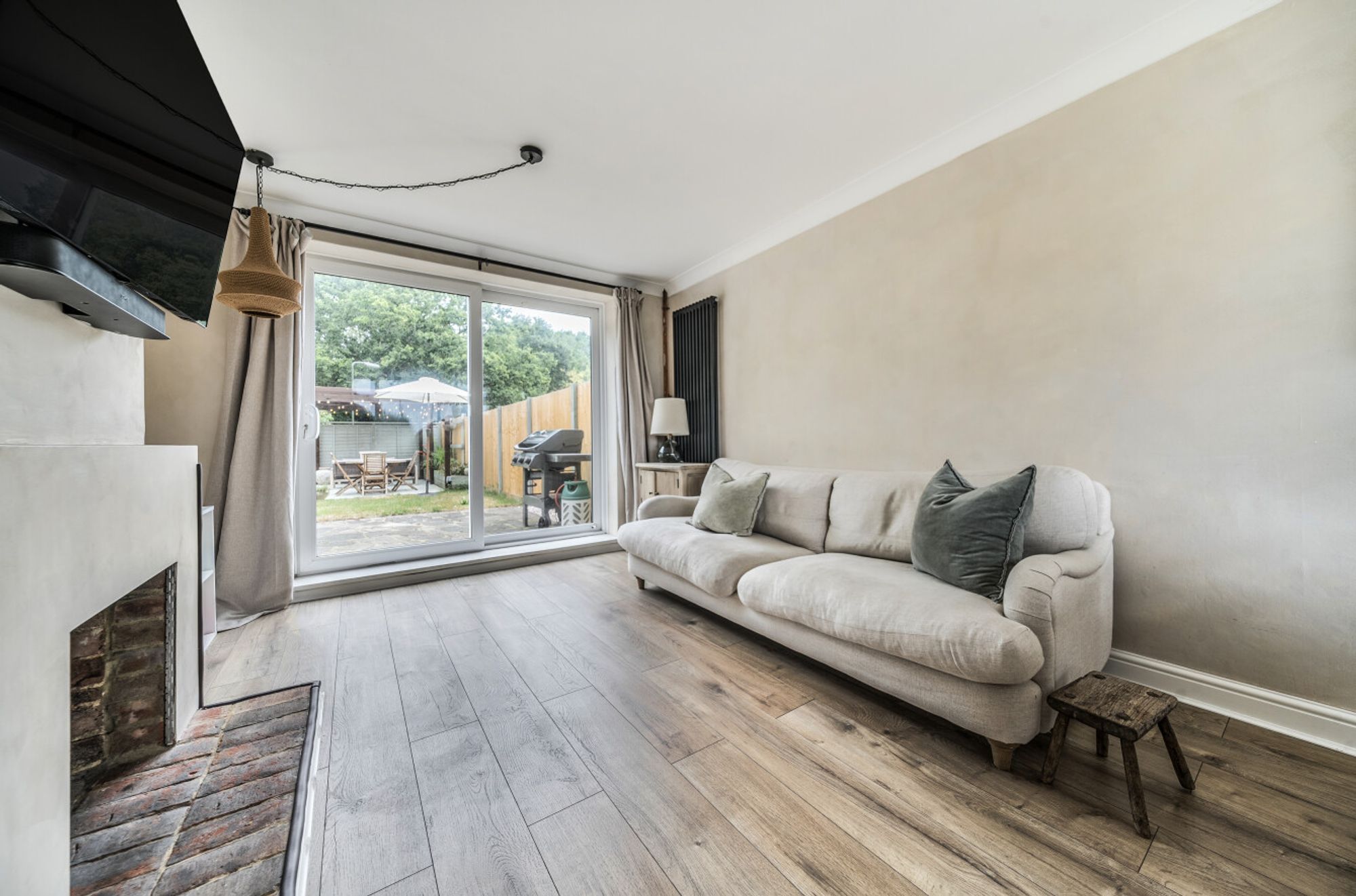 Inside, the home offers a welcoming entrance hall leading to a bright, dual aspect sitting room. This spacious living area features an open fireplace and sliding patio doors that open directly onto the rear garden, creating a seamless indoor-outdoor connection.
