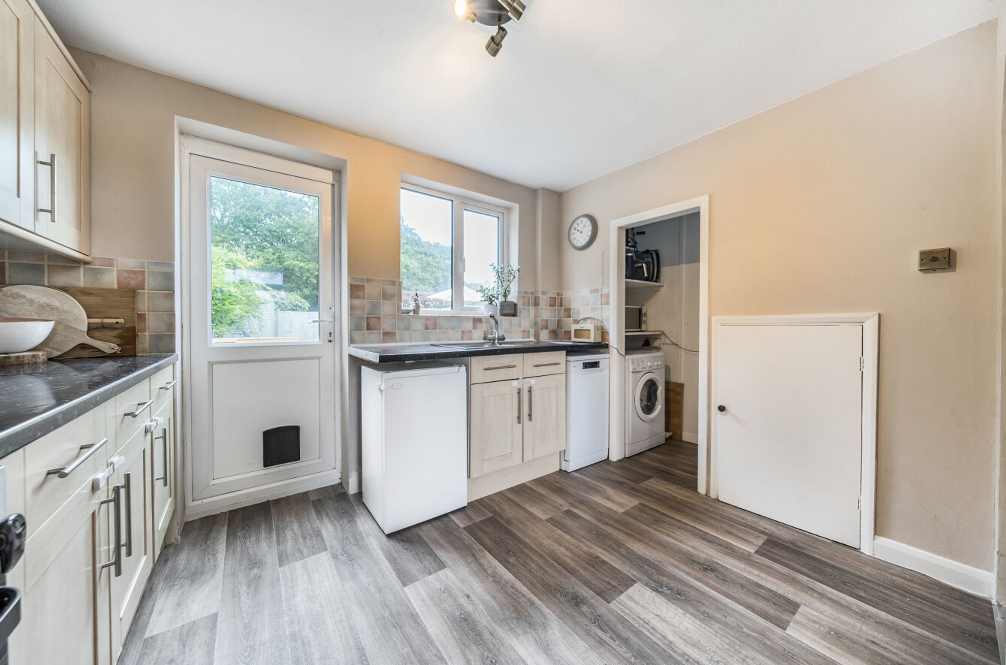 The classic Shaker-style kitchen is well-equipped with an electric oven, gas hob, and cooker hood. A handy utility cupboard provides plumbing for a washing machine, keeping the space neat and functional.