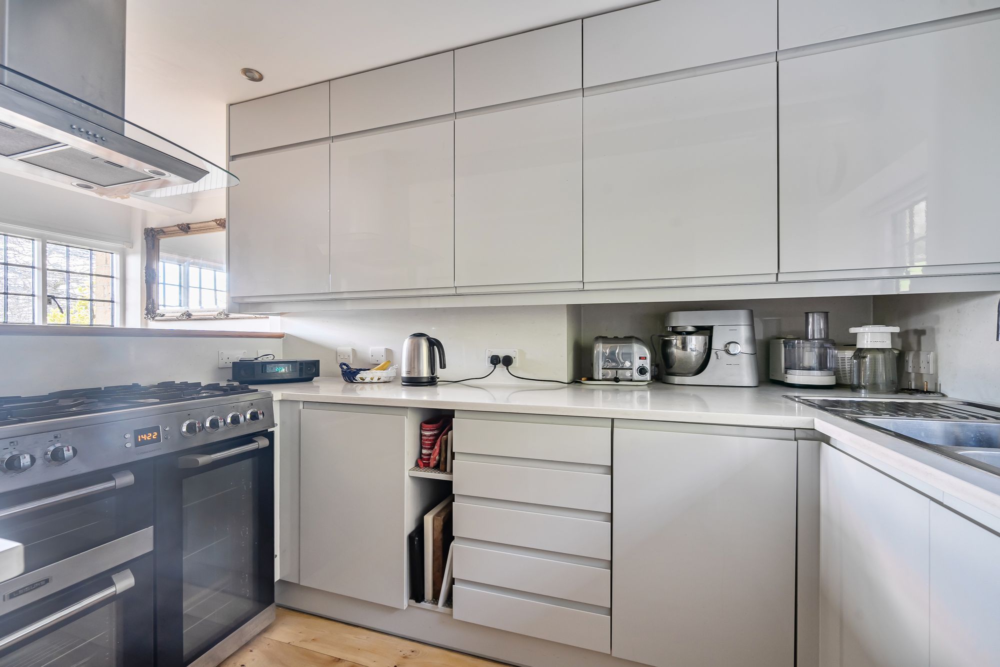 Adjoining the sitting room, a cosy snug provides an inviting retreat, complete with French elm flooring and its own charming log burner. This room also benefits from cleverly concealed storage.