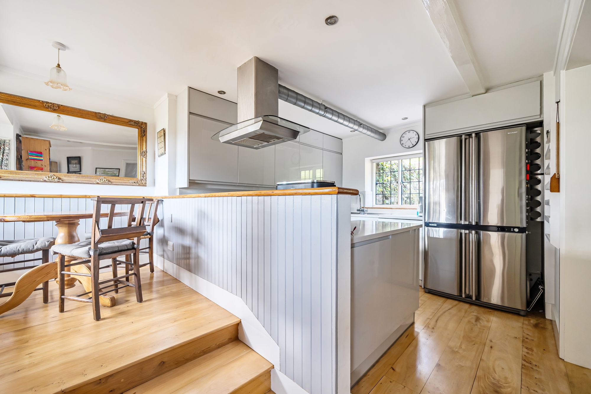 The adjacent ‘cooks’ kitchen is bright and well appointed, fitted with a comprehensive range of appliances including a dishwasher, American-style fridge freezer and a range-style cooker with a five-burner hob. A raised dining area offers an ideal setting for informal meals, once again making the most of the beautiful outlook. French elm flooring continues throughout this level, and a conveniently located cloakroom completes the ground floor accommodation.