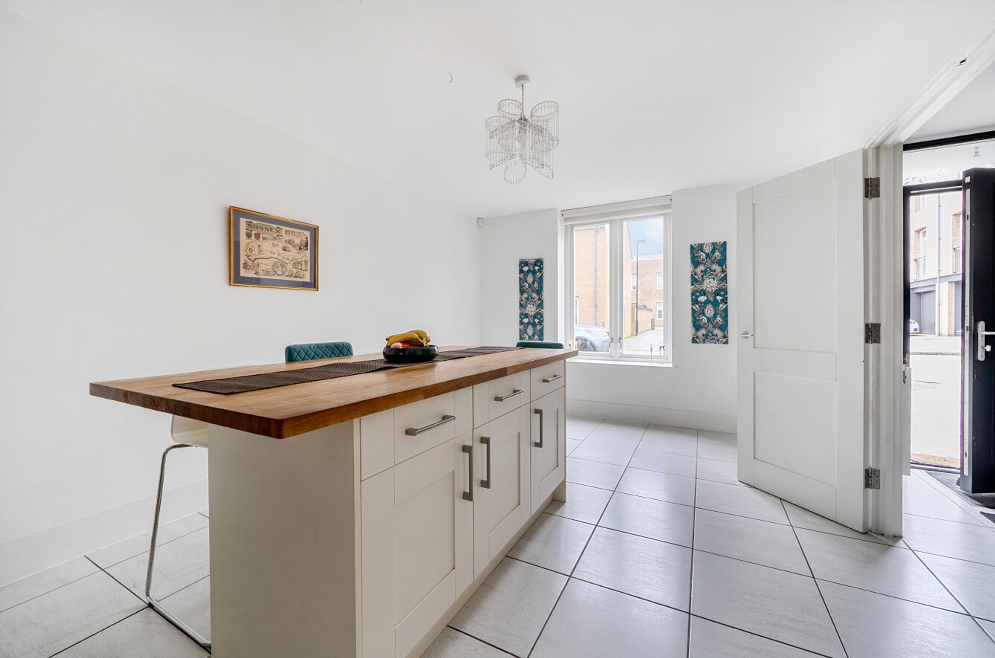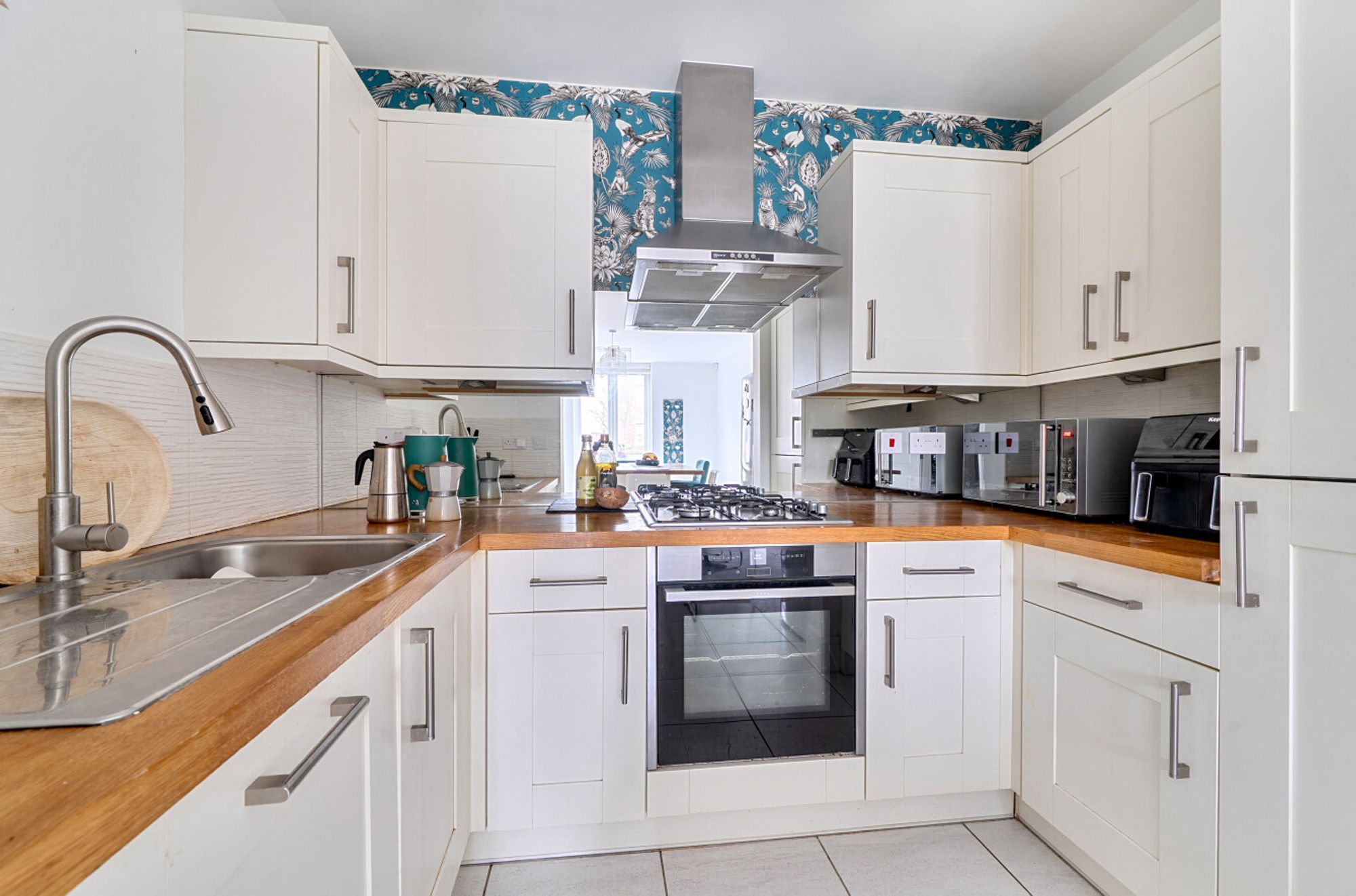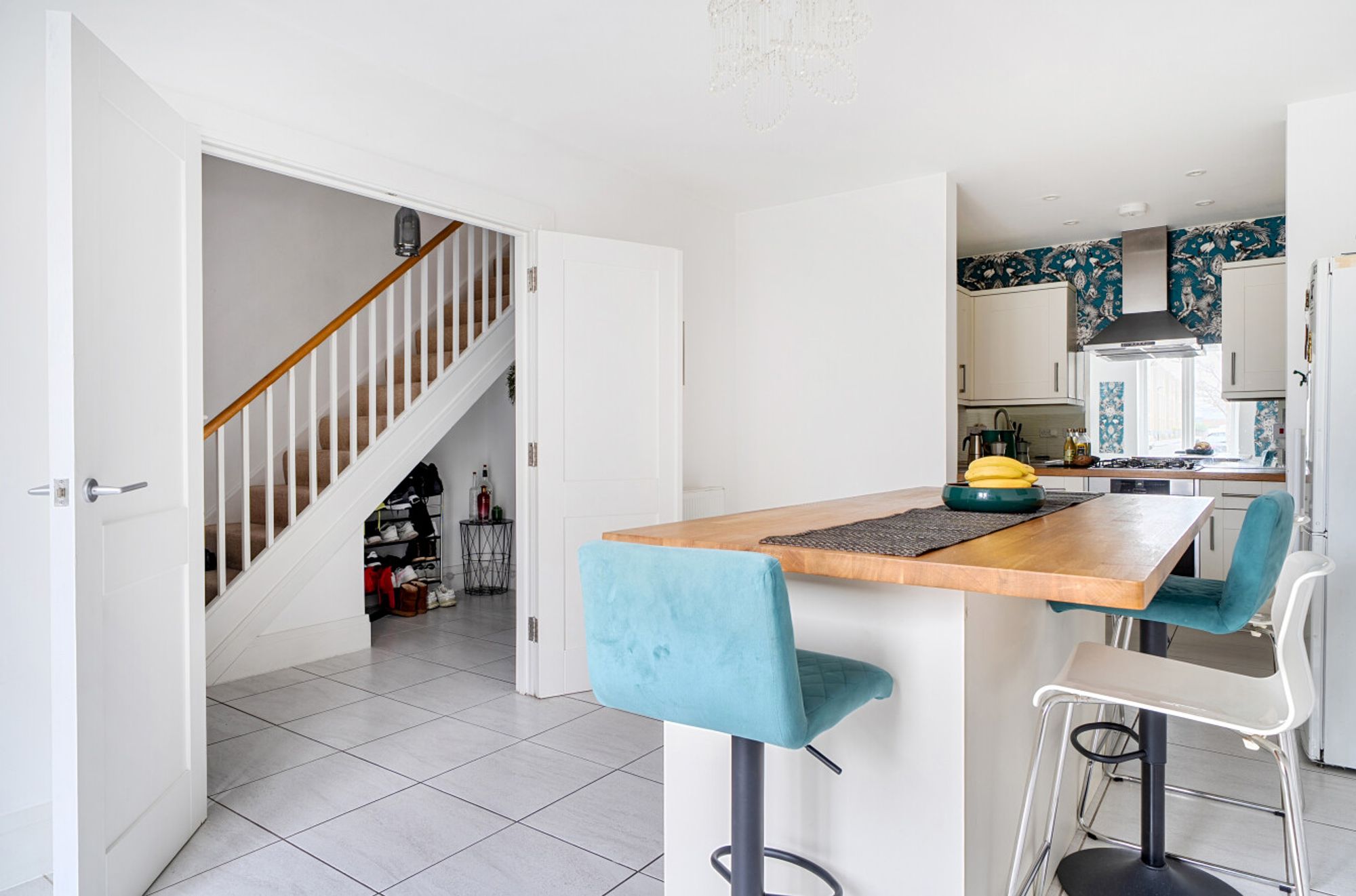 The home benefits from its own private entrance, leading into a spacious entrance hall and through to the open-plan kitchen and dining area. The sleek, modern kitchen includes integrated appliances such as a fan oven, gas hob, cooker hood, dishwasher, fridge and freezer. A central island unit defines the dining space, which also offers room for a relaxed seating area by the window. A separate utility room and ground floor cloakroom add to the property’s practicality. Upstairs, the generous dual-aspect sitting room features a useful recessed area, perfect for a home office setup. The first floor also offers three well-proportioned double bedrooms and a stylish, contemporary family bathroom. Two of the bedrooms have built-in double wardrobes, whilst there is a further double wardrobe in the hall servicing bedroom three along with a linen cupboard.