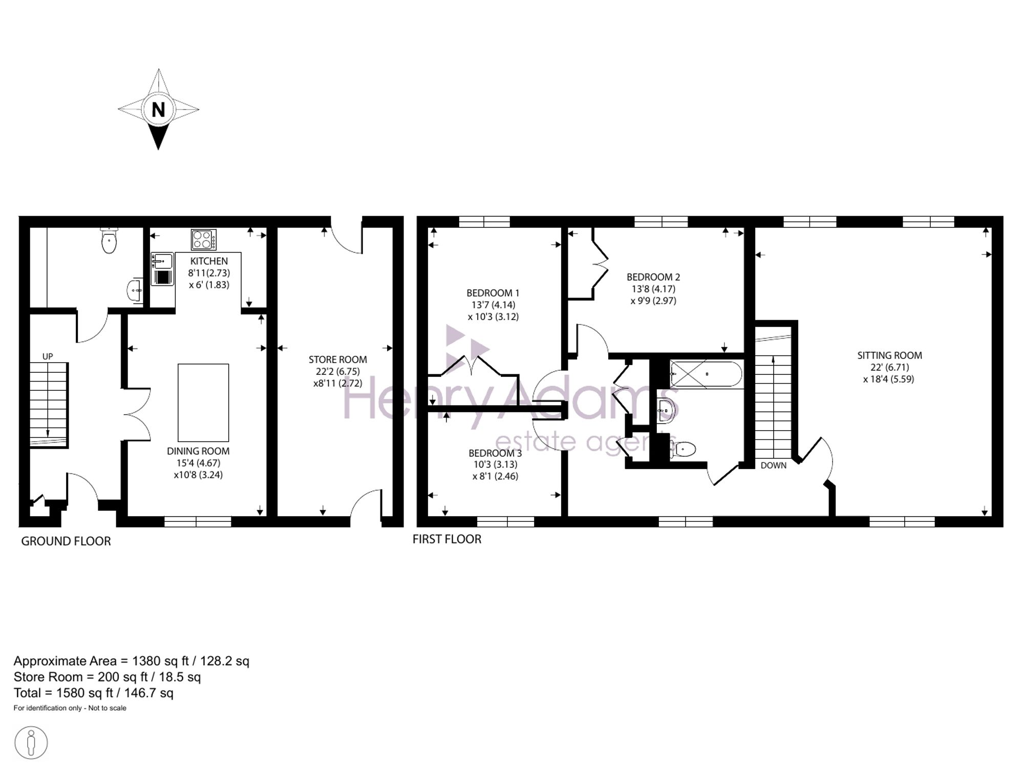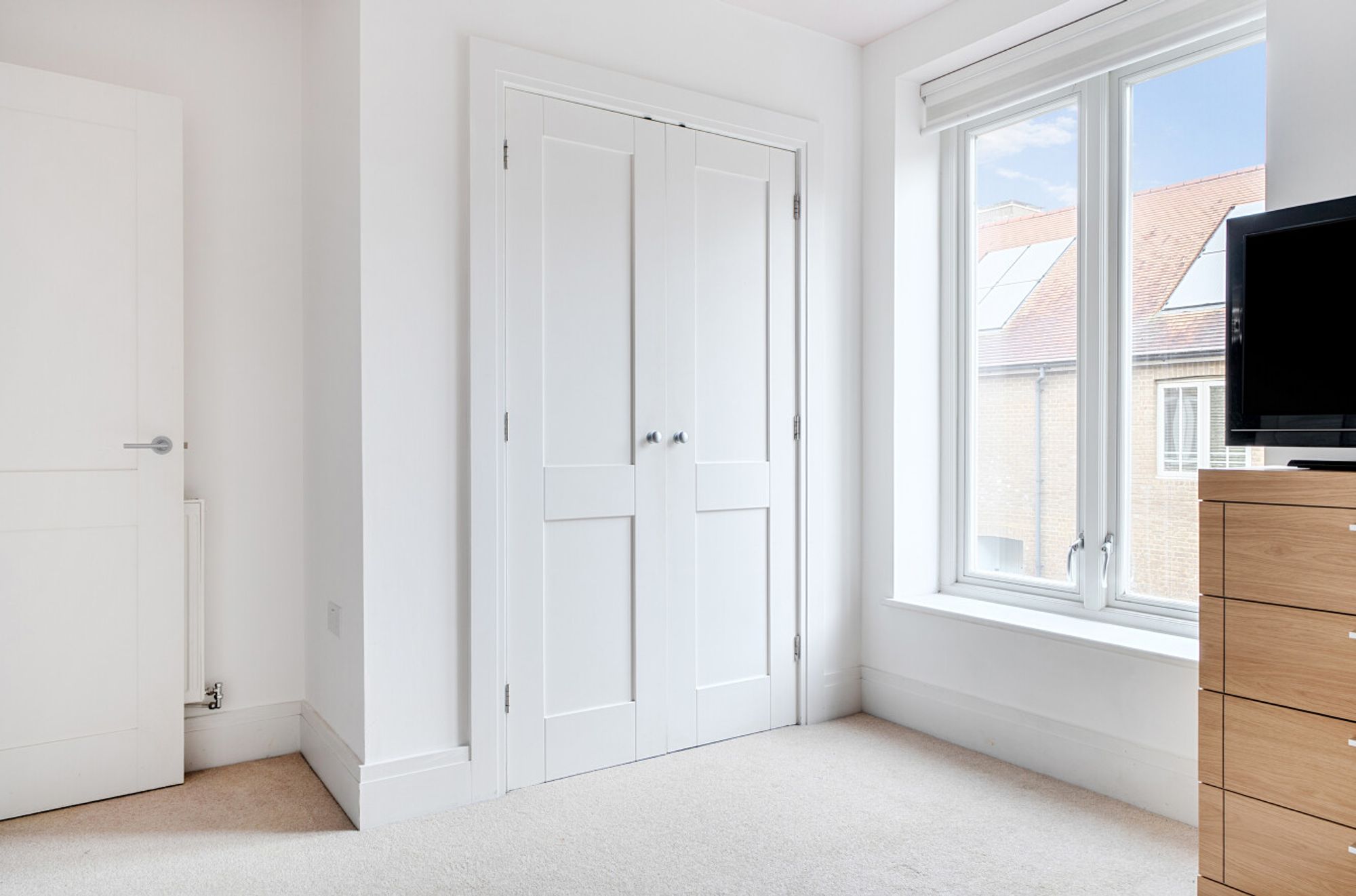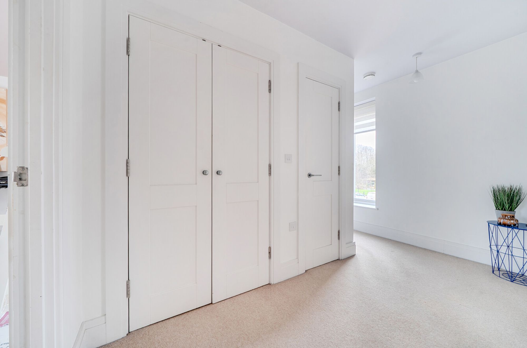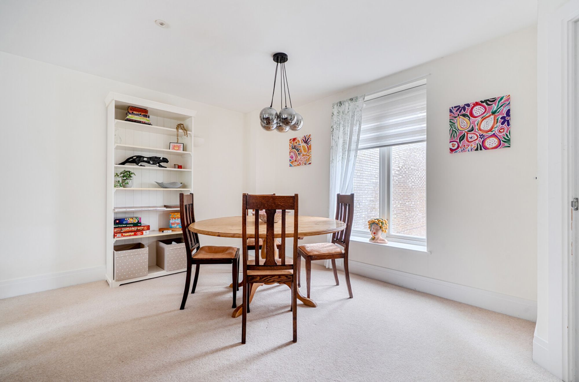 The home benefits from its own private entrance, leading into a spacious entrance hall and through to the open-plan kitchen and dining area. The sleek, modern kitchen includes integrated appliances such as a fan oven, gas hob, cooker hood, dishwasher, fridge and freezer. A central island unit defines the dining space, which also offers room for a relaxed seating area by the window. A separate utility room and ground floor cloakroom add to the property’s practicality. Upstairs, the generous dual-aspect sitting room features a useful recessed area, perfect for a home office setup. The first floor also offers three well-proportioned double bedrooms and a stylish, contemporary family bathroom. Two of the bedrooms have built-in double wardrobes, whilst there is a further double wardrobe in the hall servicing bedroom three along with a linen cupboard.