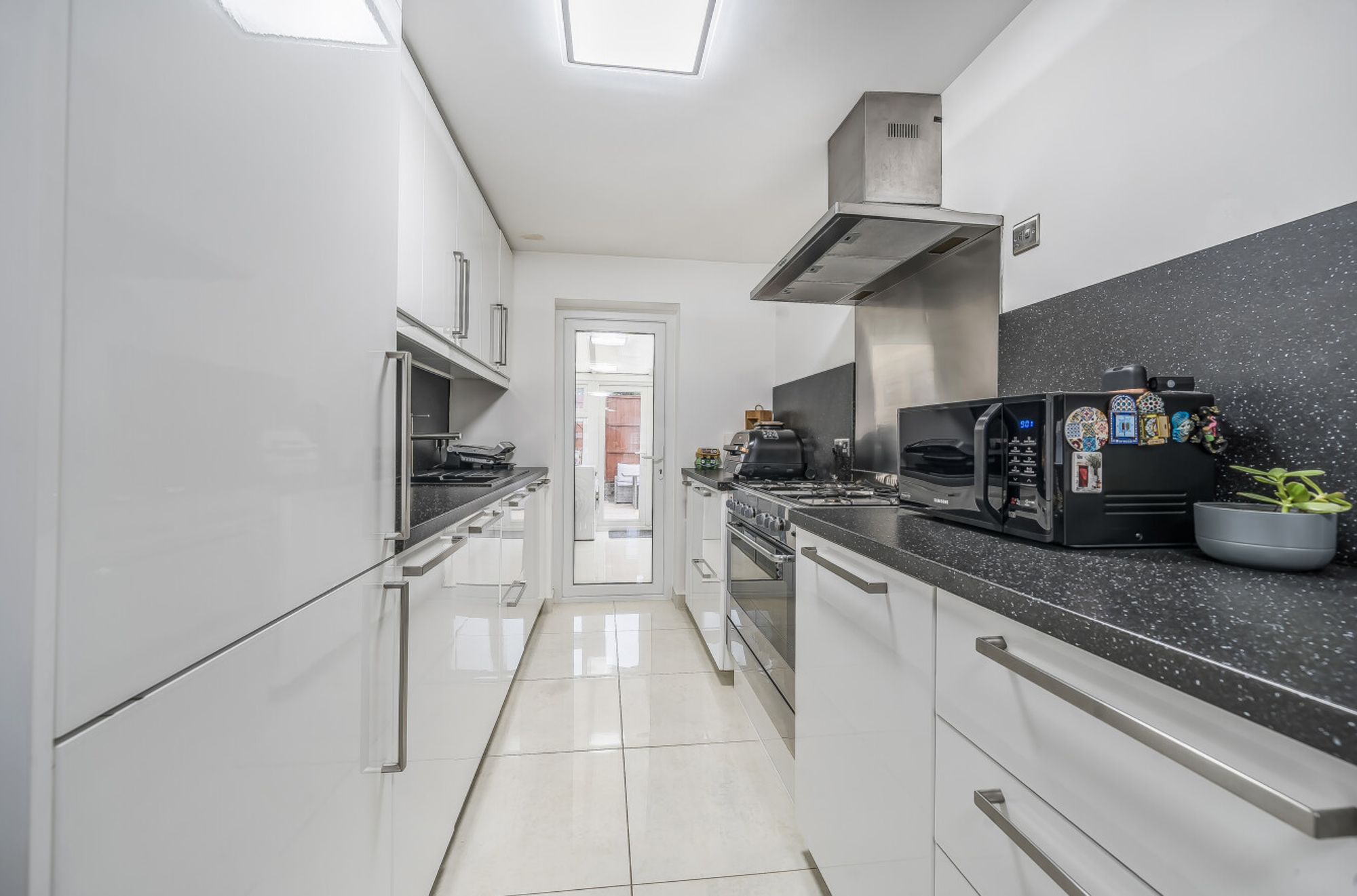 The front door opens onto a small lobby which in turn opens to the large reception room with stone tiled floors with a stylish gloss white open plan kitchen with range of wall and base units. From this a door opens onto the large conservatory which in turn has French doors opening to the garden. Altogether, this gives a great living space.