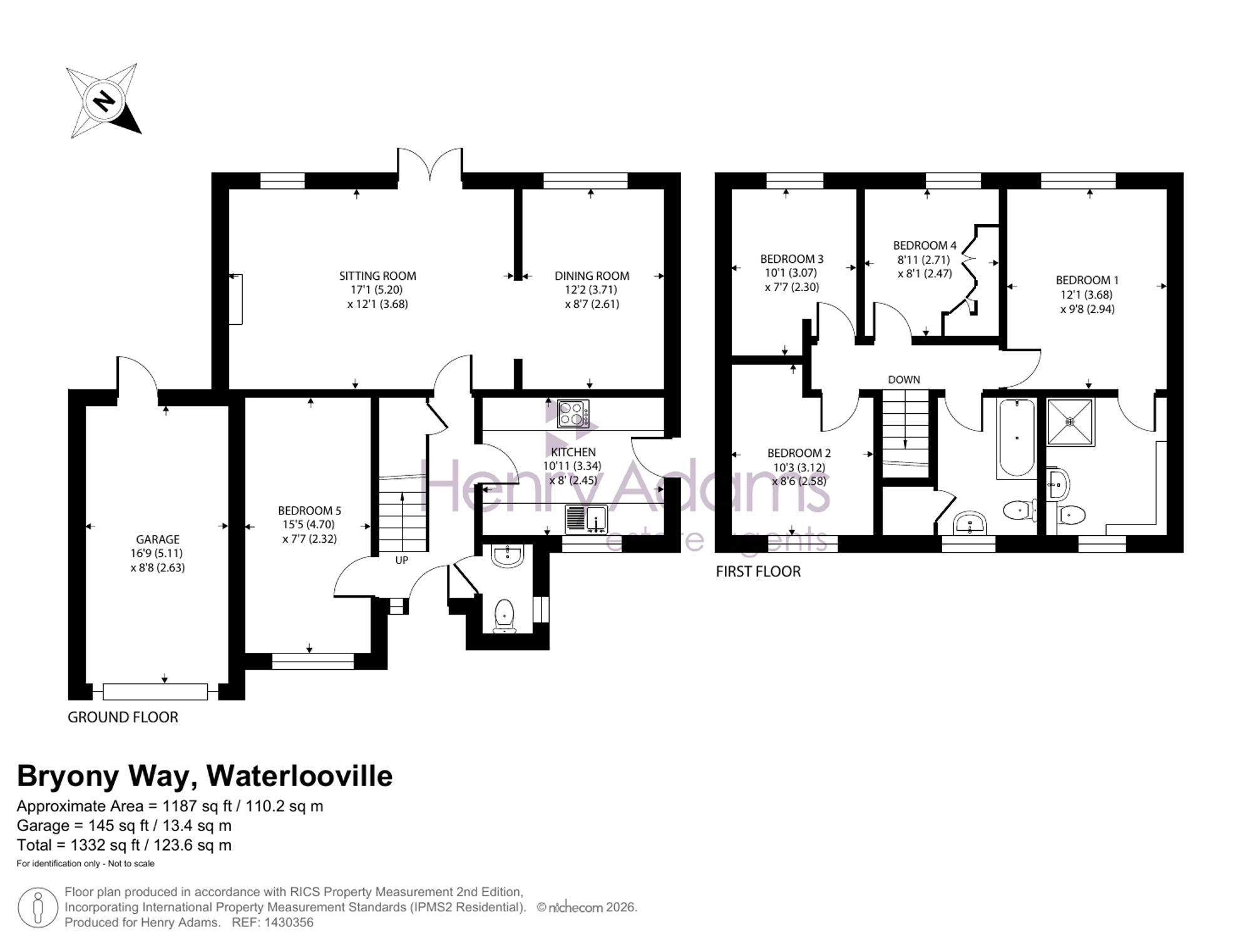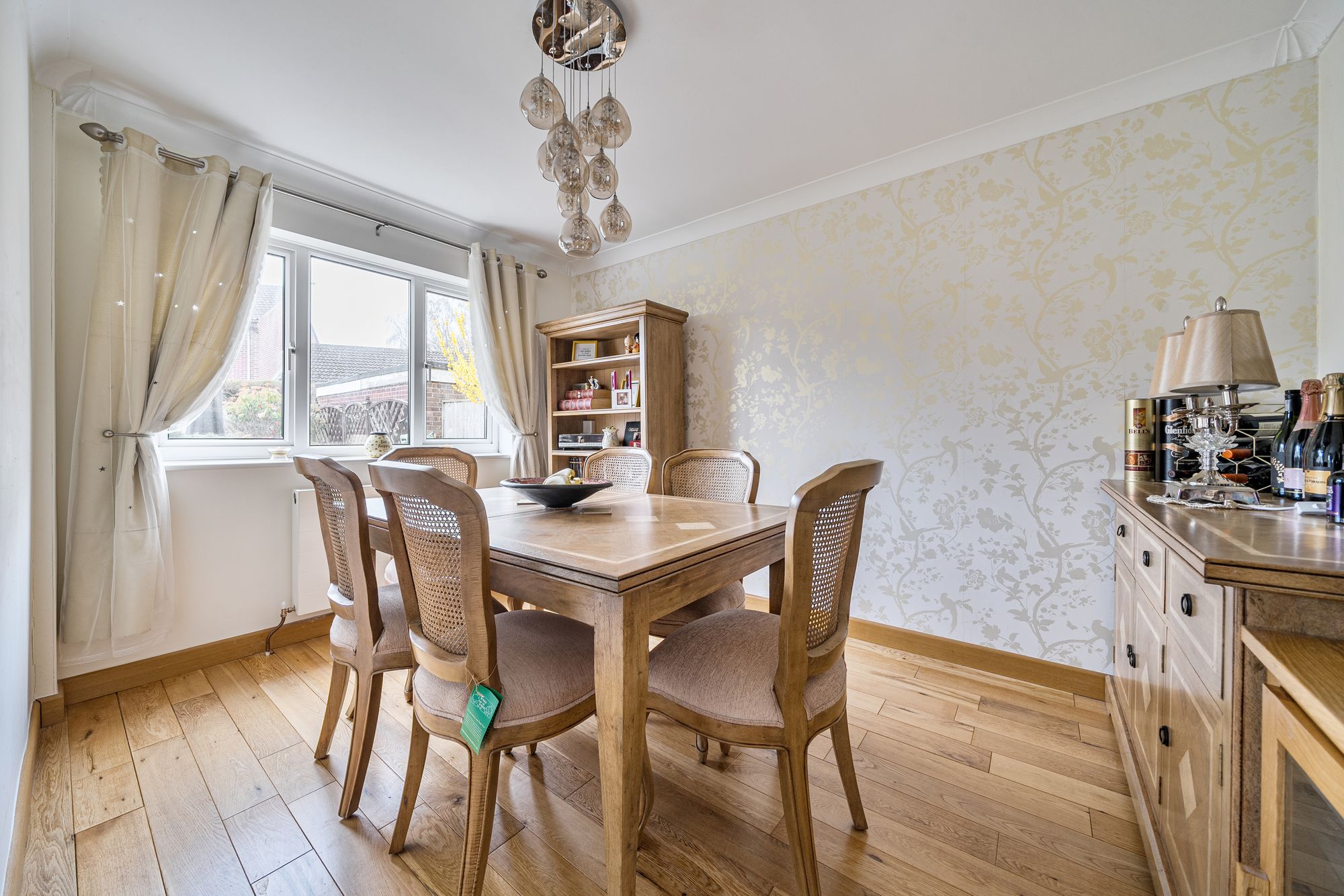 Inside, the property opens into a welcoming entrance hall. To the rear, there is a good-sized living room and separate dining area, both overlooking the garden. The kitchen is fitted with a range of base and wall units with an integrated oven and hob. Bedroom five is located on the ground floor at the front of the property, offering flexibility as a study or guest room, with a guest WC completing this level.