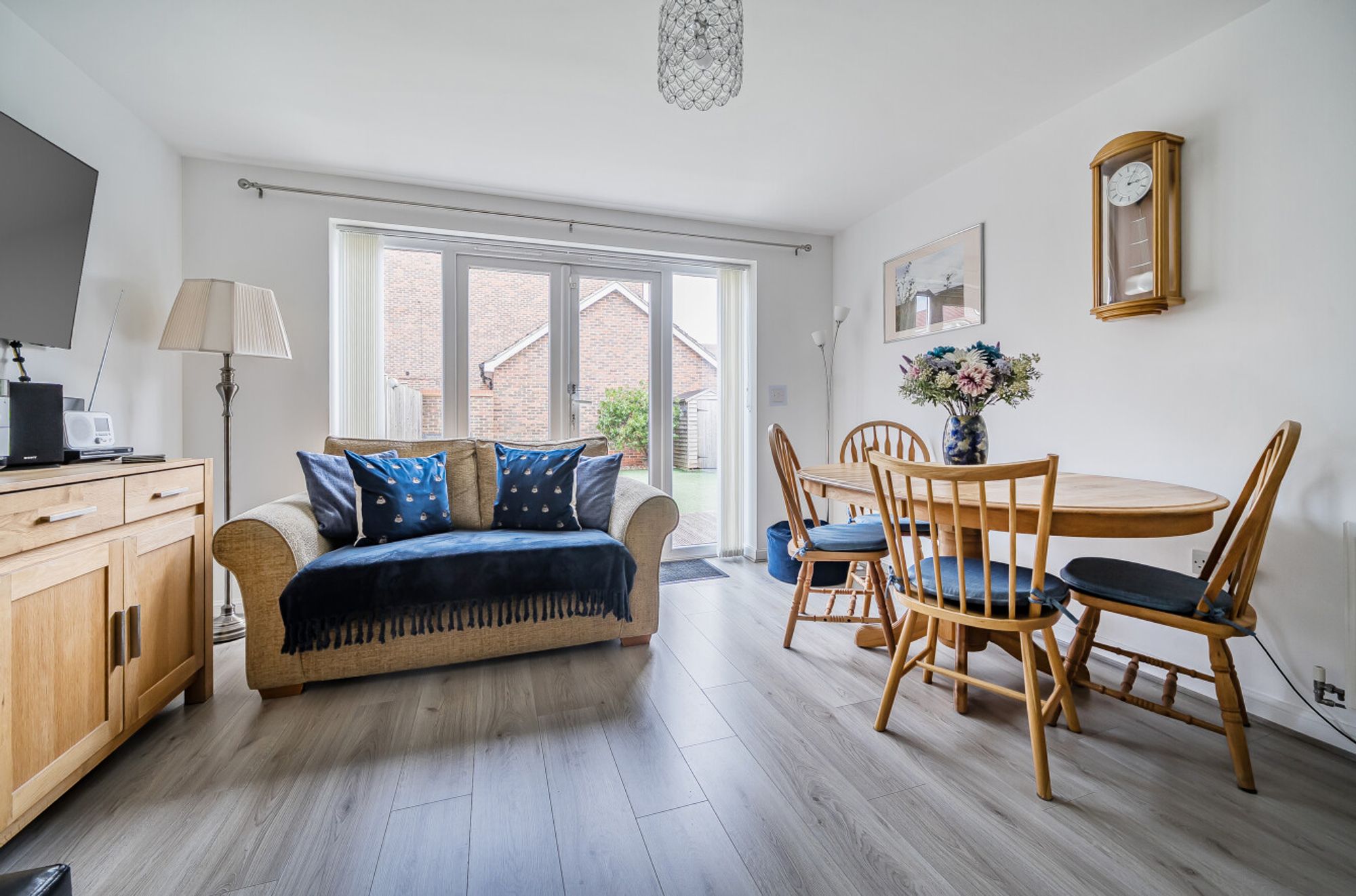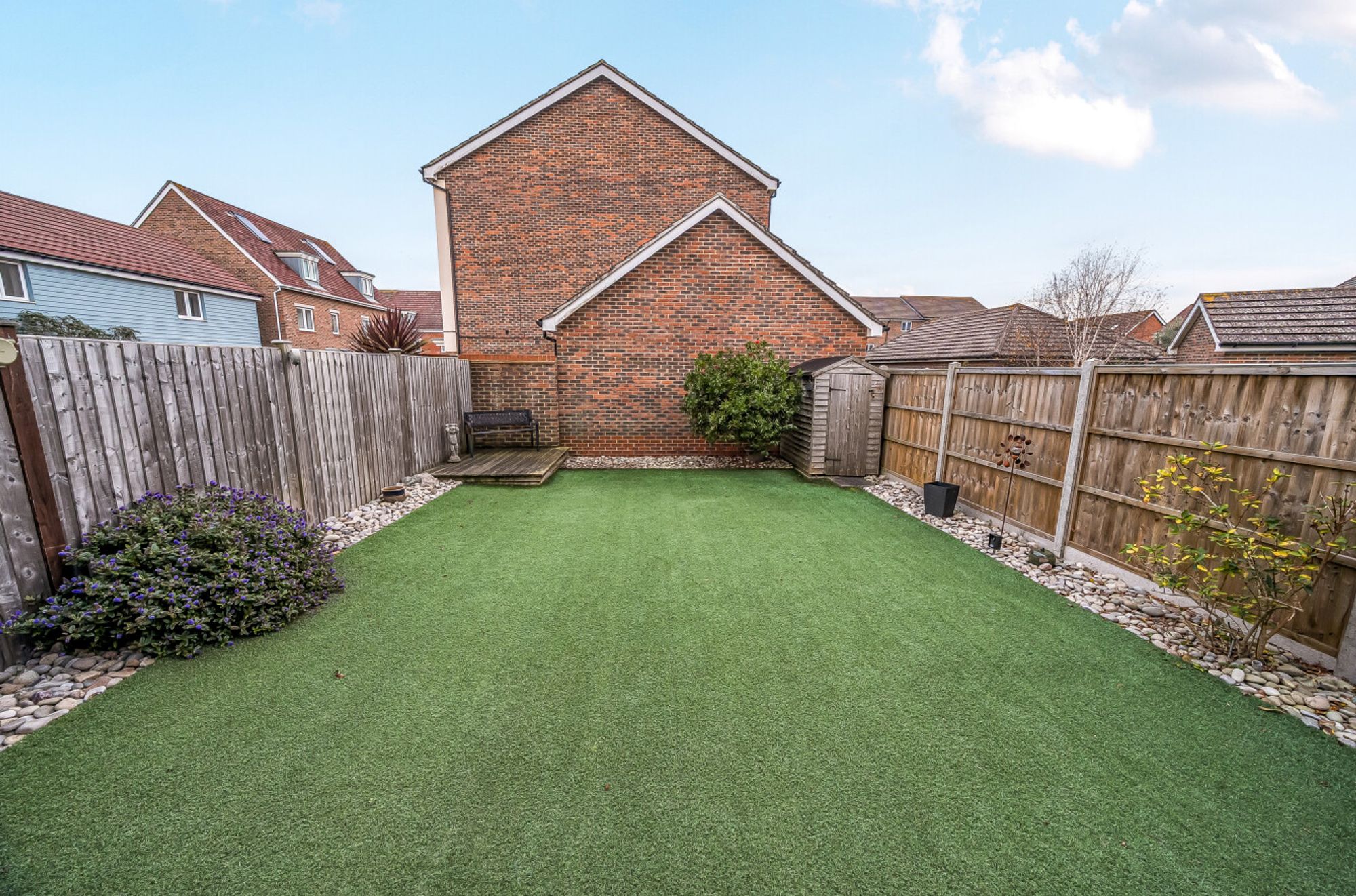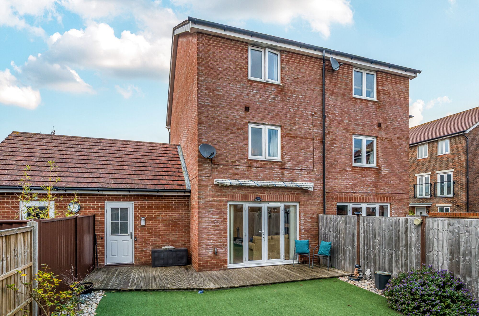 To the front of the property is a driveway providing off-road parking for two cars and a garage. As mentioned previously, the low maintenance garden is of a southerly aspect, mainly laid to artificial grass with an area of decking and borders.