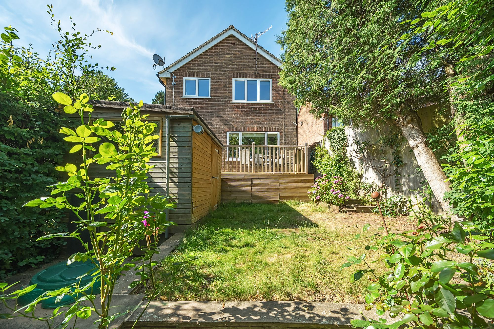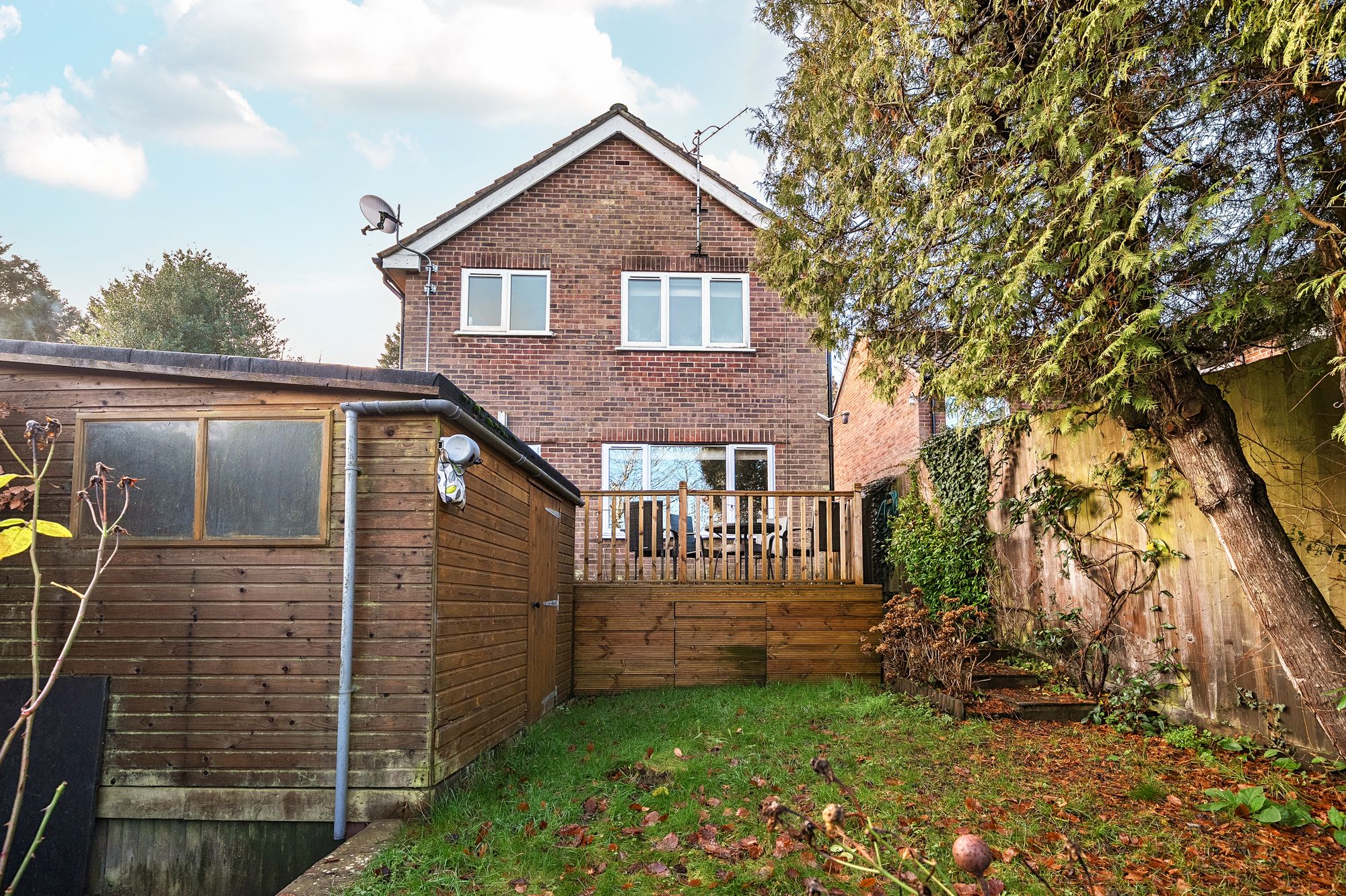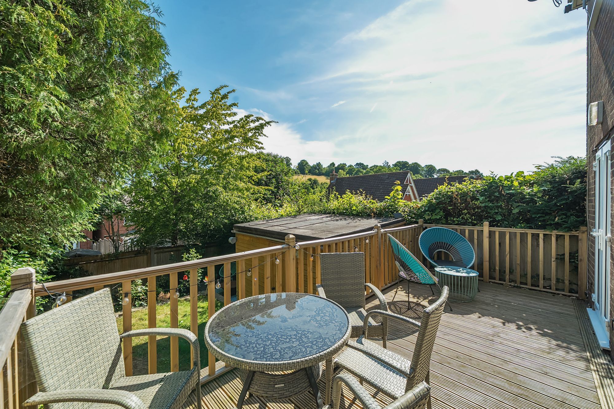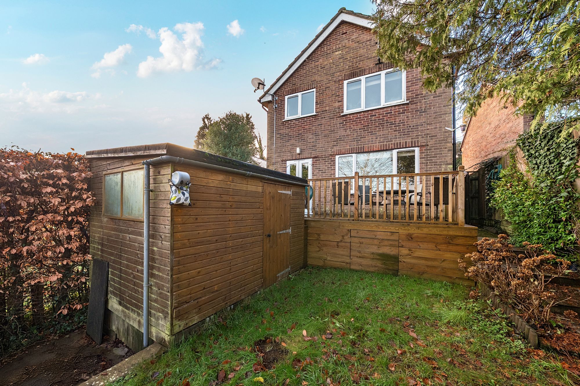French doors from the sitting room open onto a raised decked terrace. Beyond lies a well-maintained garden featuring a lawn, mature shrubs, and a large shed providing additional storage.