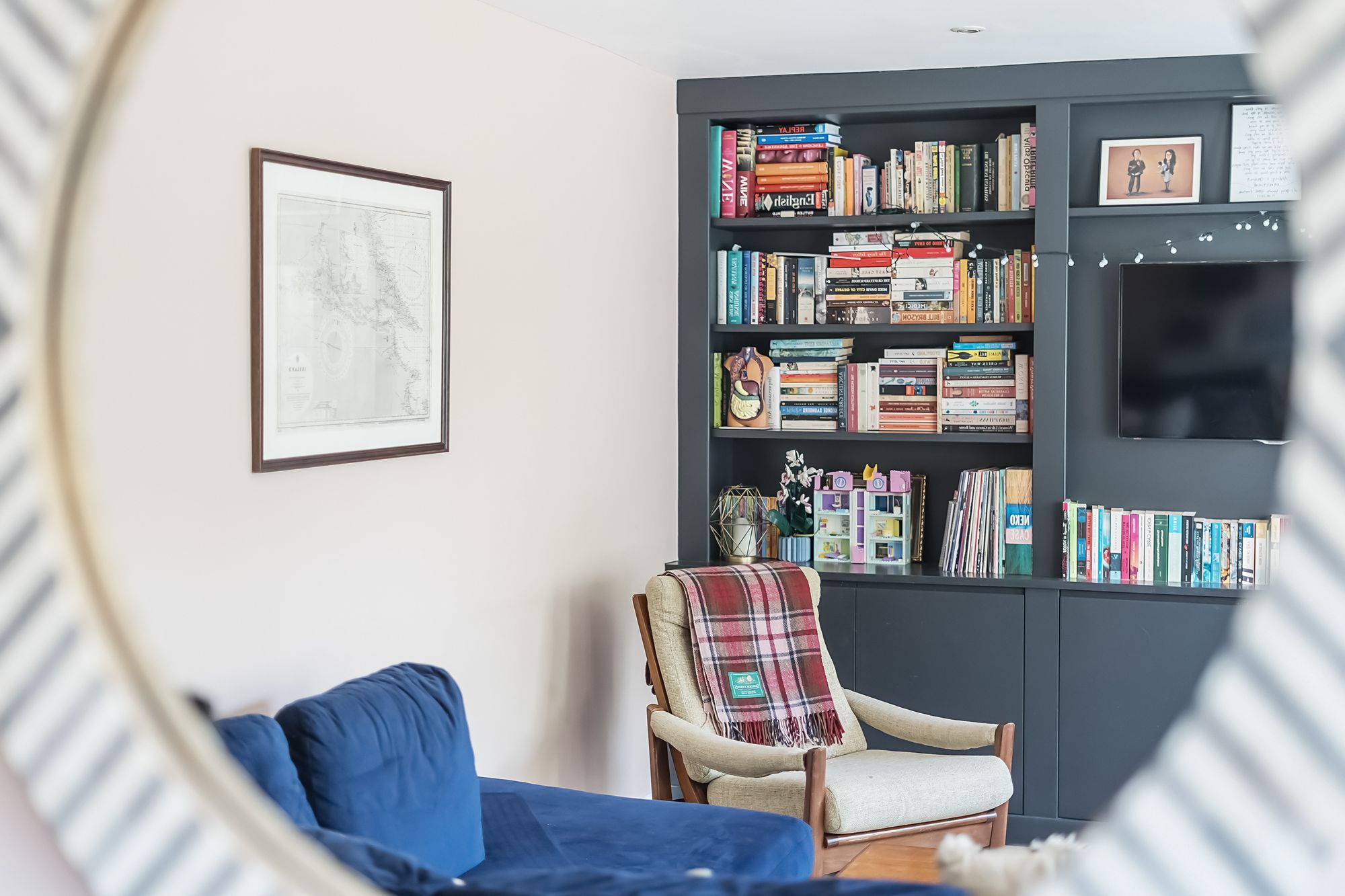 To the rear of the property, is the sitting room with bespoke full width media wall, incorporating bookshelves, storage and space for a television.