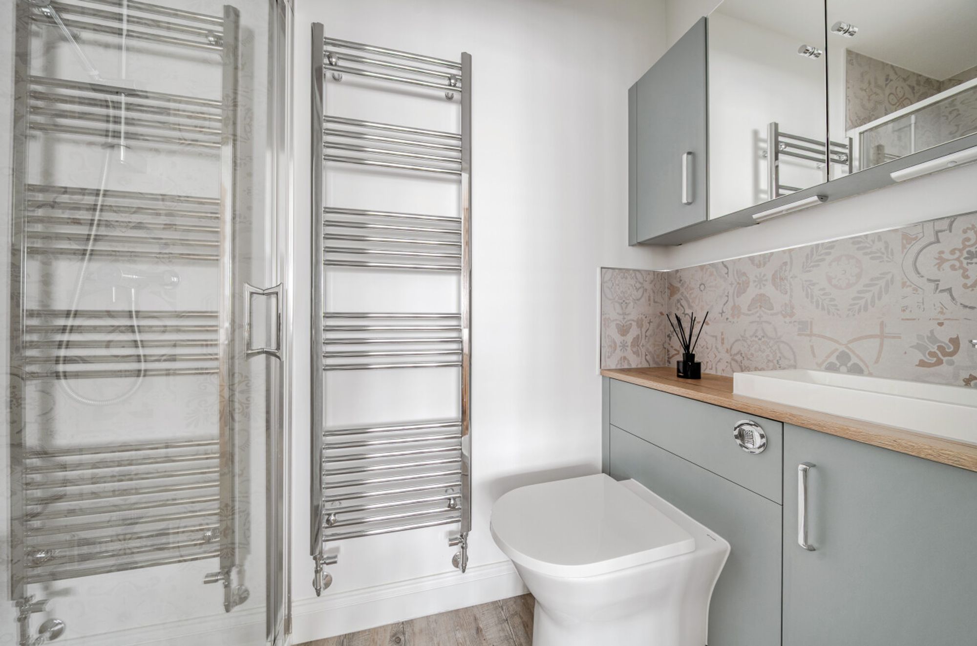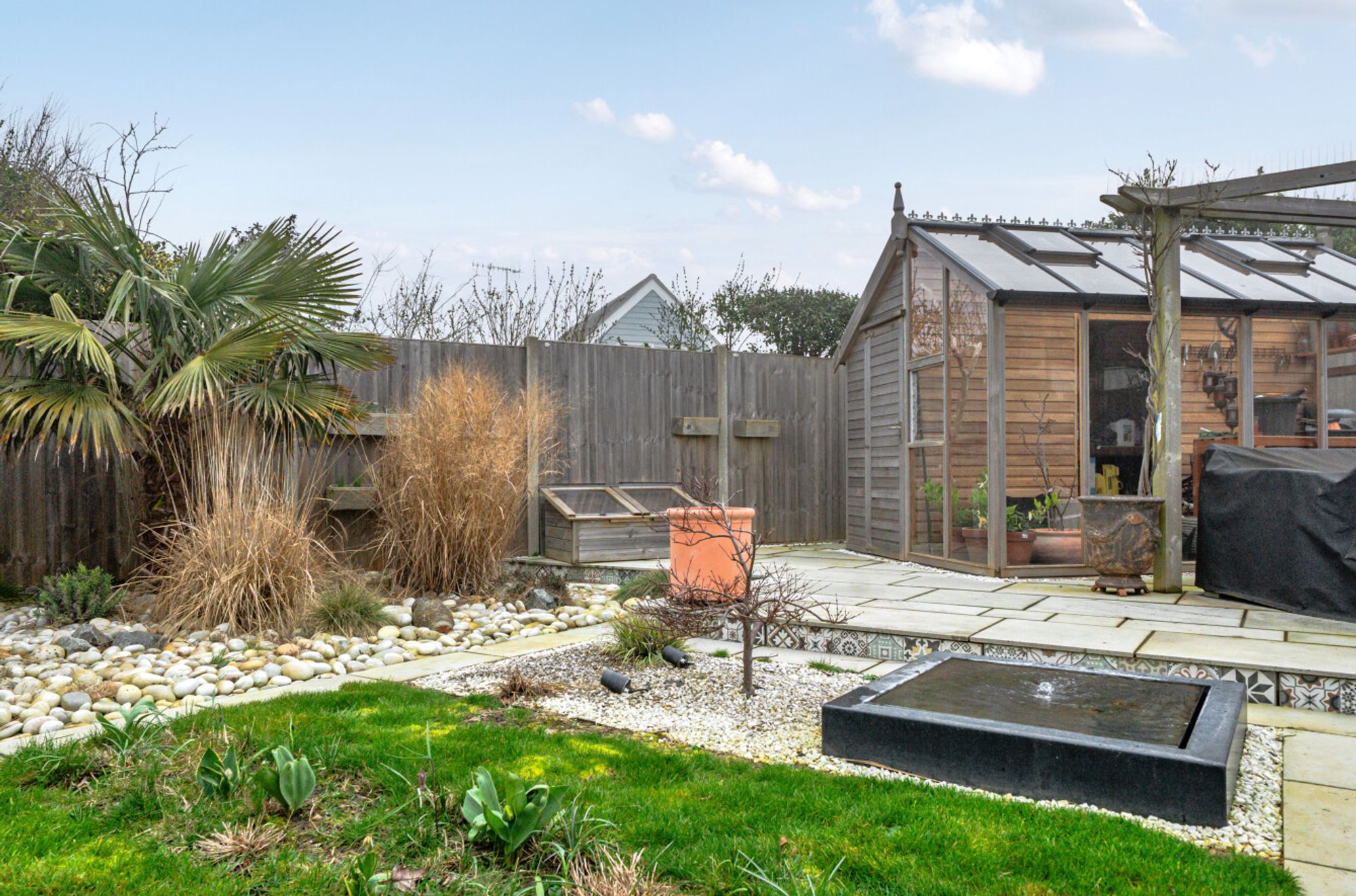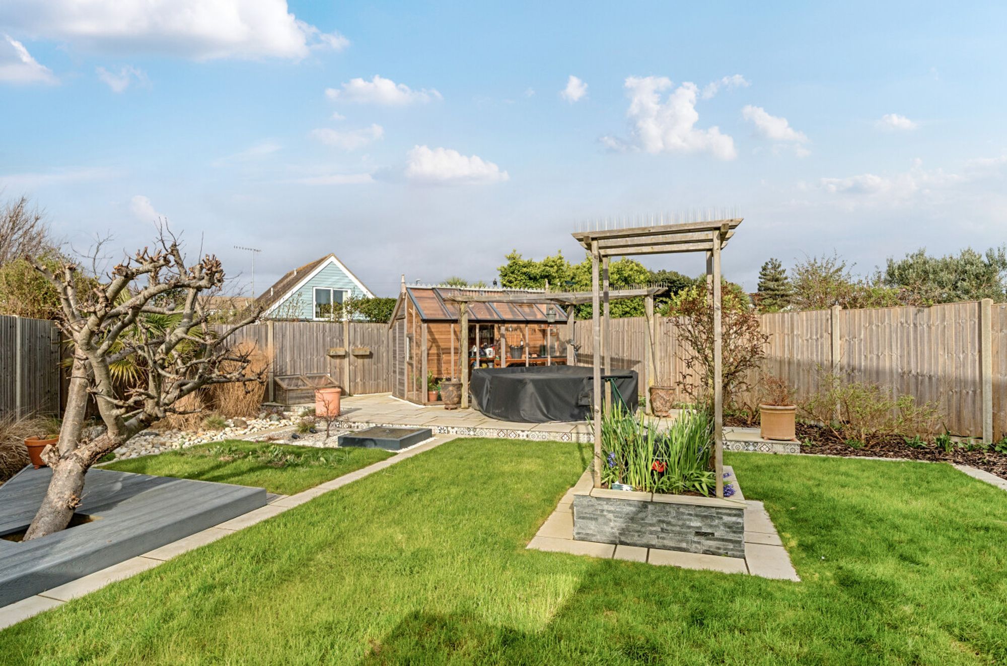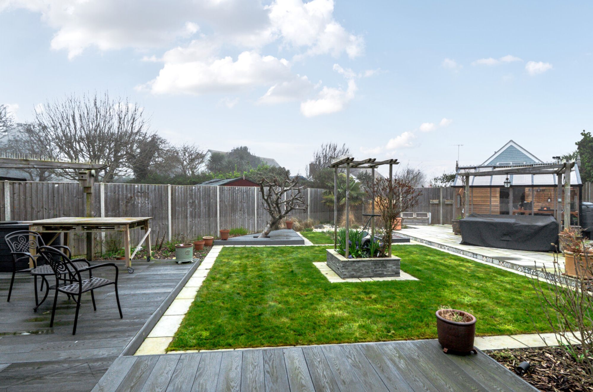 Outside, a driveway provides off-road parking and leads to a garage, which also benefits from an internal door through to the orangery for added convenience. The rear garden has been thoughtfully landscaped and includes areas of lawn, decked seating areas and a patio, ideal for outdoor dining. A further highlight is the cedar and timber greenhouse at the far end of the garden, perfect for keen gardening enthusiasts.