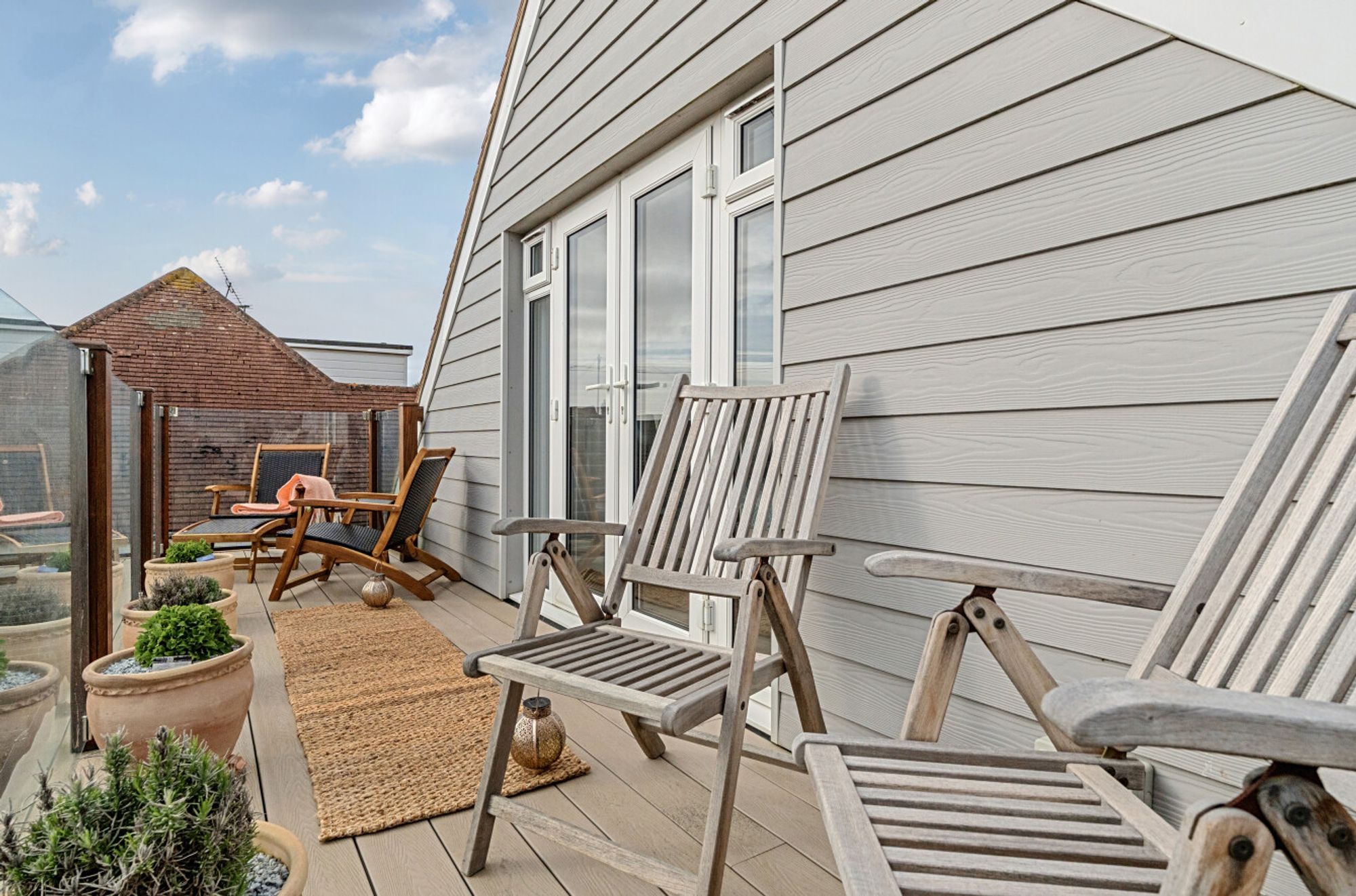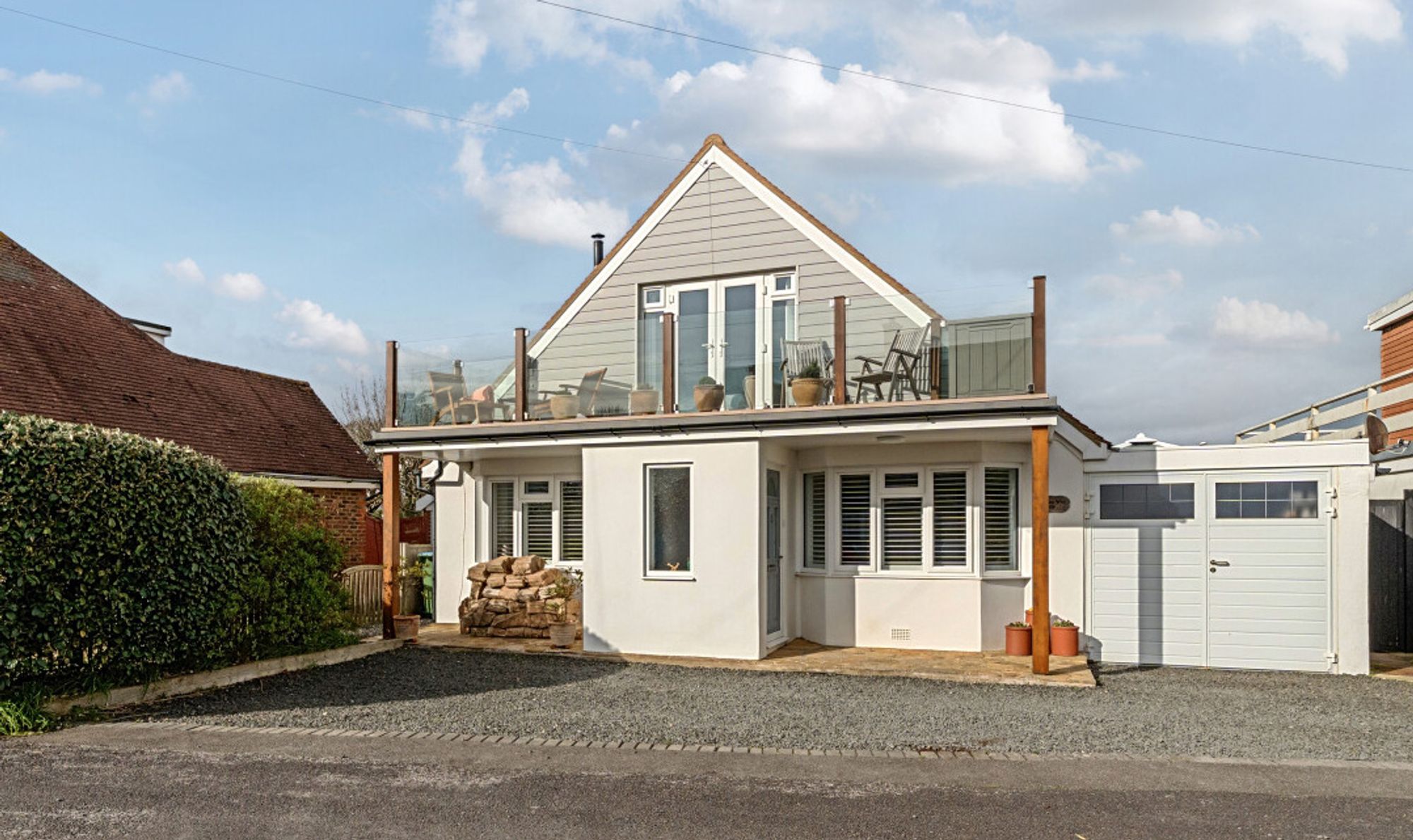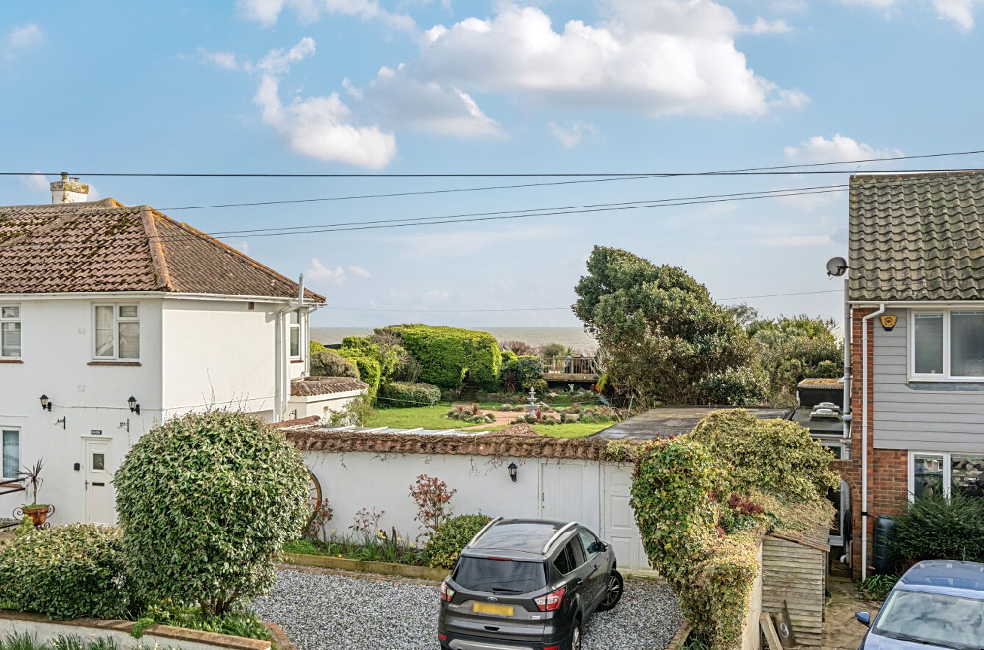 Upstairs, there are two further bedrooms, both offering ample eaves storage and served by the family bathroom. Bedroom two enjoys a southerly aspect and features a balcony with views of the sea between the front-row houses.
