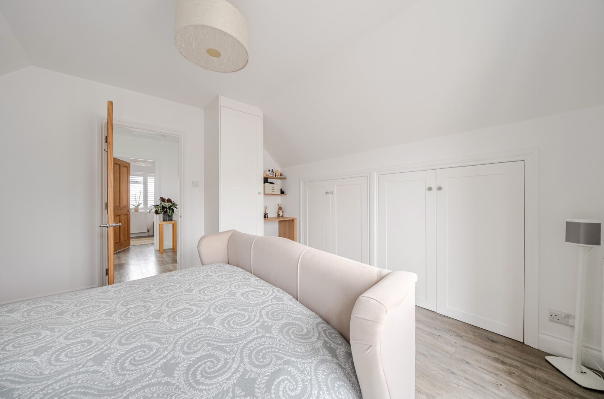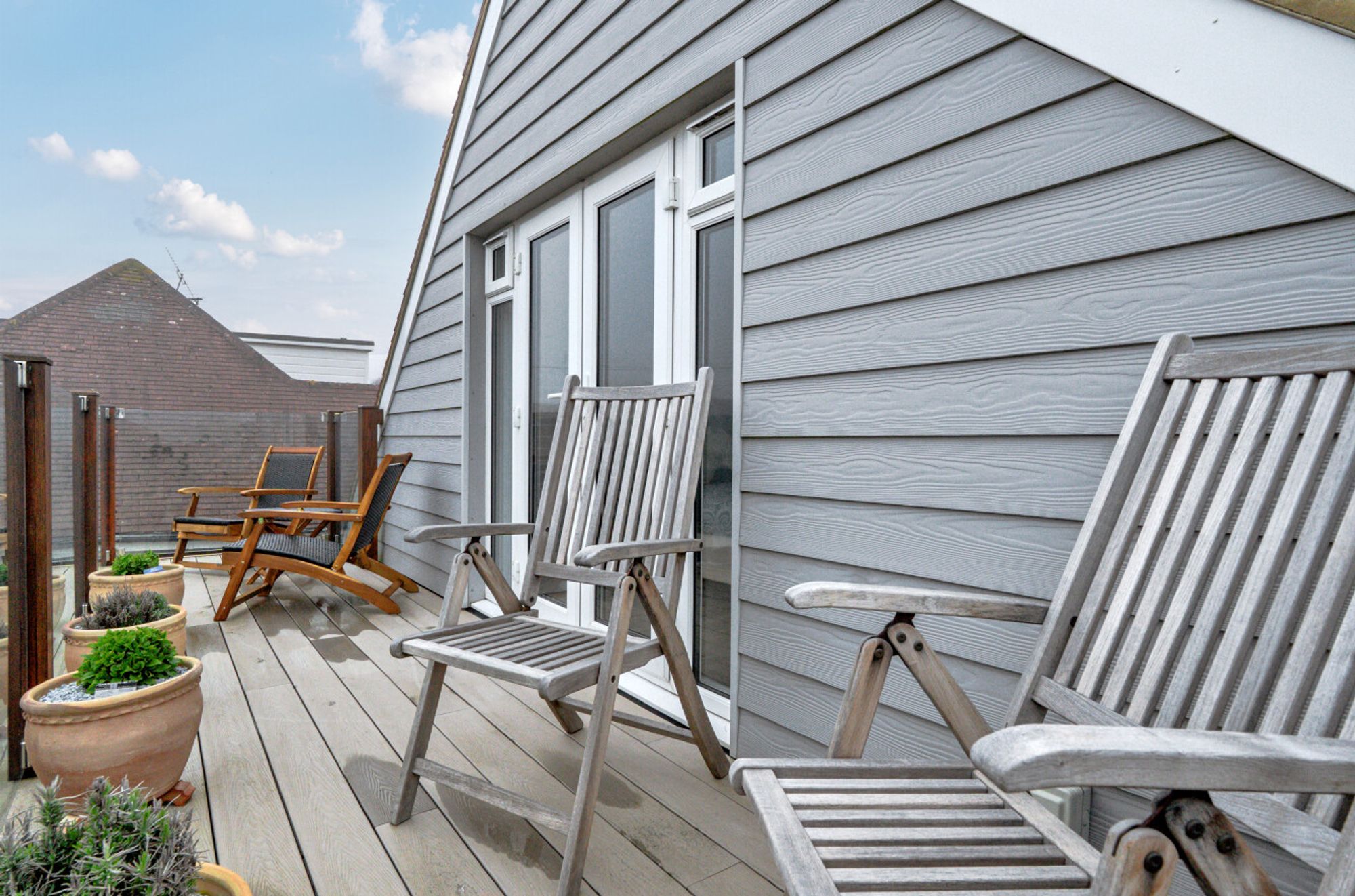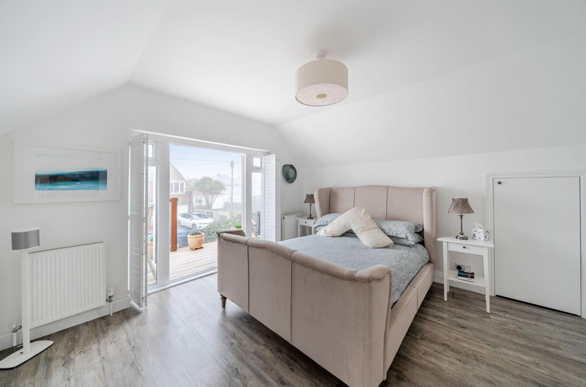 Upstairs, there are two further bedrooms, both offering ample eaves storage and served by the family bathroom. Bedroom two enjoys a southerly aspect and features a balcony with views of the sea between the front-row houses.