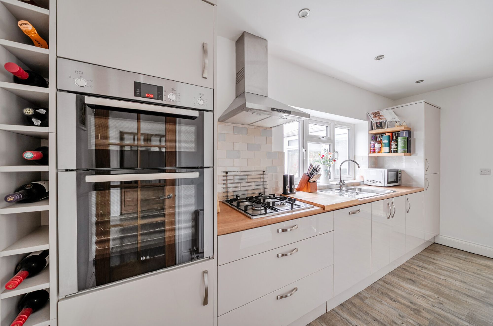 Moving through the sitting room, an inner hall leads to the kitchen, positioned at the rear of the property. The kitchen is well equipped with a range of cupboards and generous worktop space, along with integrated appliances. It opens seamlessly into a bright orangery with a striking sky lantern that floods the space with natural light. This versatile area provides an additional place to relax while overlooking the garden and also serves as an excellent dining and entertaining space.