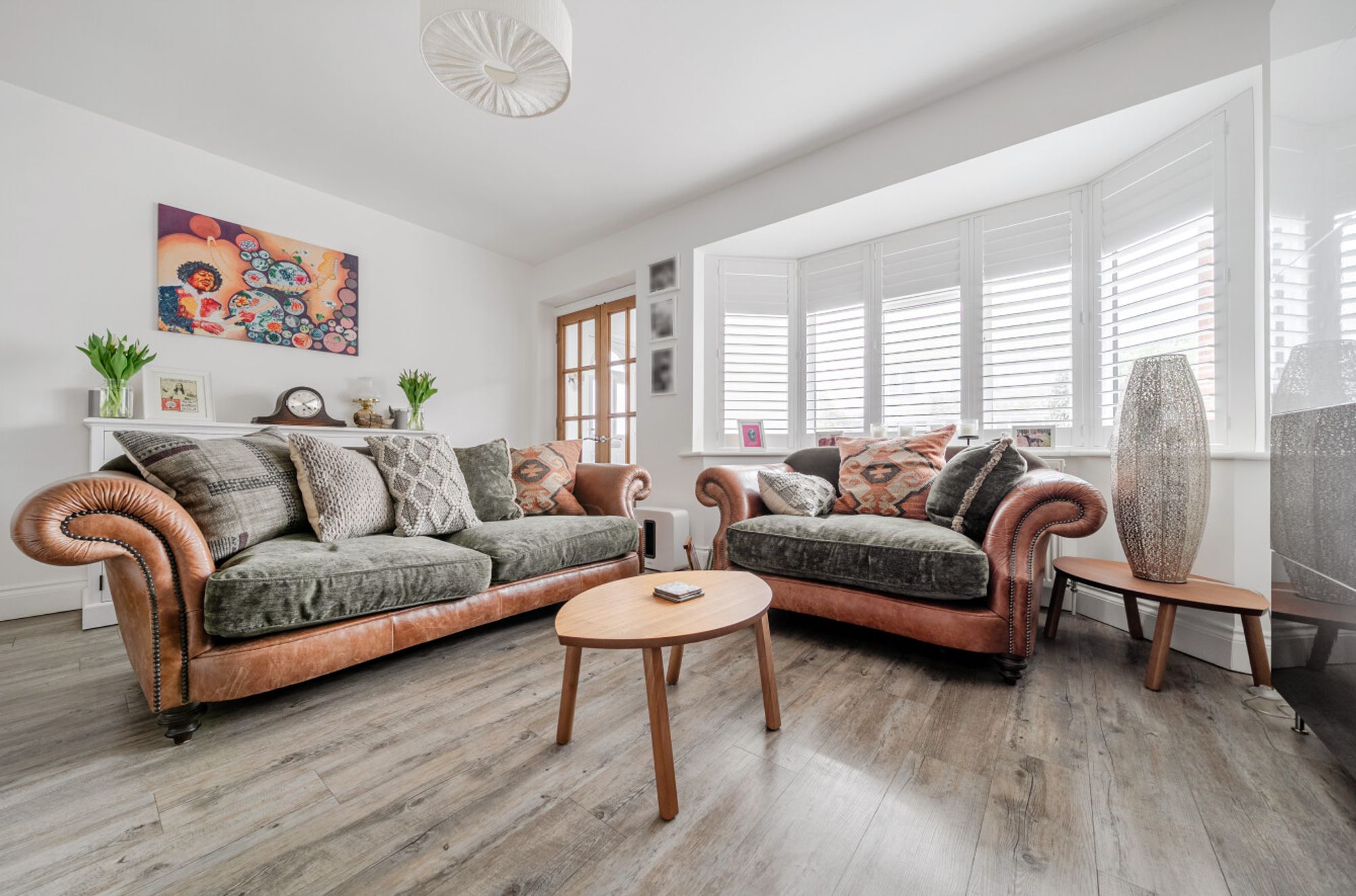 The accommodation is thoughtfully arranged and begins with a welcoming entrance hall that opens into a charming sitting room. This inviting space features an attractive log burner and stylish shuttered windows, perfectly complementing the relaxed beachside atmosphere.