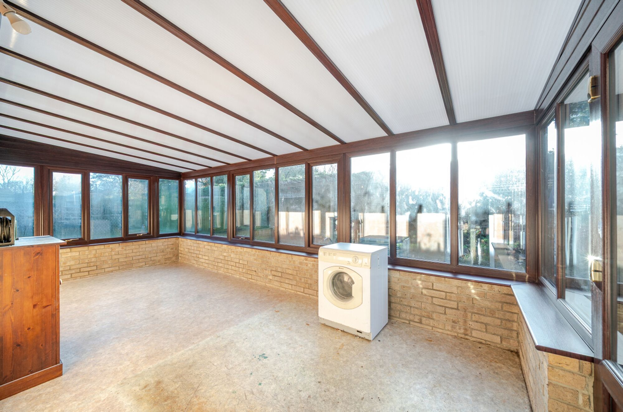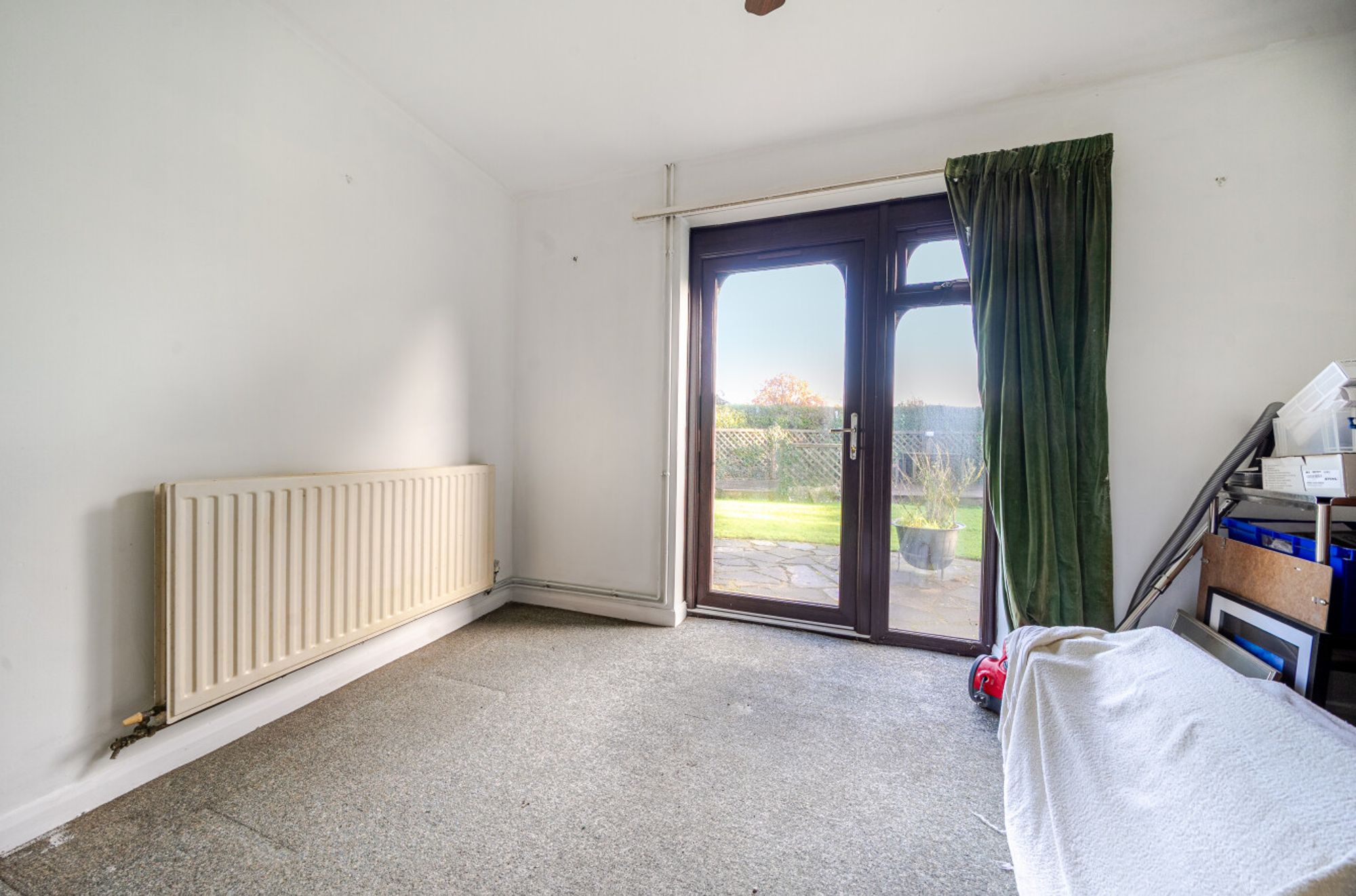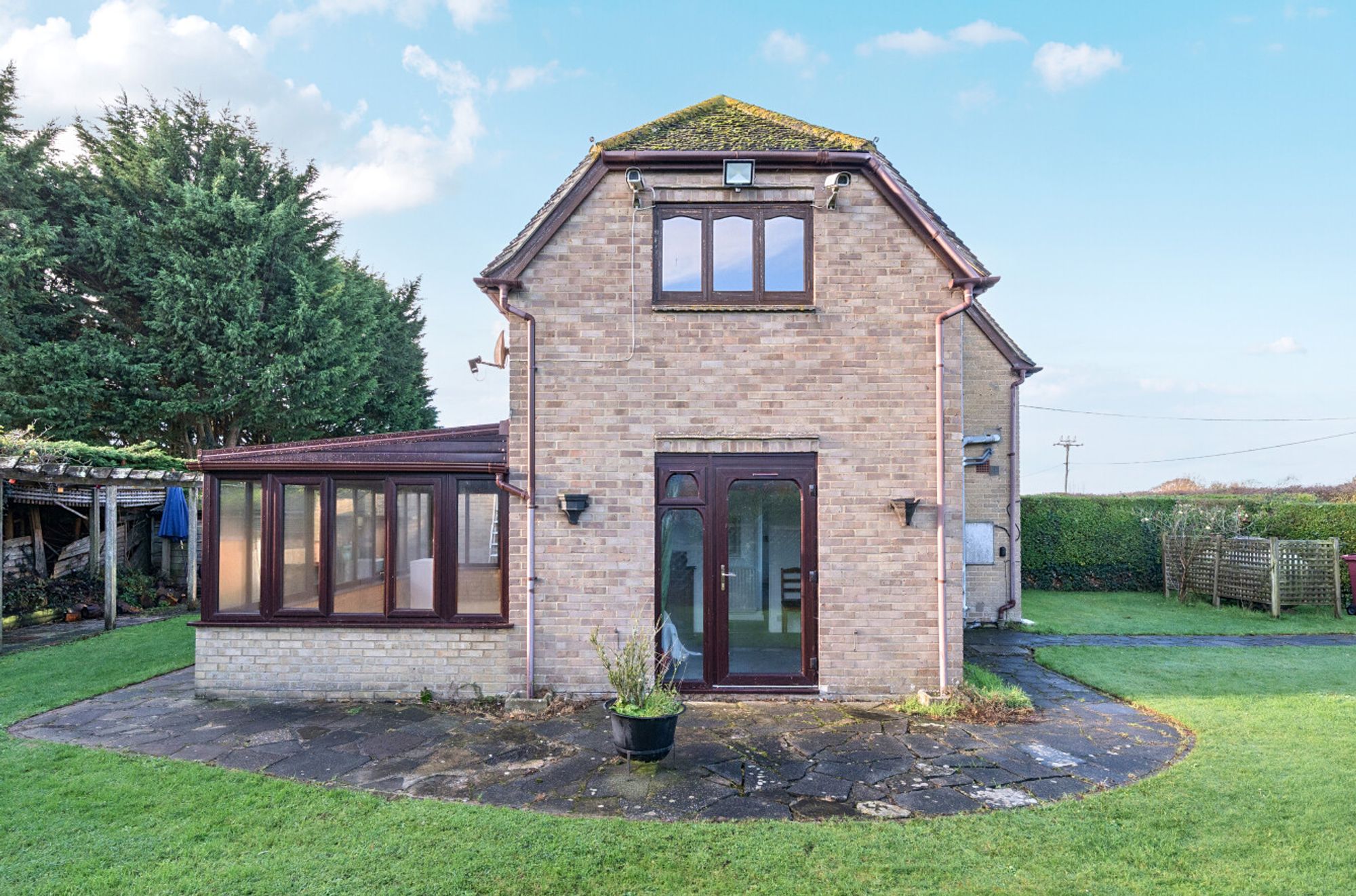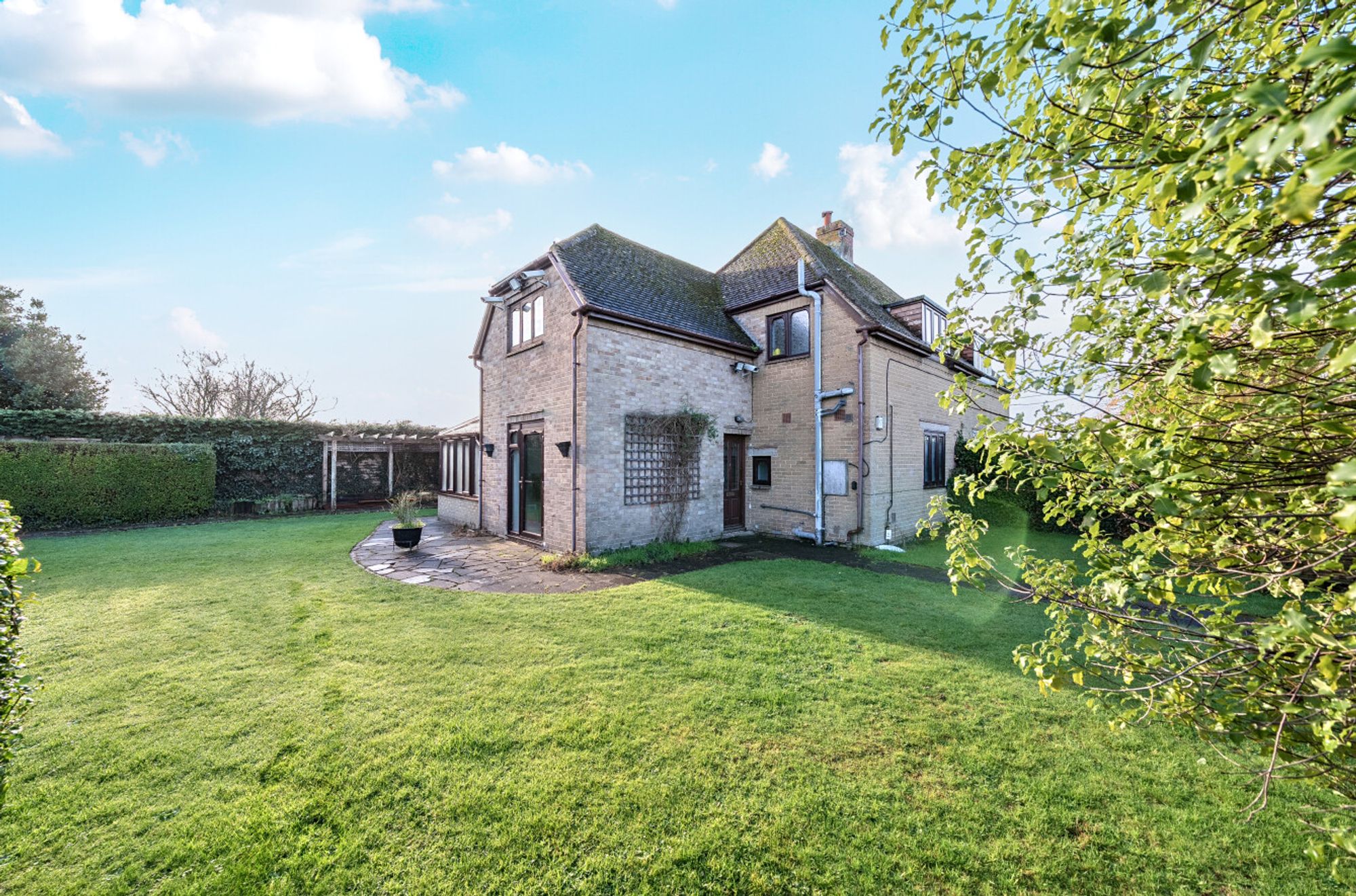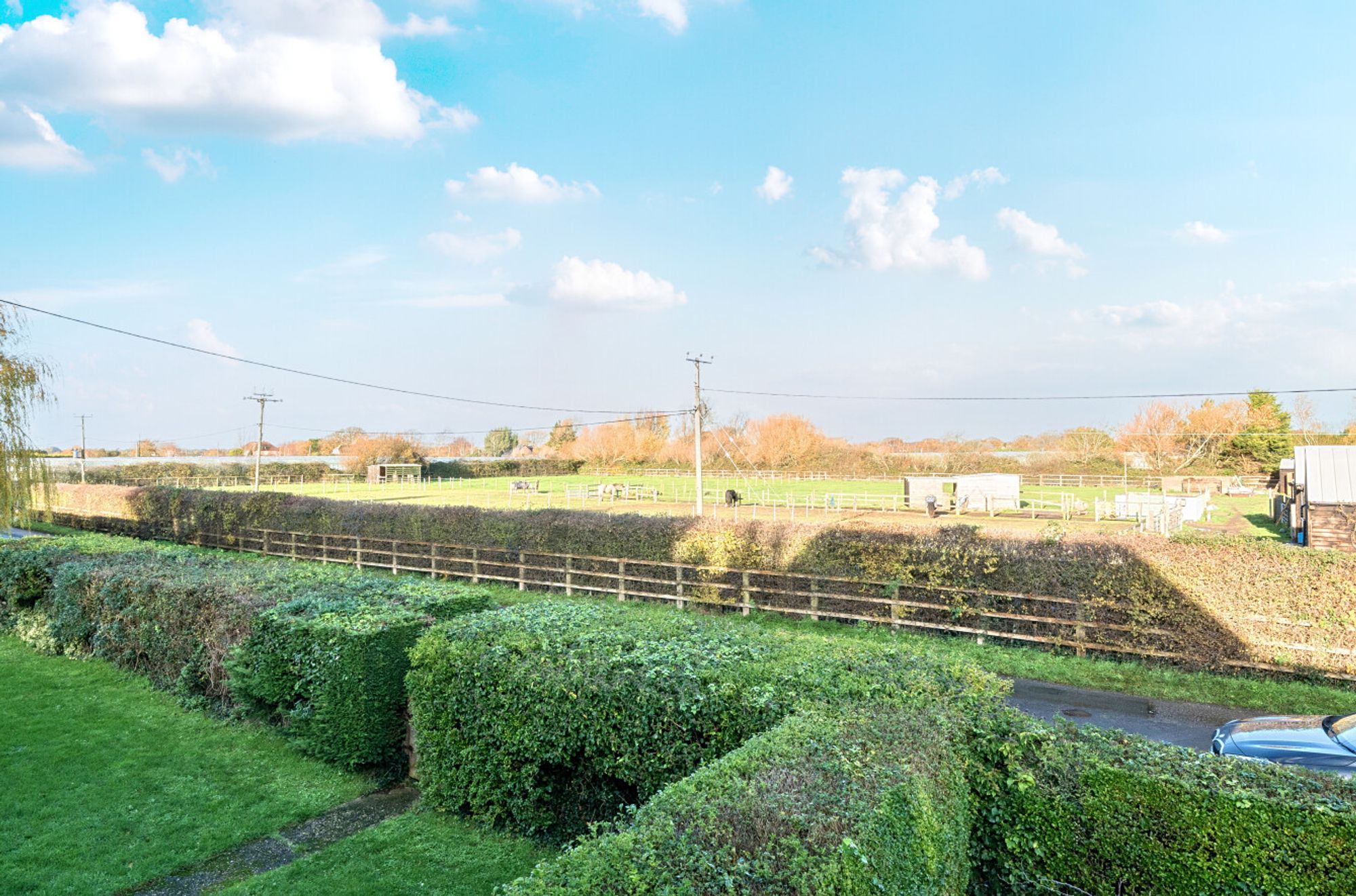Outside, a small footbridge crosses a surface-water ditch and leads to the front garden, which is mainly laid to lawn and continues around to the side of the house. Here, a decked seating area sits alongside a mature hedge that provides an informal division between the garden and the paddock. The rear garden features a paved patio and a pergola running along the rear boundary.