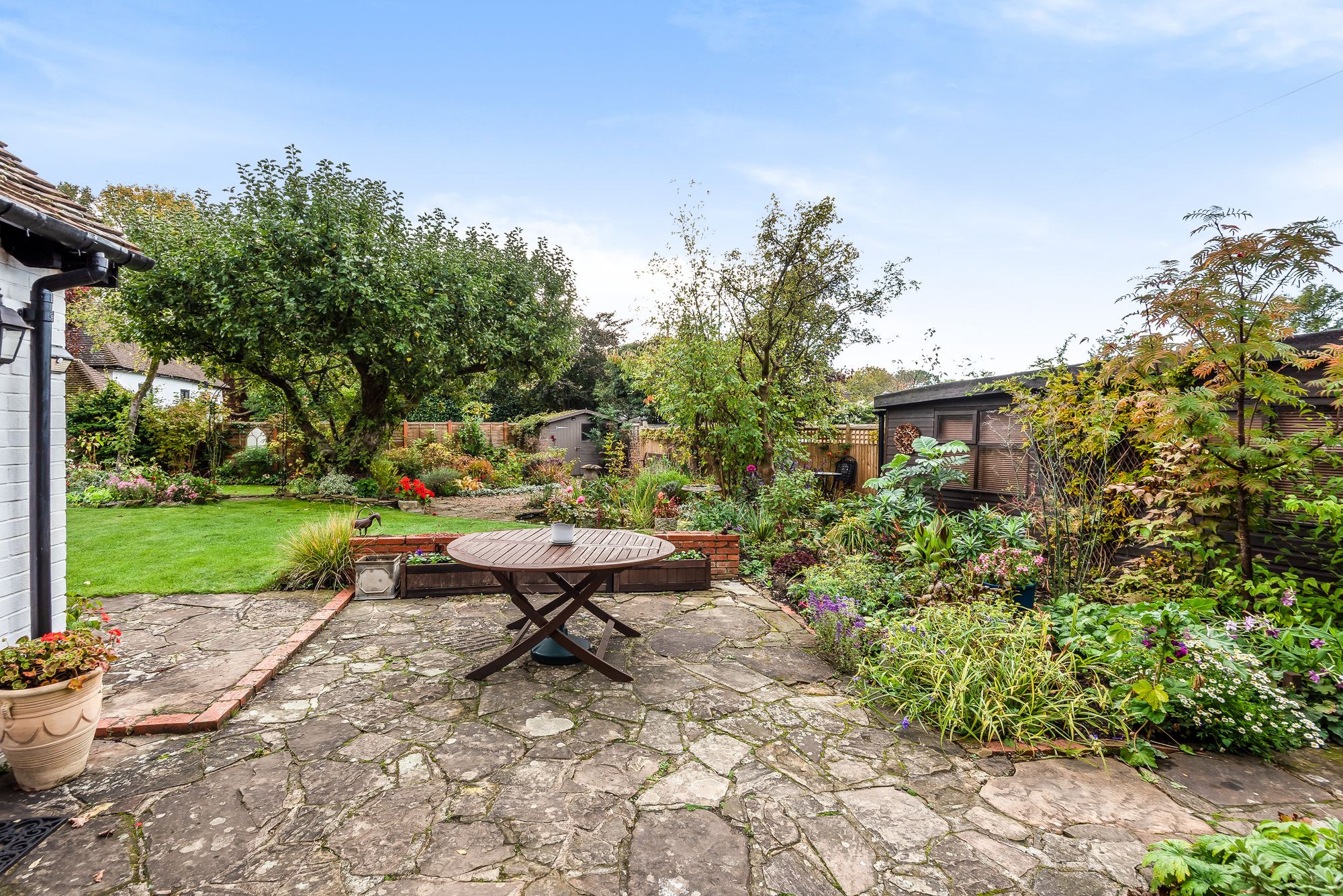 The property is approached via a gravel driveway leading to a detached garage which has a up and over door. The front garden has beautifully landscaped borders with mature shrubs, planting and further areas of lawn plus Horsham stone pathway. The rear gardens are also laid to lawn, there is a pond feature and a selection of beds and borders with mature trees and planting. There are further patio and terrace areas ideal for outdoor dining and several seating areas ideal for taking in the sunshine whilst enjoying the atmosphere of the superb gardens and village life.