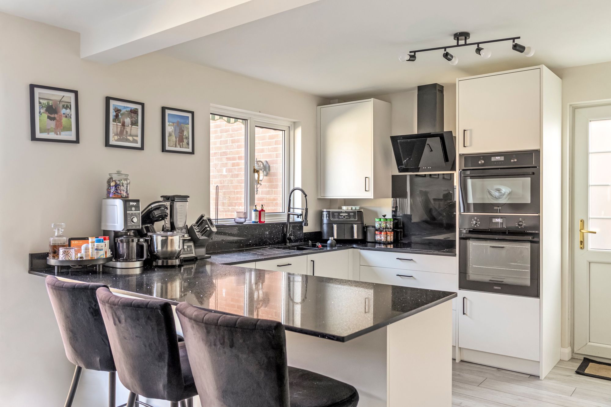 To the rear, the open-plan kitchen/dining room provides a spacious and sociable area, ideal for both everyday living and entertaining. The kitchen is fitted with a range of wall and base units complemented by contrasting work surfaces and a breakfast bar. Continuous flooring runs throughout the space and sliding doors open directly onto the rear garden terrace, allowing plenty of natural light and easy indoor-outdoor living.
