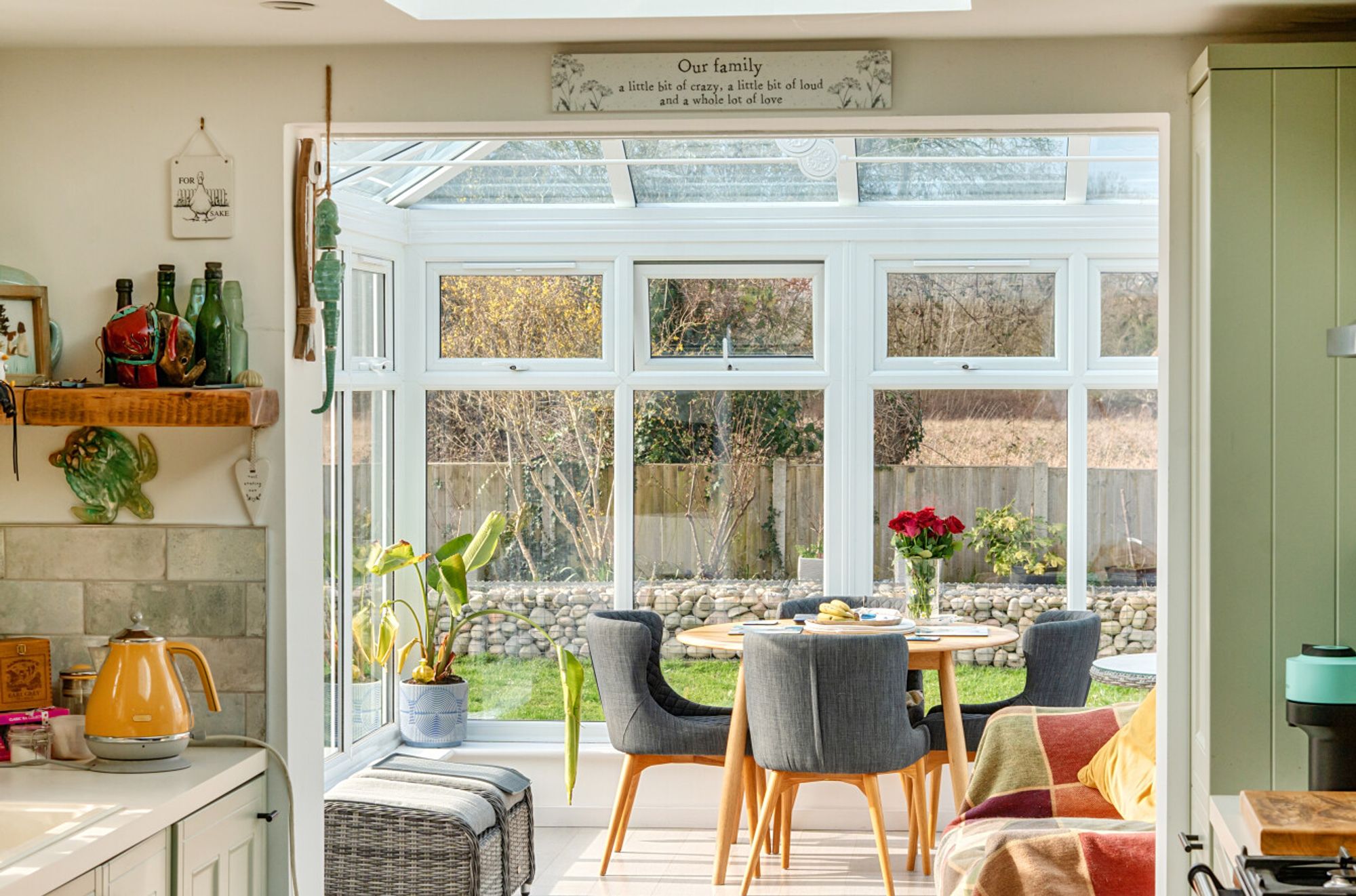 The ground floor opens into an inviting entrance hall with cloakroom/WC, leading through to a generous double-aspect sitting room featuring a charming log burner and a large window overlooking the attractive front garden. The impressive modern kitchen, measuring approximately 19’6 in length, is fitted with a comprehensive range of shaker-style cupboards and integrated appliances. A striking roof lantern fills the space with natural light and the kitchen flows seamlessly into a versatile UPVC double-glazed conservatory with views over the rear garden.