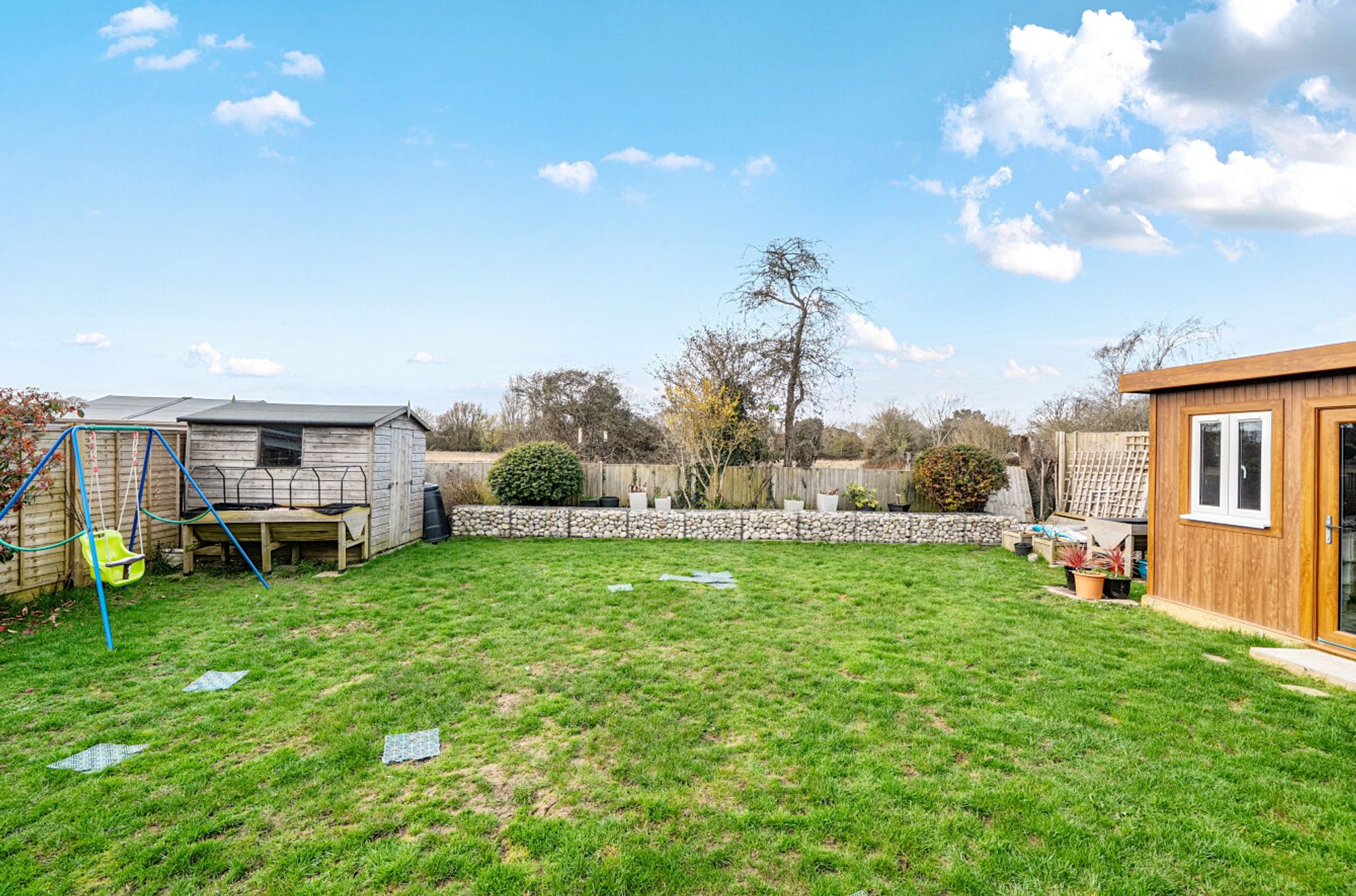 Outside, the property is approached via a wide gravel driveway providing ample parking for several vehicles and leading to an attached single garage. Behind the garage is a useful store or utility space measuring approximately 12ft by 8ft. Side access leads to the generously sized rear garden, which backs onto open fields and enjoys a high degree of privacy. Predominantly laid to lawn and enclosed by timber fencing, the garden also features a paved terrace ideal for outdoor dining, along with a timber shed and a home office.