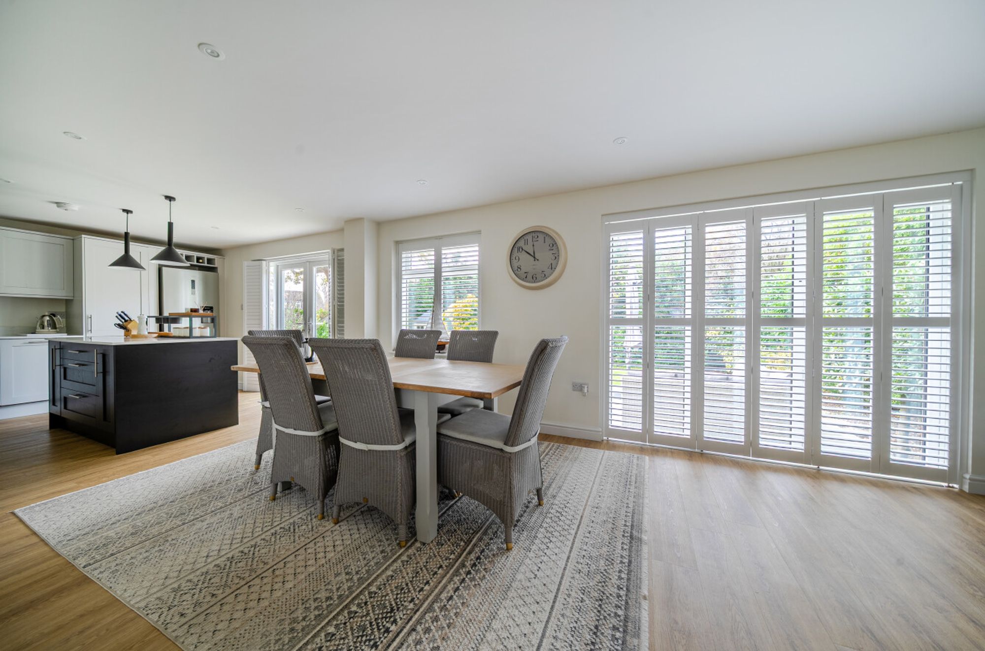 A statement vaulted entrance hall, framed by oak and glass detailing, sets the tone for the sophistication within. The expansive open-plan living space forms the heart of the home, a perfect balance of style and functionality. The bespoke kitchen features Quartz work surfaces, shaker cabinetry, and premium appliances, centred around a striking island ideal for gathering and entertaining. The adjoining dining and sitting areas, warmed by a log-burning stove, and picture windows flow effortlessly to the landscaped gardens through French and bi-folding doors. Every detail has been carefully considered, from the luxury flooring underfoot to the plantation shutters that enhance the home’s crisp, contemporary character.