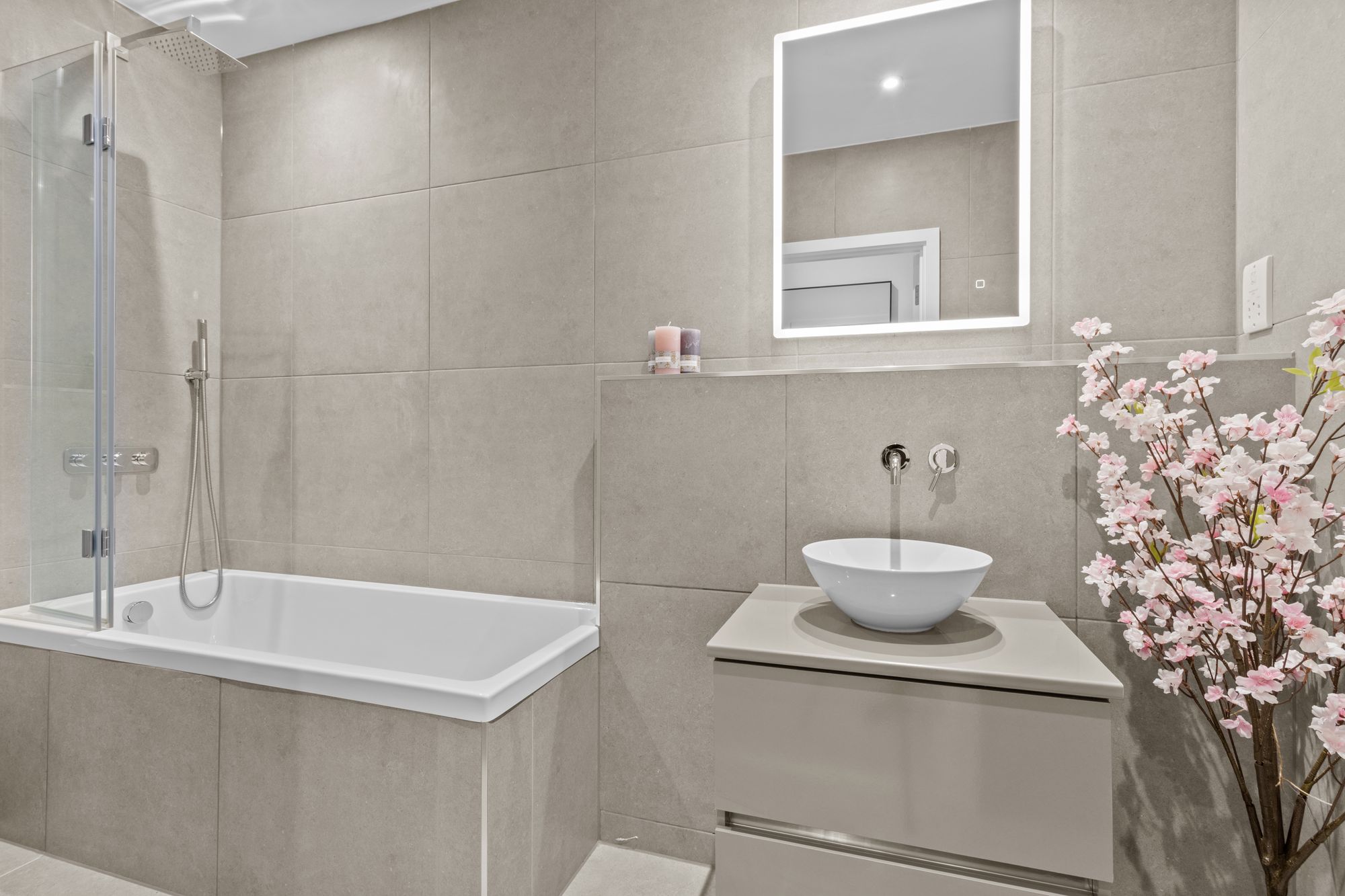 There is a spacious double bedroom finished with high-quality wood affect flooring, which runs through the entire apartment. The luxury bathroom features neutral and modern ceramic floor and wall tiles, a bath with shower over, and extra touches which include a heated towel rail and LED anti-mist mirror. Sought-after storage space can also be found off of the hallway.