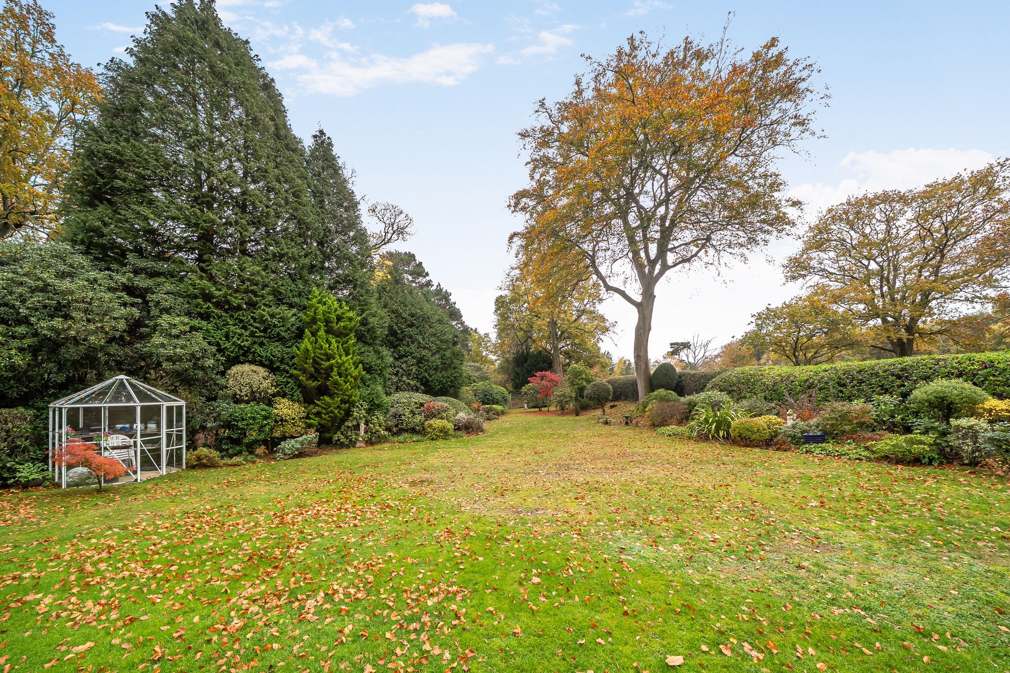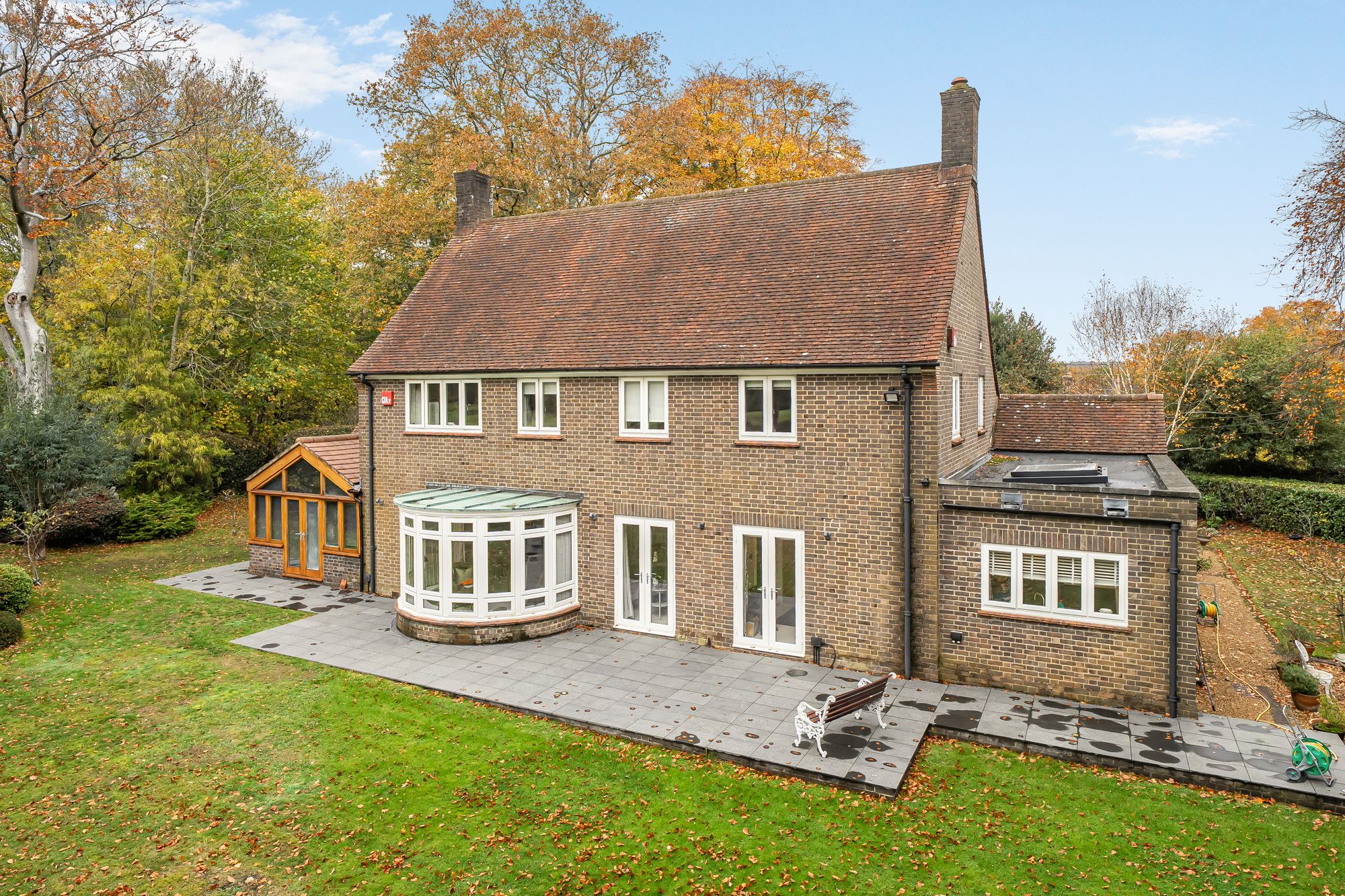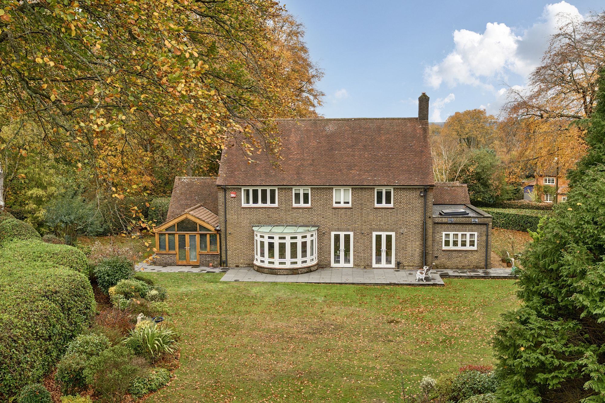 The property enjoys a southerly-facing rear garden, designed for both relaxation and outdoor entertaining. A large non-slip terrace provides ample room for outdoor furniture and al fresco dining, while the main garden area is laid to lawn and bordered by mature trees and shrubs, including majestic beech trees and vibrant rhododendrons, creating a tranquil and secluded backdrop.