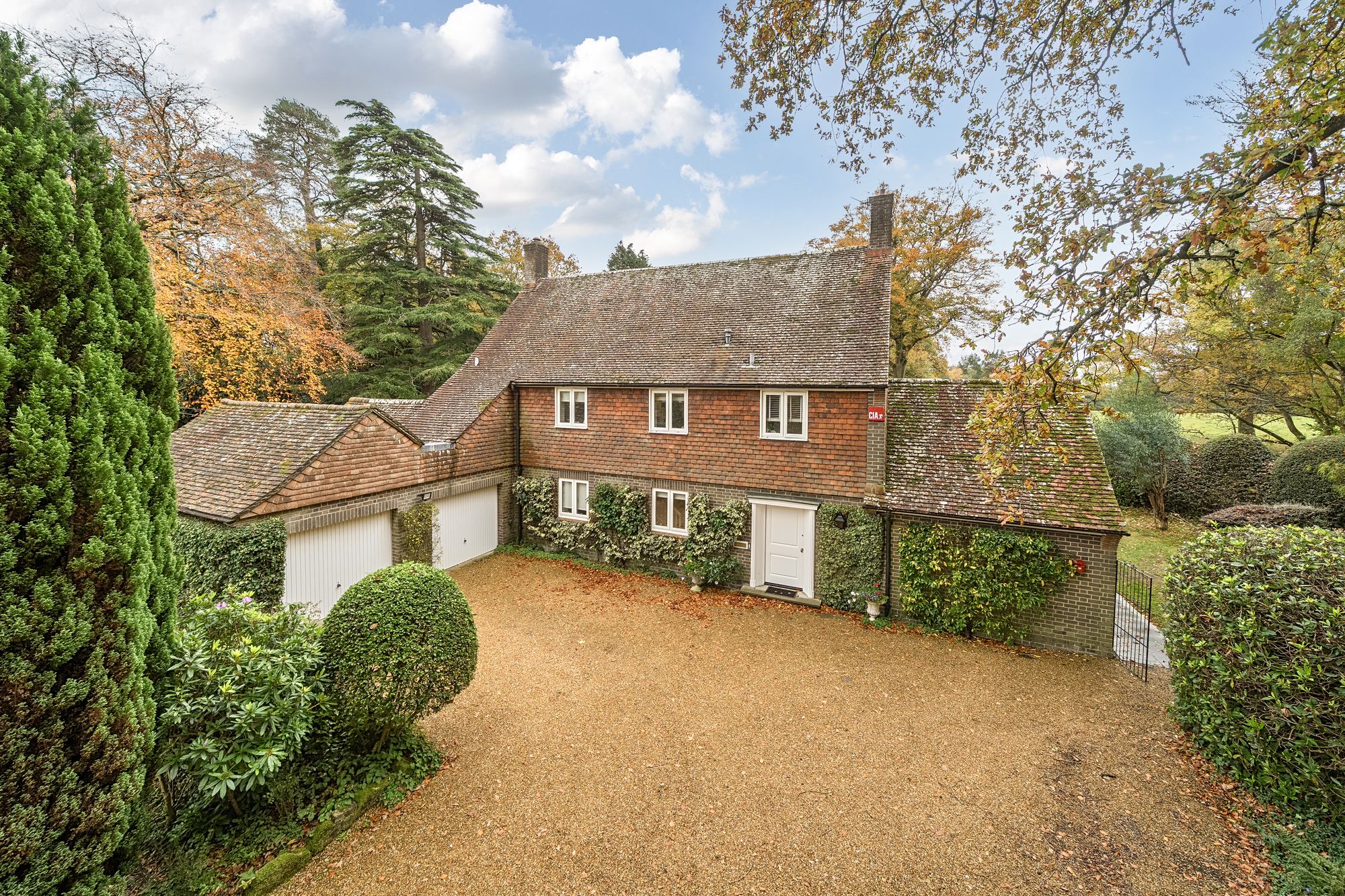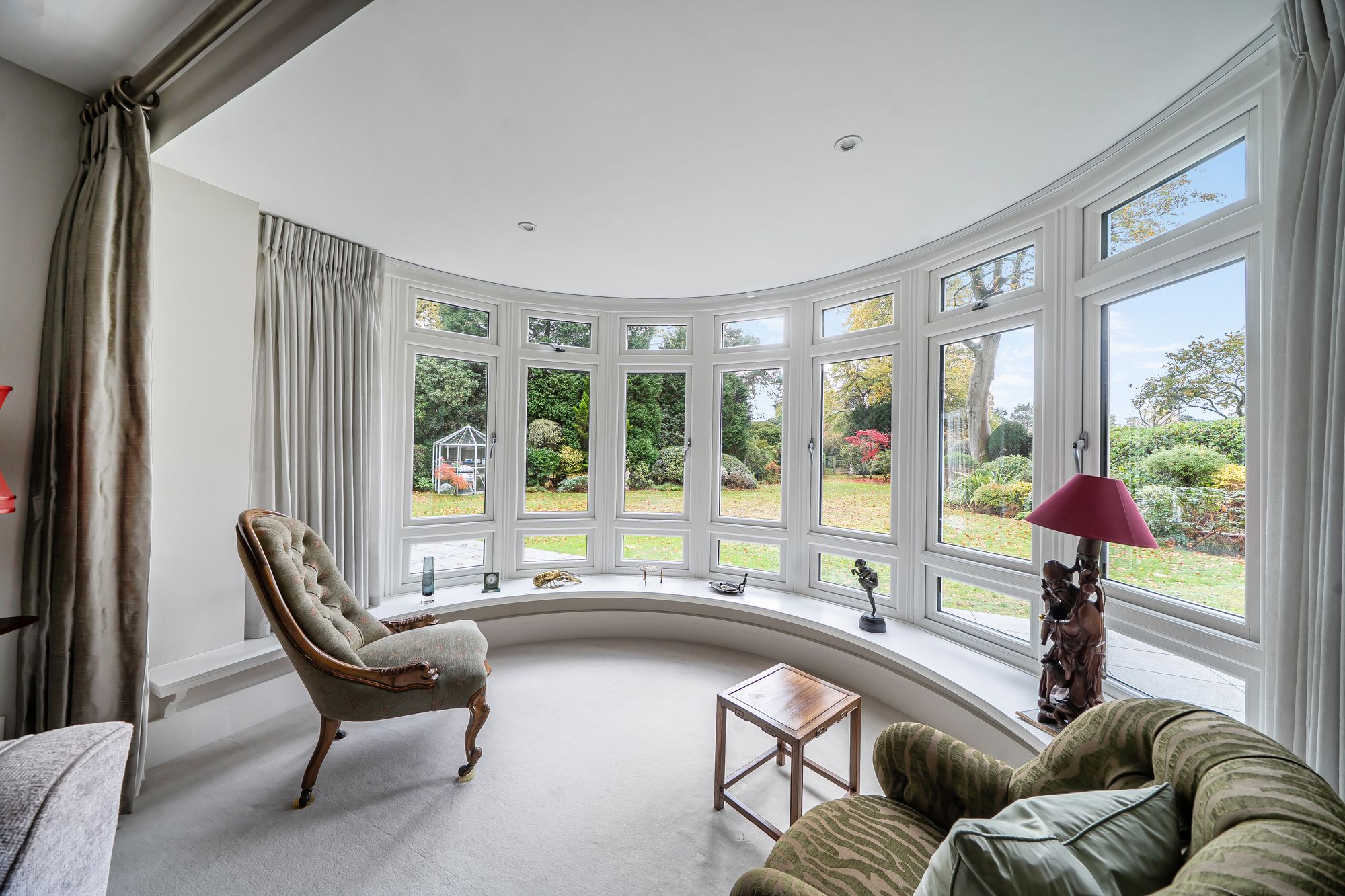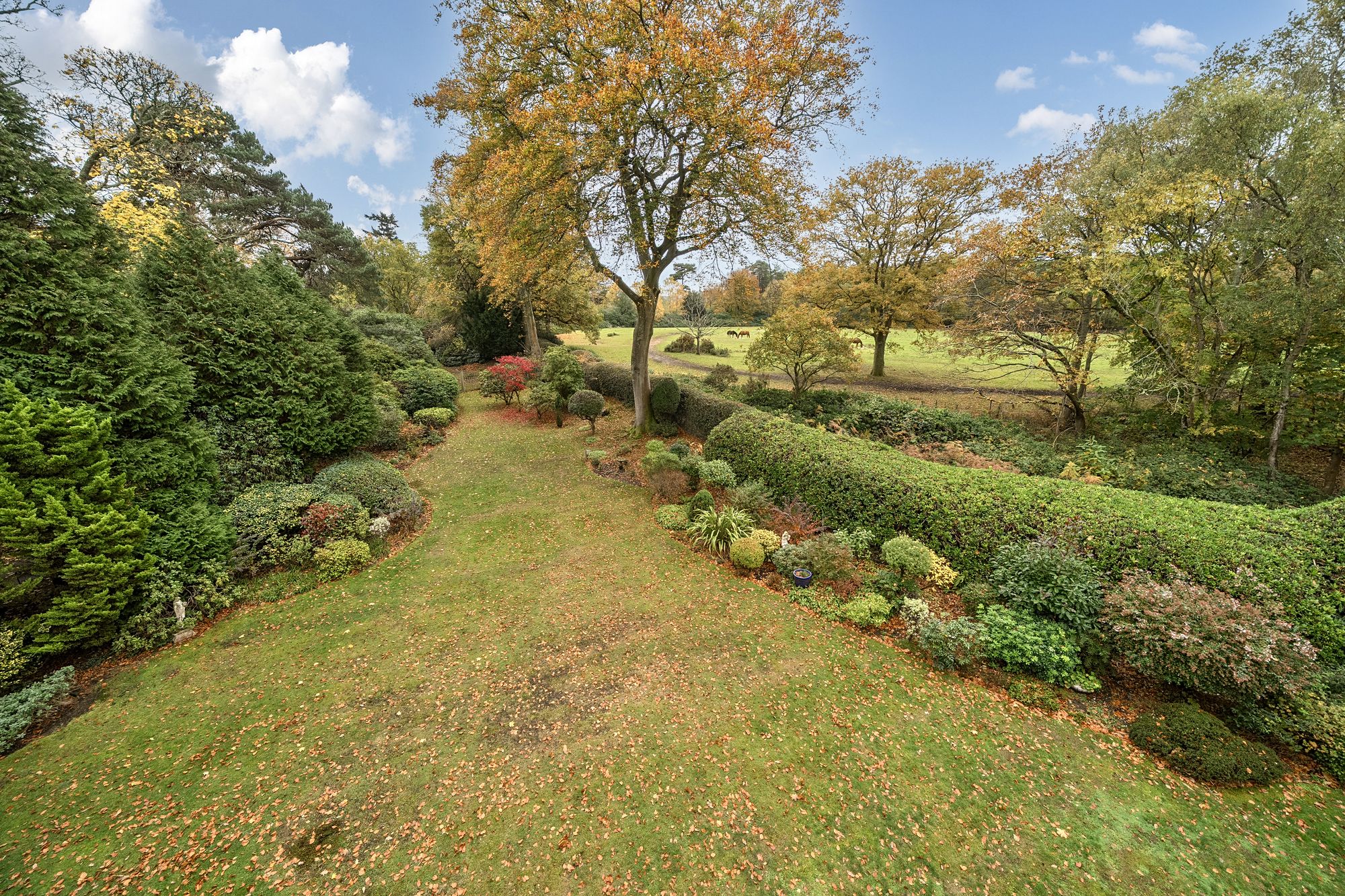 The property enjoys a southerly-facing rear garden, designed for both relaxation and outdoor entertaining. A large non-slip terrace provides ample room for outdoor furniture and al fresco dining, while the main garden area is laid to lawn and bordered by mature trees and shrubs, including majestic beech trees and vibrant rhododendrons, creating a tranquil and secluded backdrop.