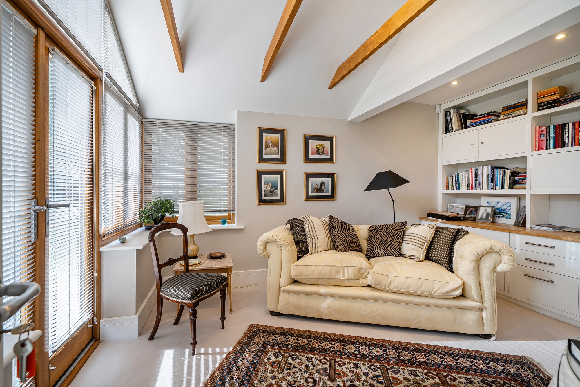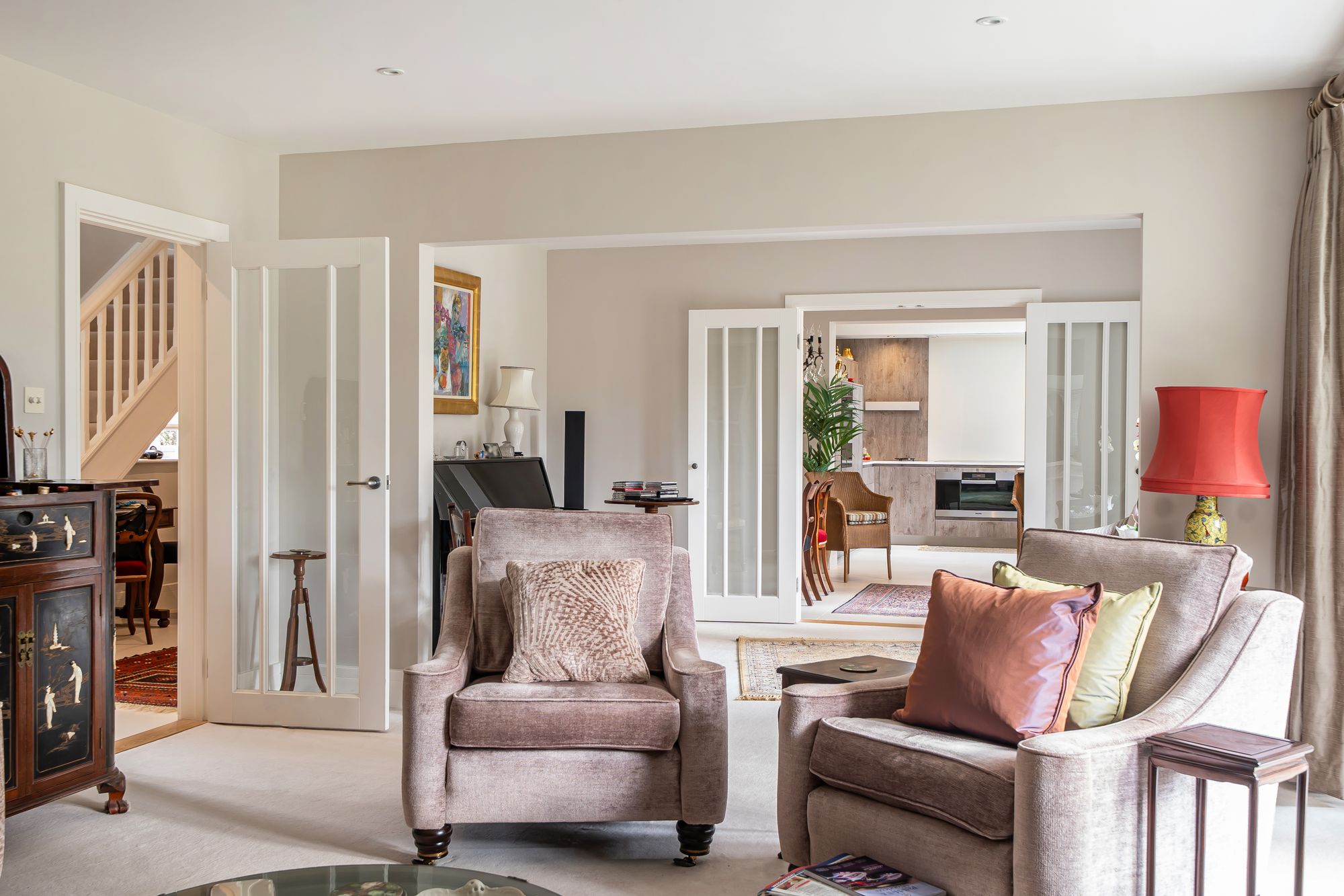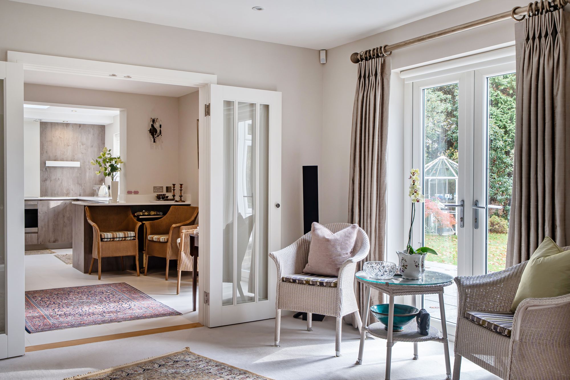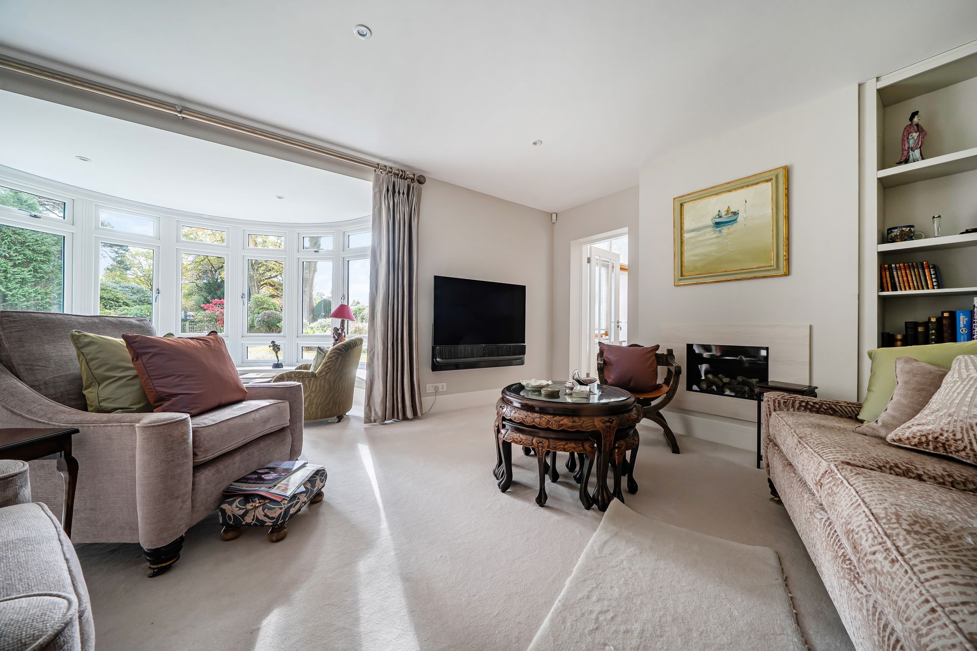 From the family area, double doors lead through to a magnificent dual-aspect reception room with a characterful bay window and gas-effect fireplace, creating a warm and welcoming ambiance. This is a versatile space, perfect for entertaining guests or enjoying quiet evenings with the family. Adjoining this room is a sun lounge / study, featuring fitted shelving and storage, and French doors that open directly to the garden, ideal for home working or relaxing with a book.