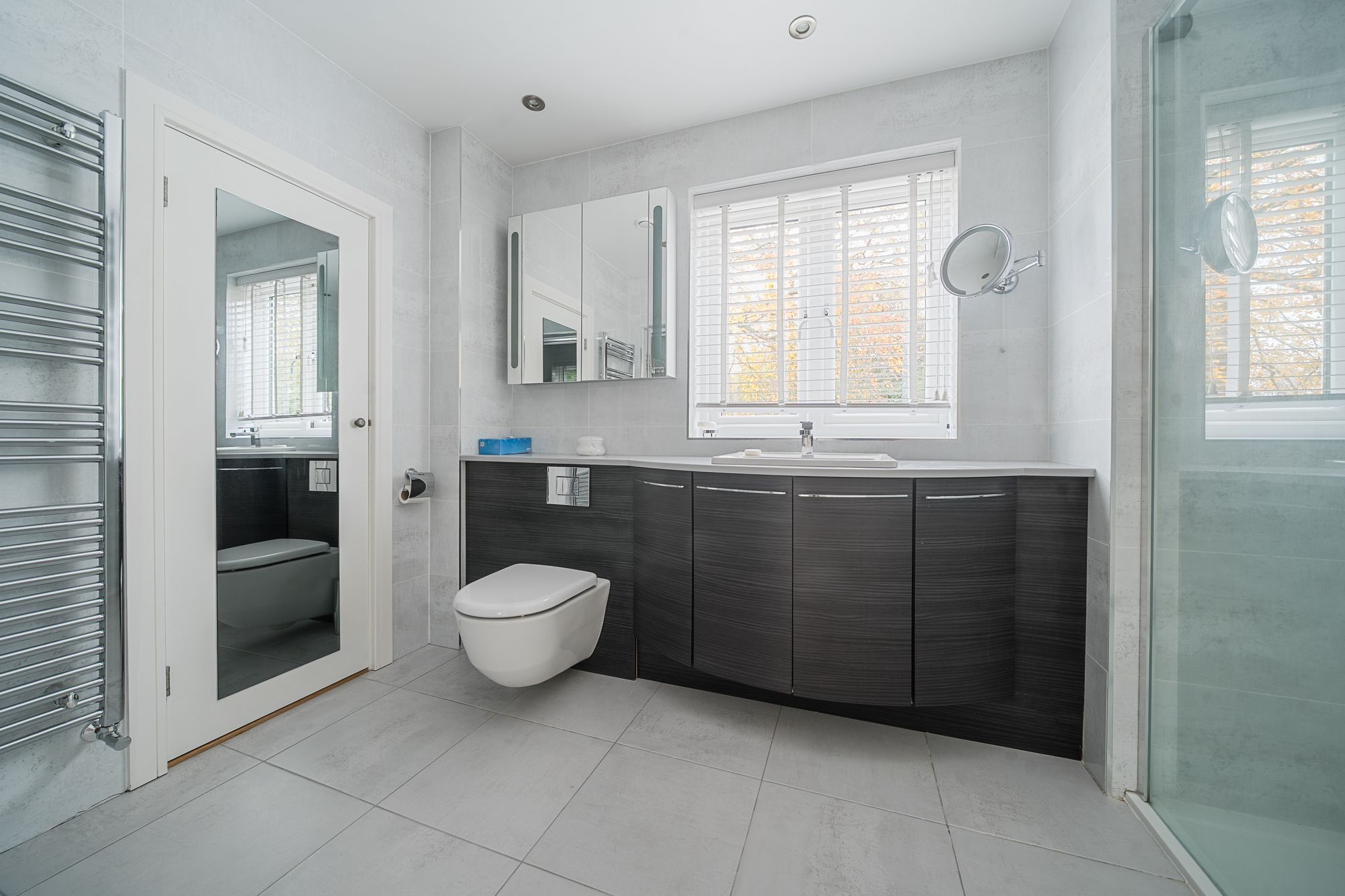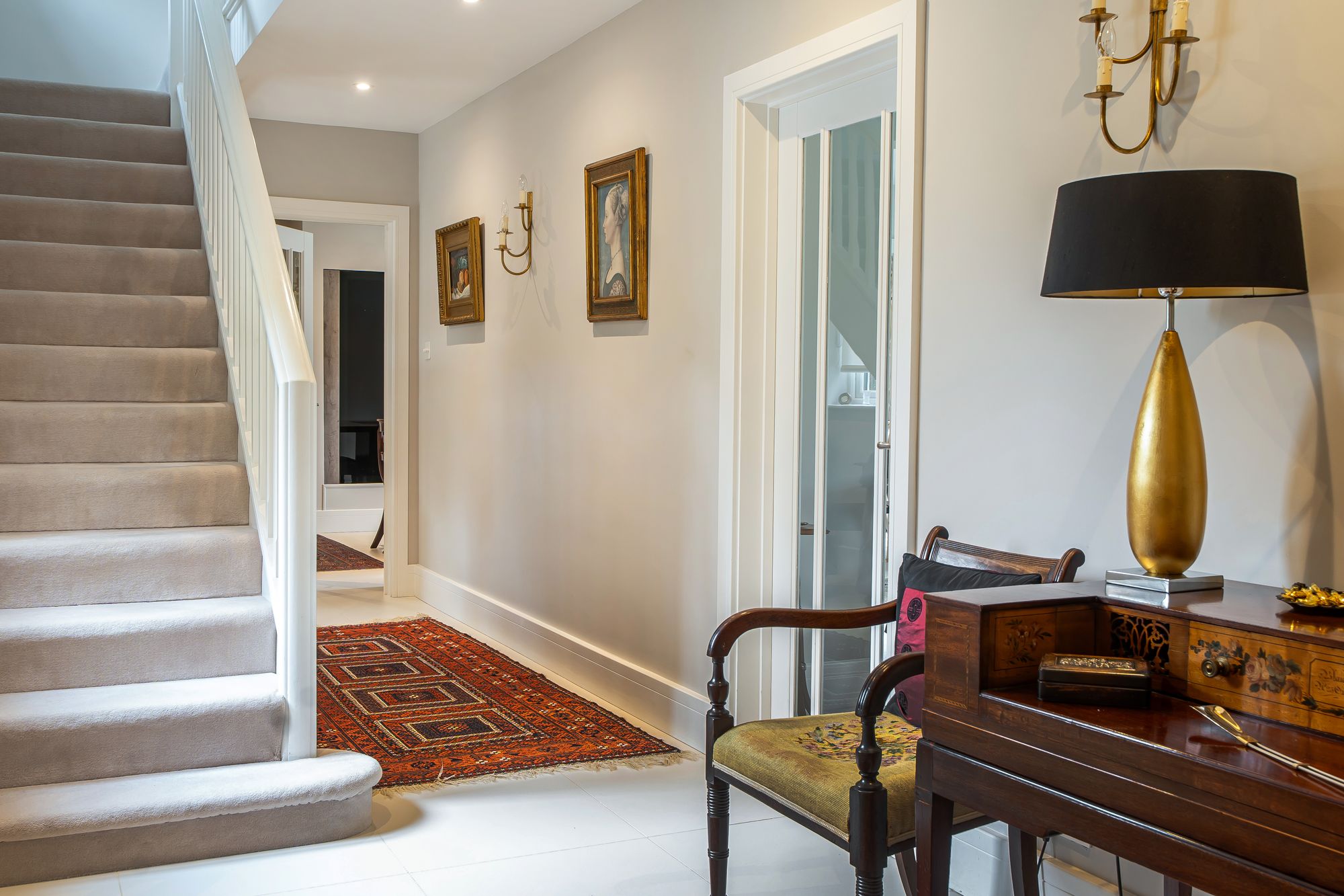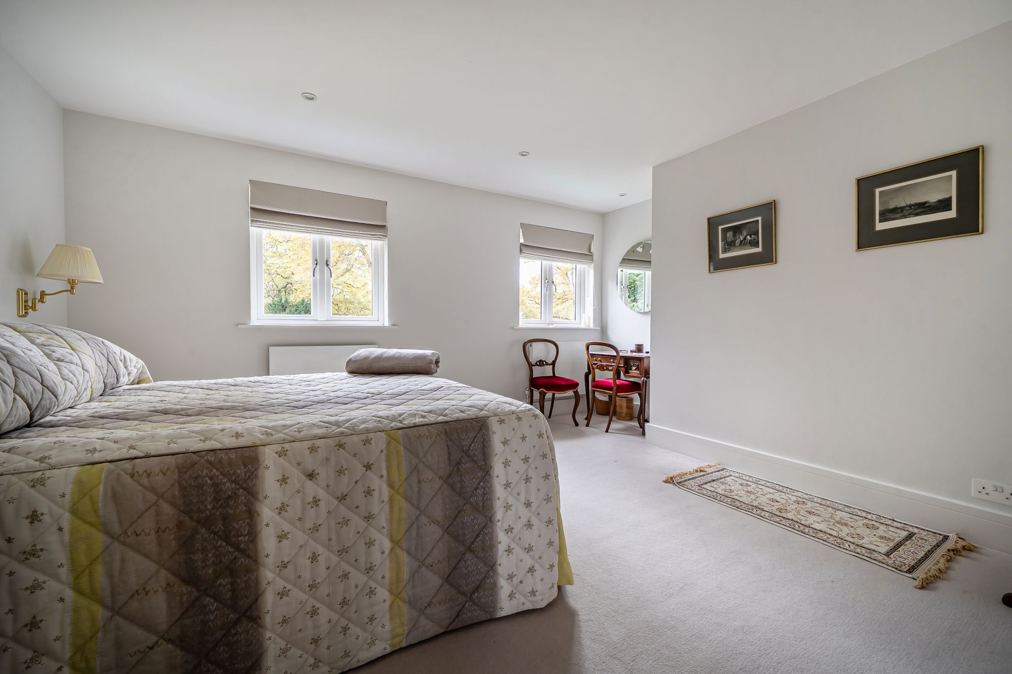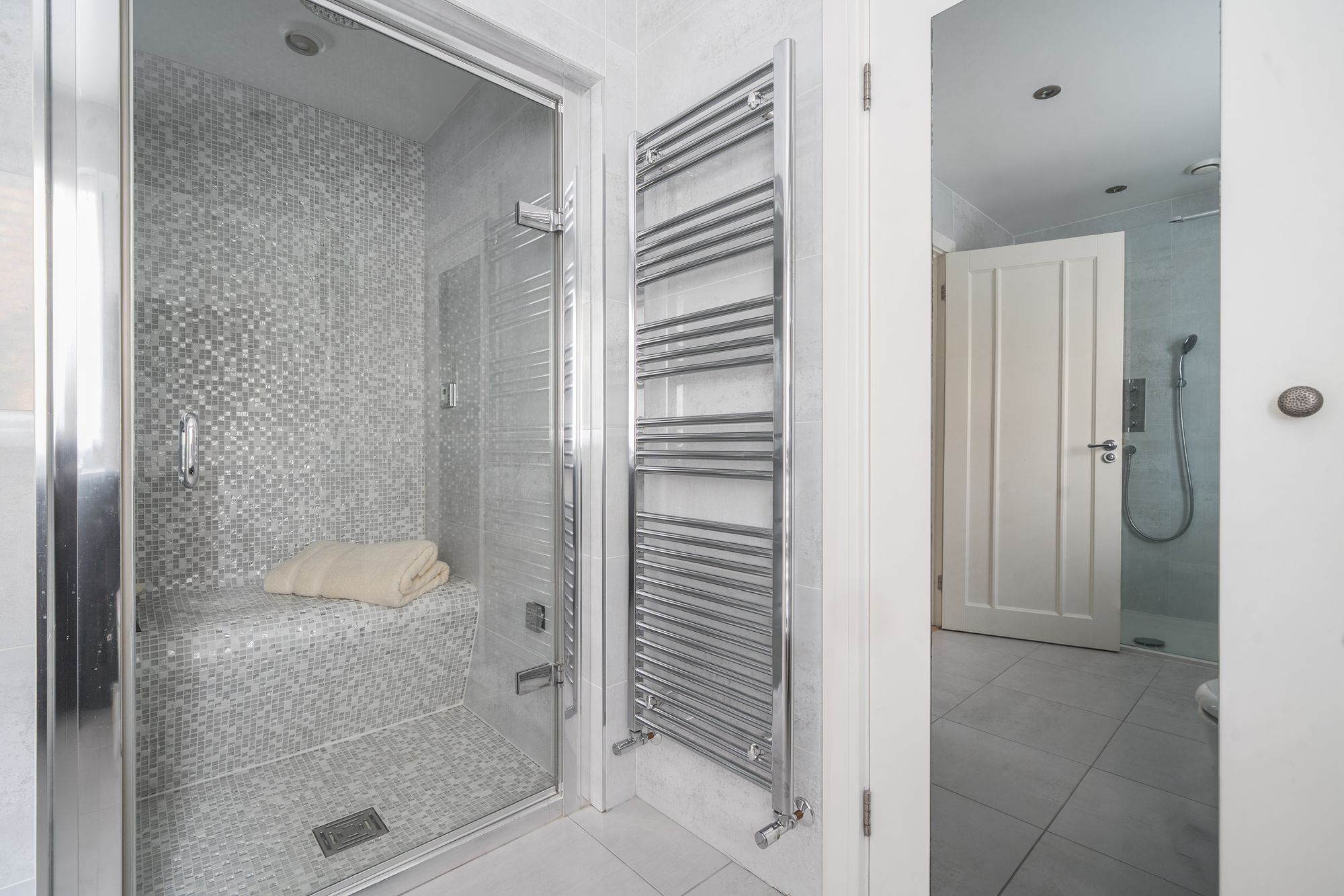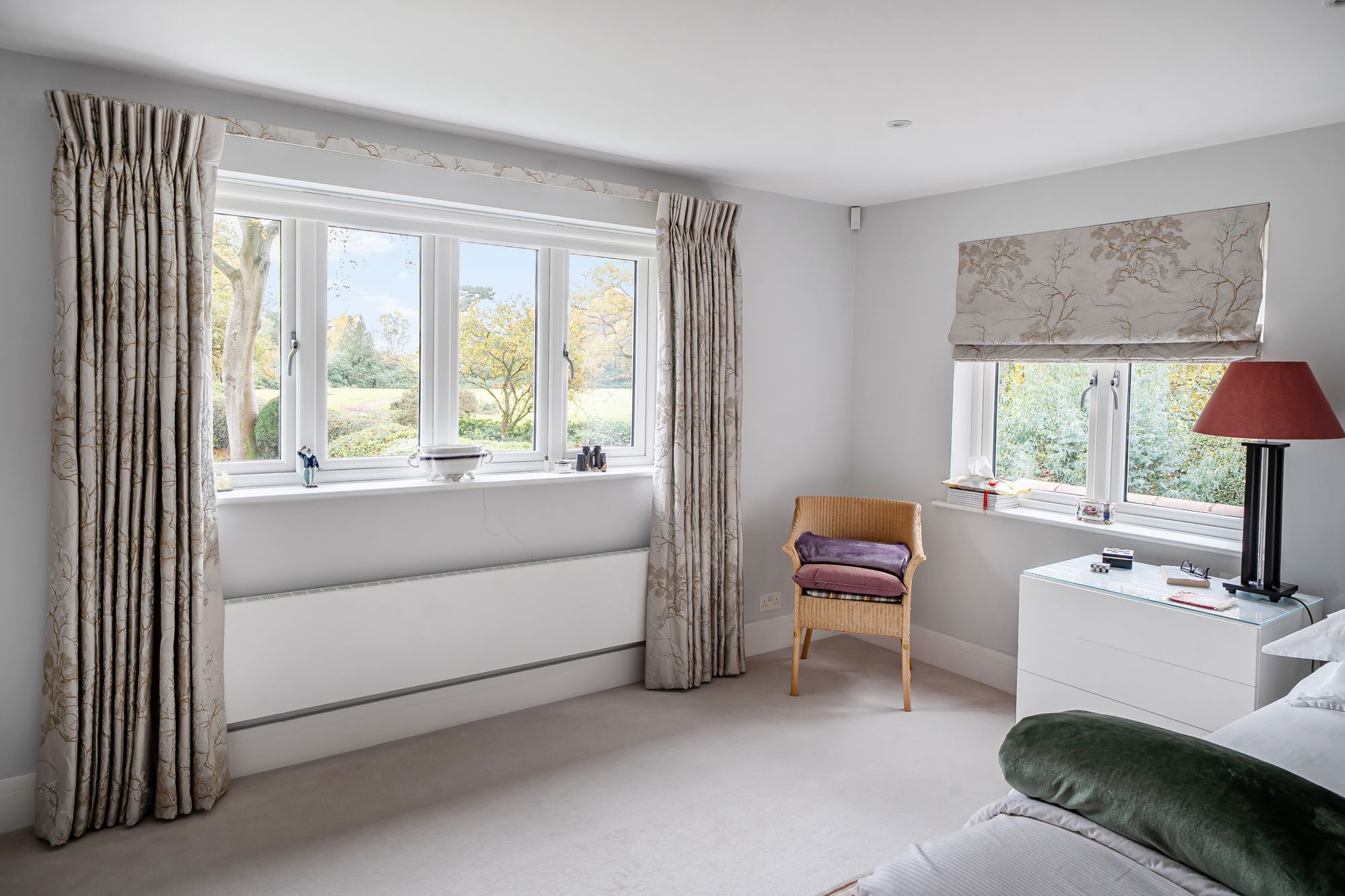 Upstairs, a light and airy landing leads to a beautifully proportioned principal bedroom suite, complete with a stylish ensuite shower room, generous built-in wardrobes, and far-reaching views over the rear garden and adjoining meadow. Two further spacious double bedrooms provide excellent family accommodation, complemented by a contemporary family bathroom featuring a walk-in shower and a luxurious steam room with spa-style facilities.