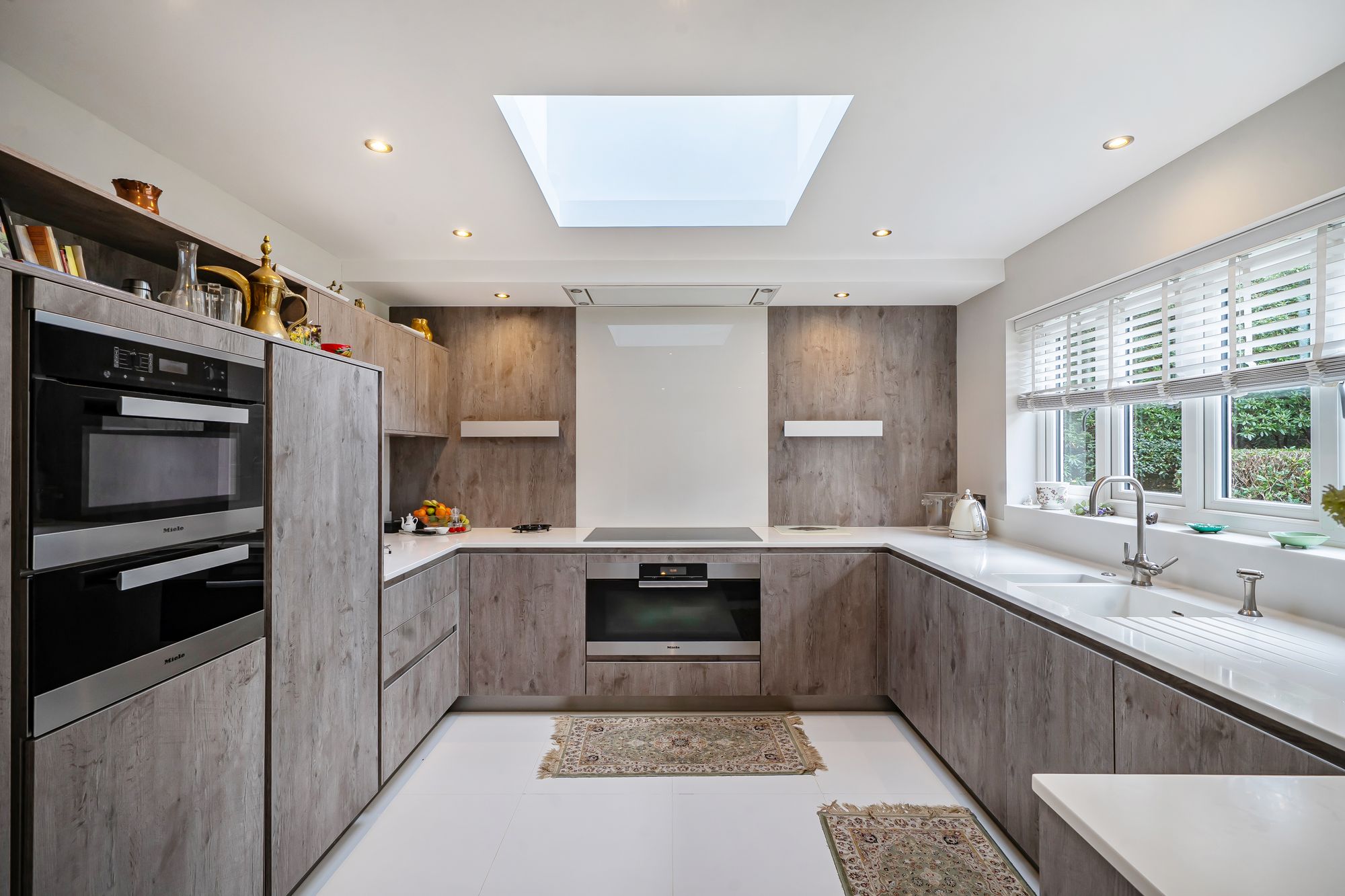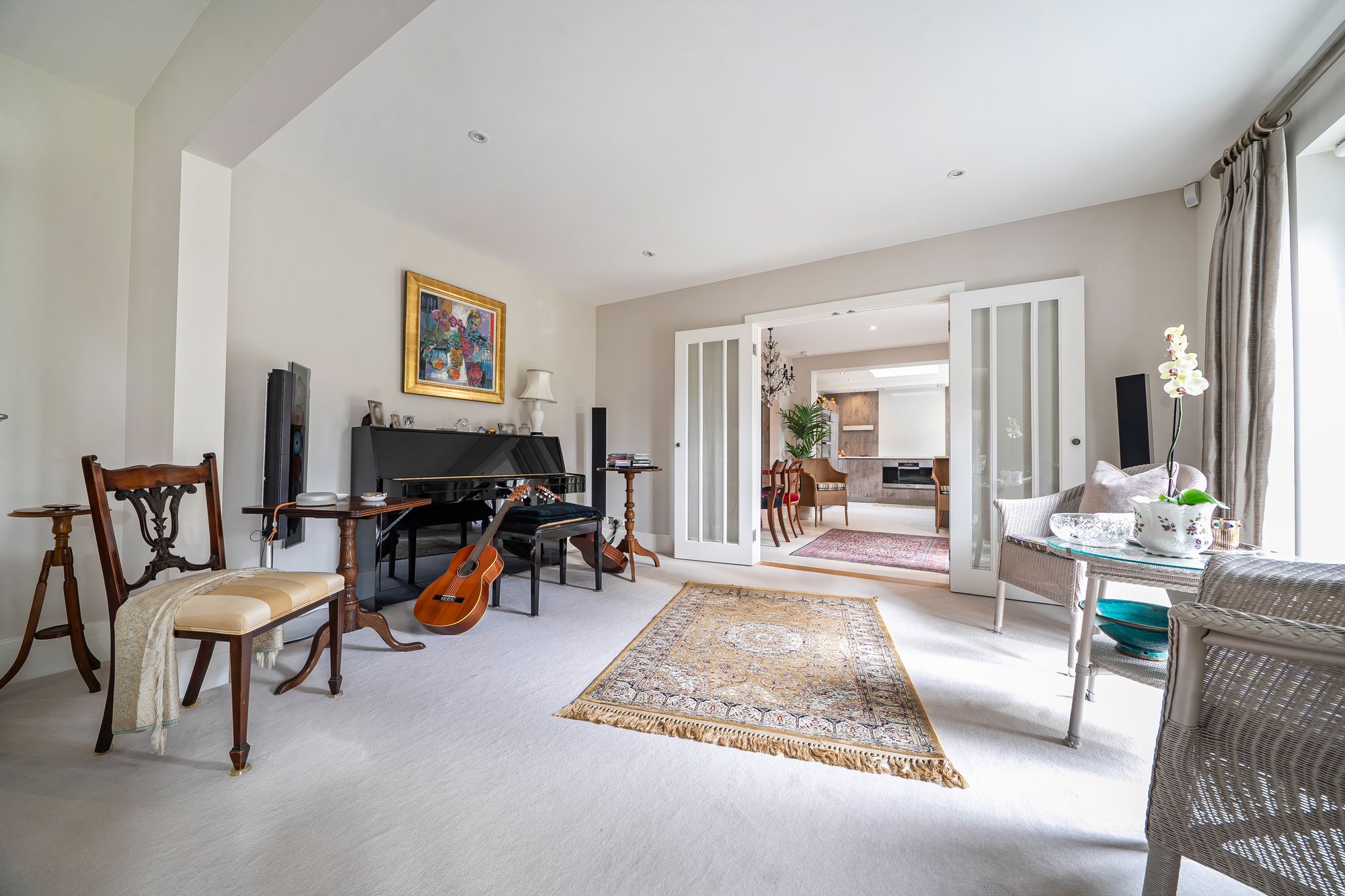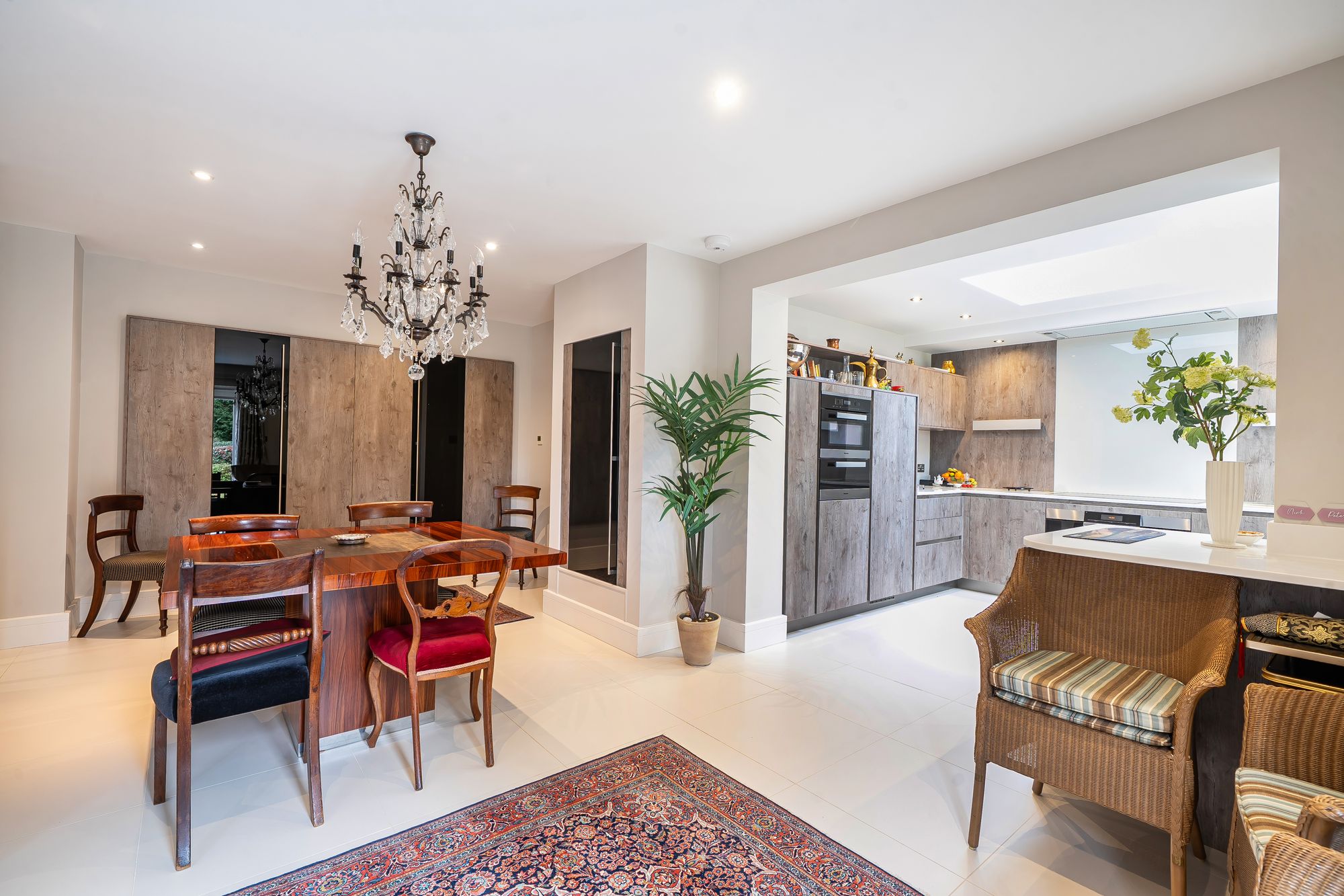The bespoke kitchen is fitted with Corian worksurfaces and a comprehensive range of high-quality Miele appliances, including an oven, grill/microwave combination, warming drawer, and integrated dishwasher. The room also features a breakfast bar, perfect for informal dining, and an inviting dining area with ample space for a large table and chairs. Custom-built cabinetry provides excellent storage and display space, adding both functionality and elegance.