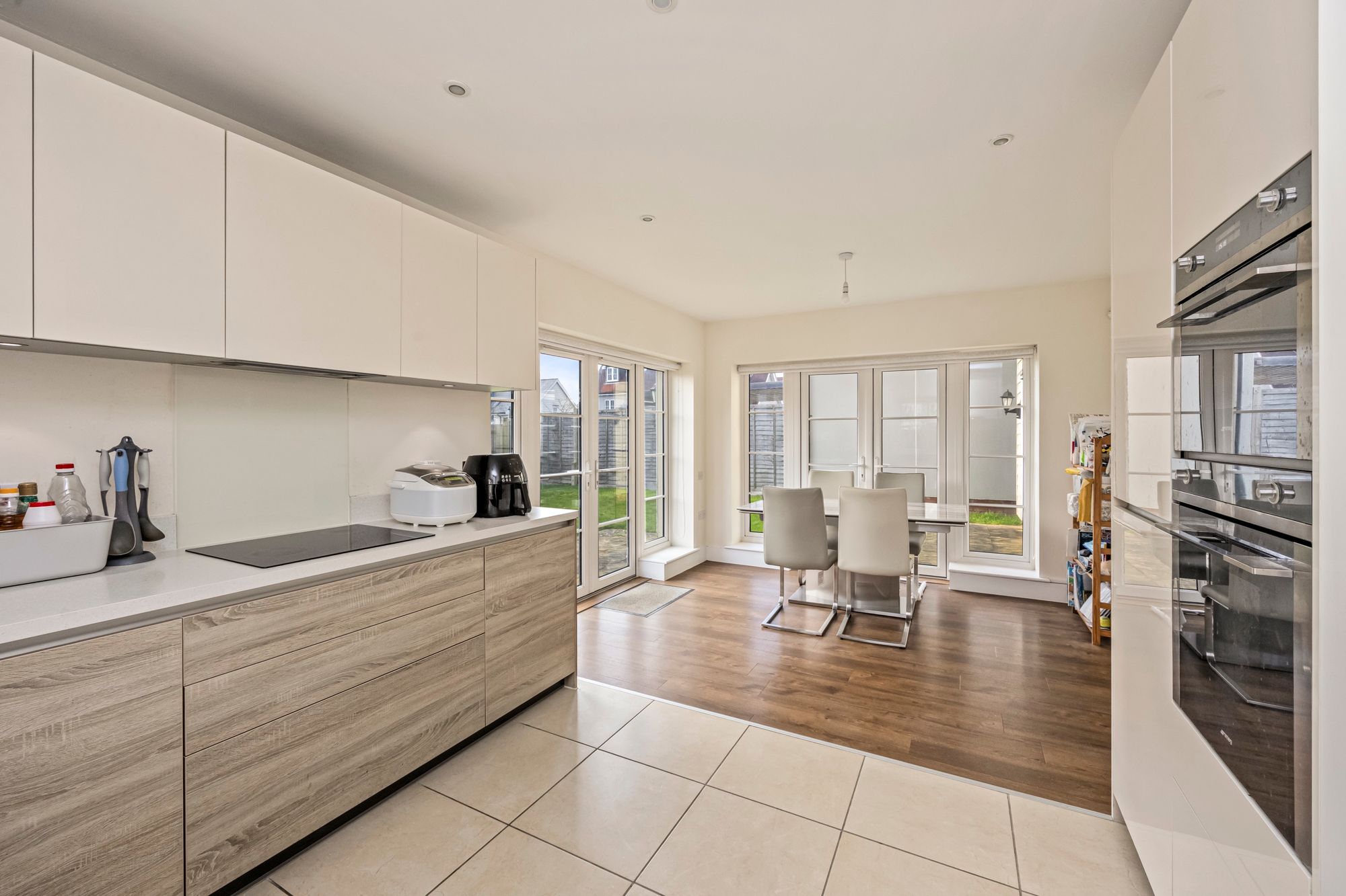 At the heart of the home is a stunning open-plan kitchen/diner, thoughtfully designed to create a sociable and functional space ideal for both everyday living and entertaining, with double doors opening onto the rear patio and garden — seamlessly blending indoor and outdoor living.