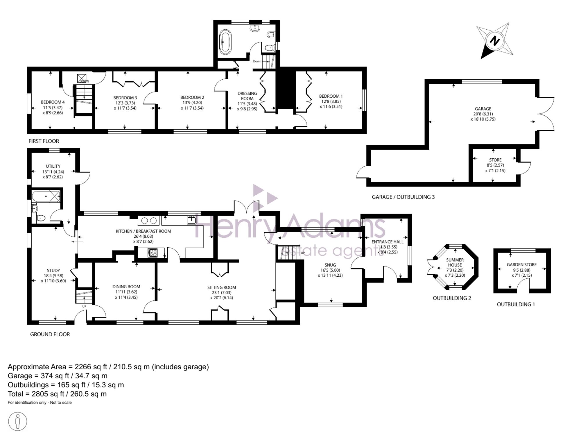 There are two staircases leading to the first floor from the snug or the study, where three double bedrooms and a further single bedroom can be found. A dressing room adjoins the principal bedroom, providing additional storage or a potential nursery space and a family bathroom serves the upstairs rooms.