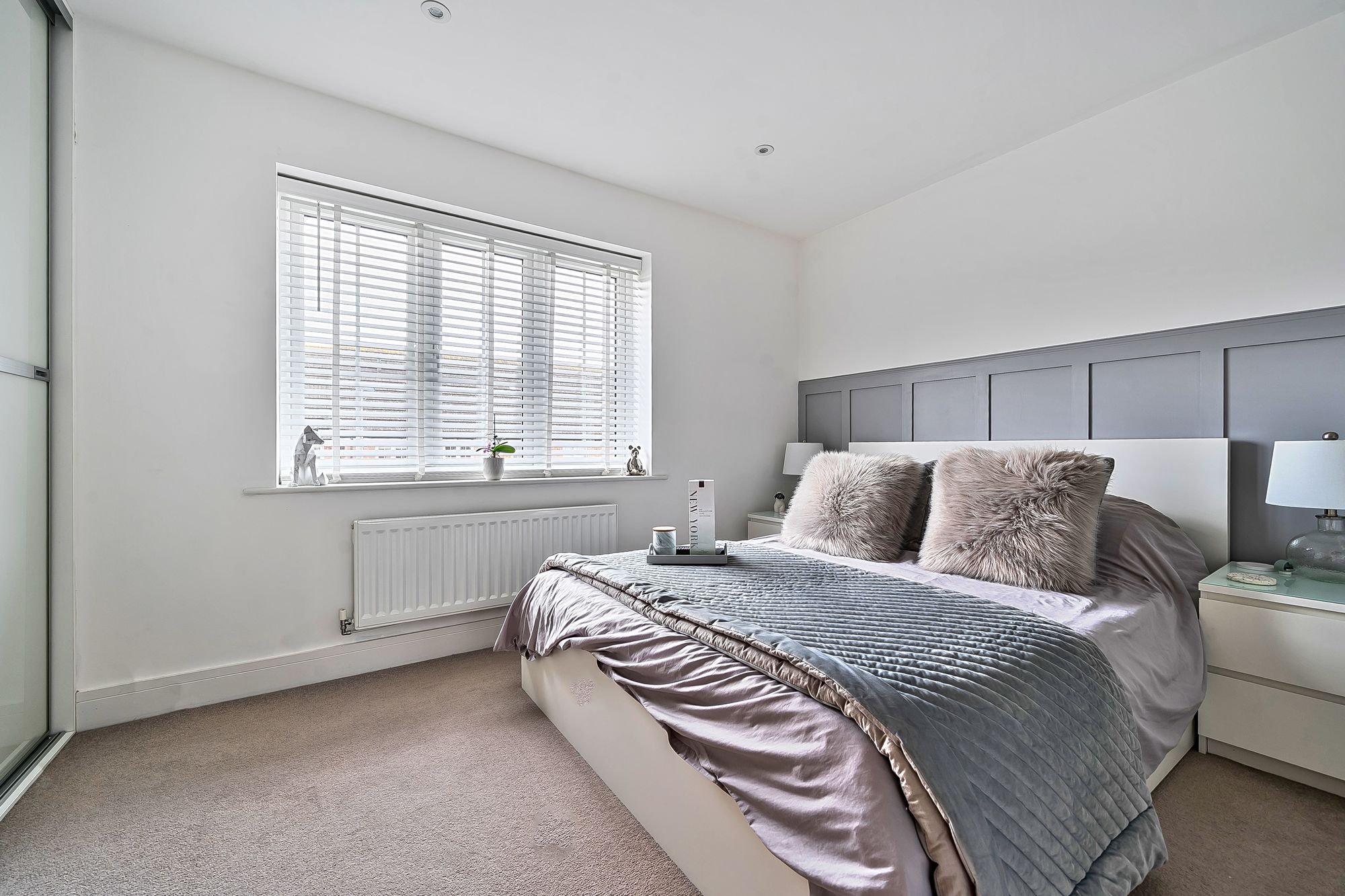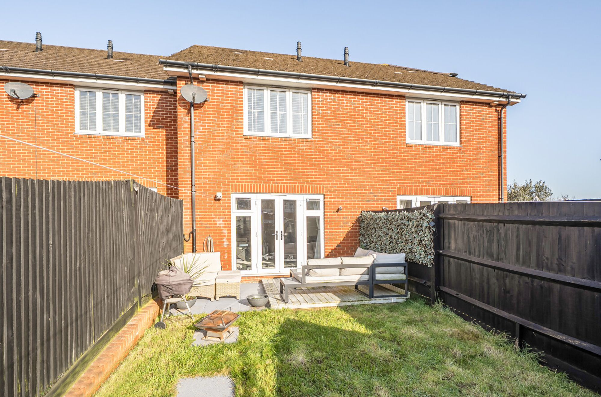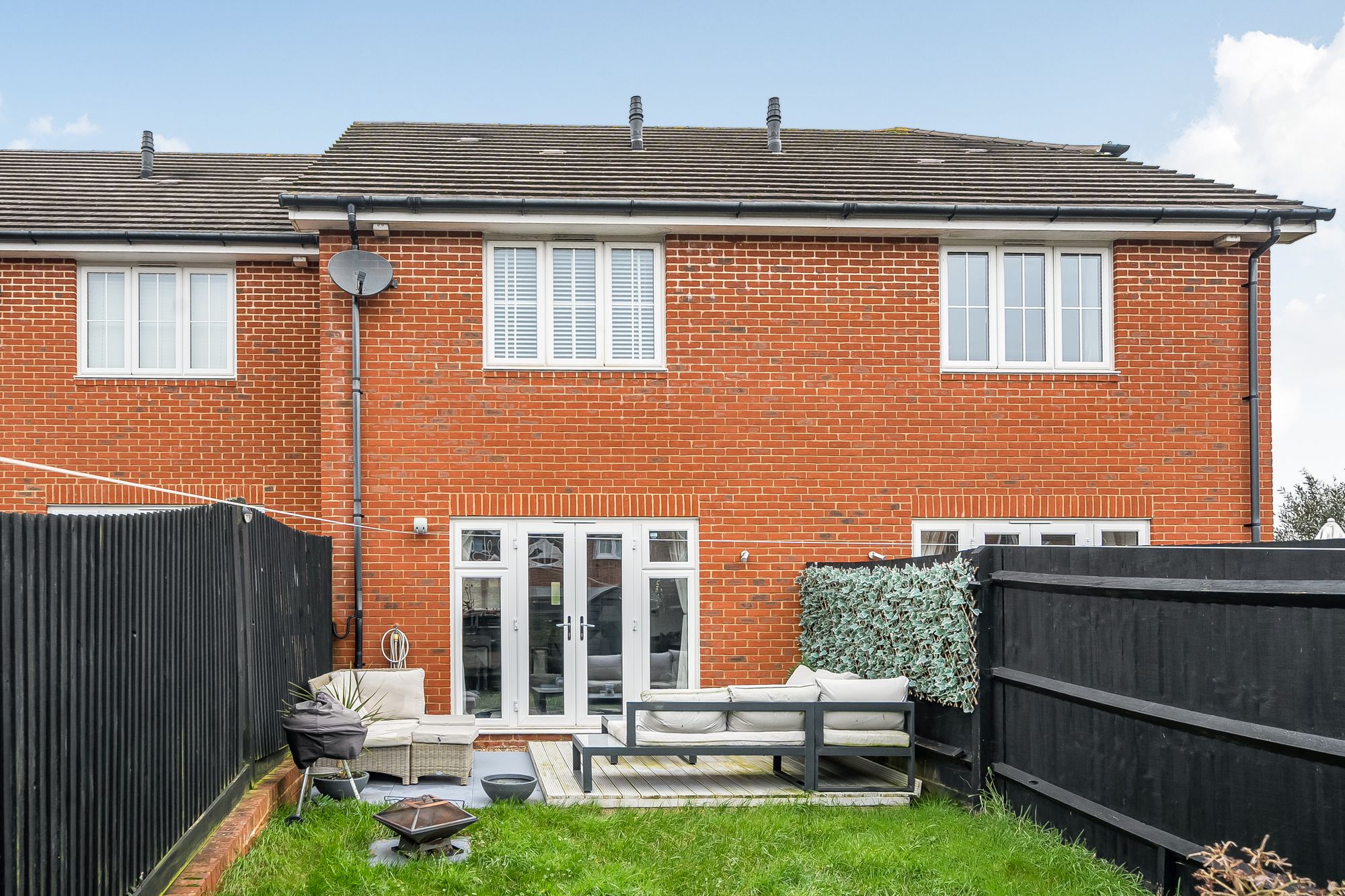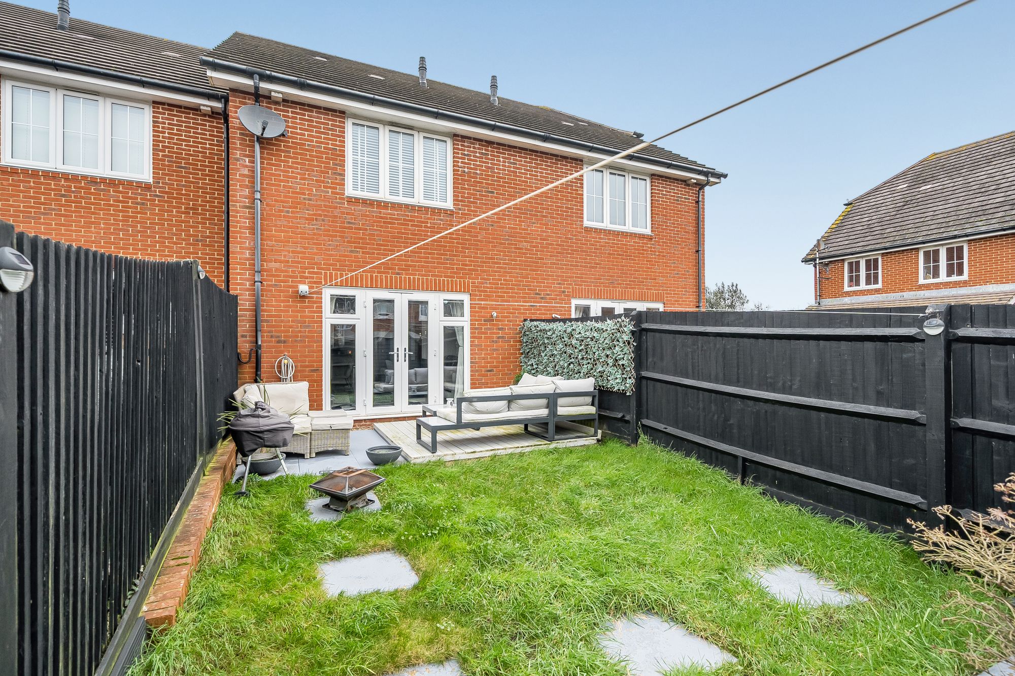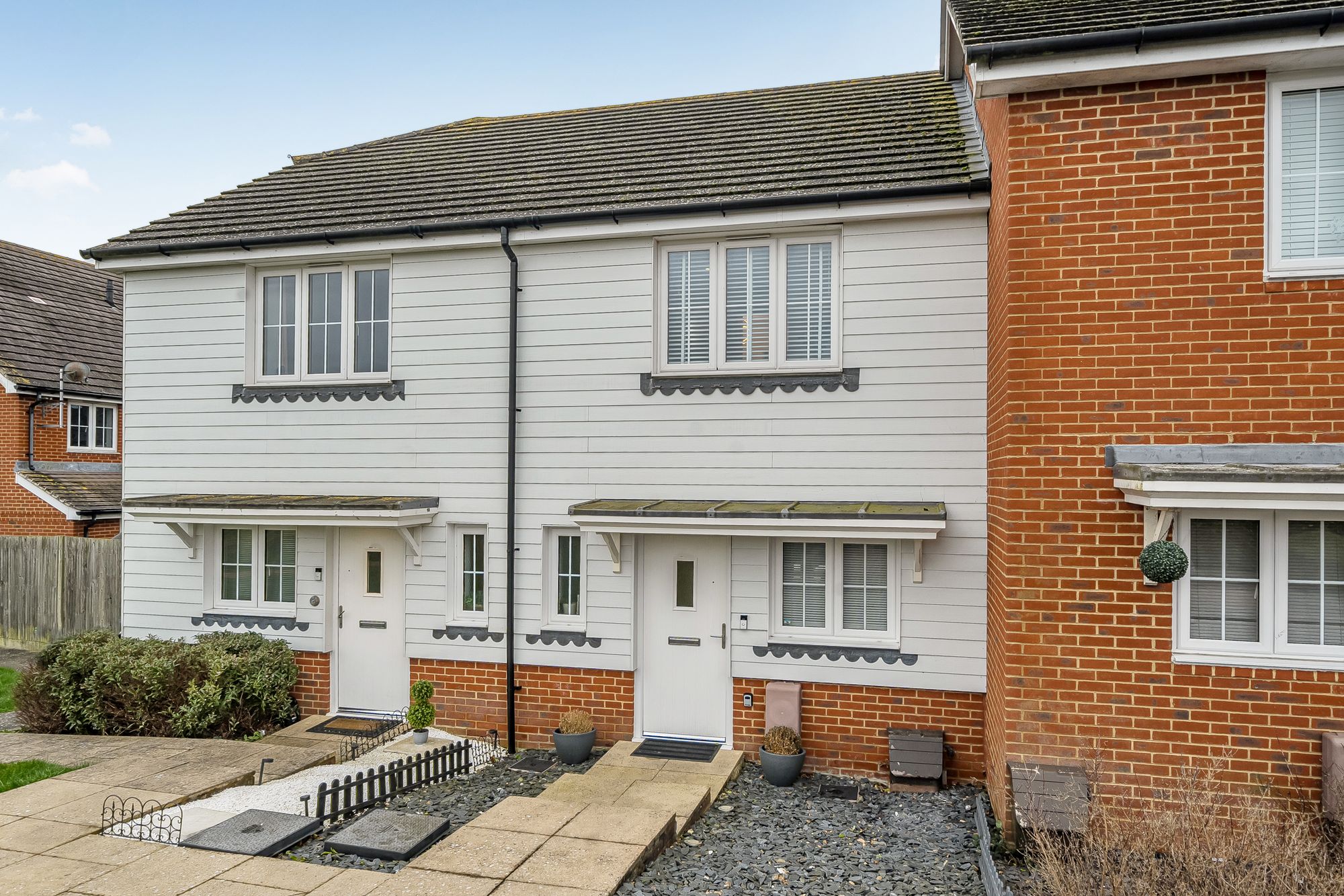 Upstairs, two generously sized bedrooms offer comfortable accommodation, each decorated to a high standard with fitted blinds and designed to maximise natural light. The stylish family bathroom is fitted with modern fixtures including Rainfall shower.