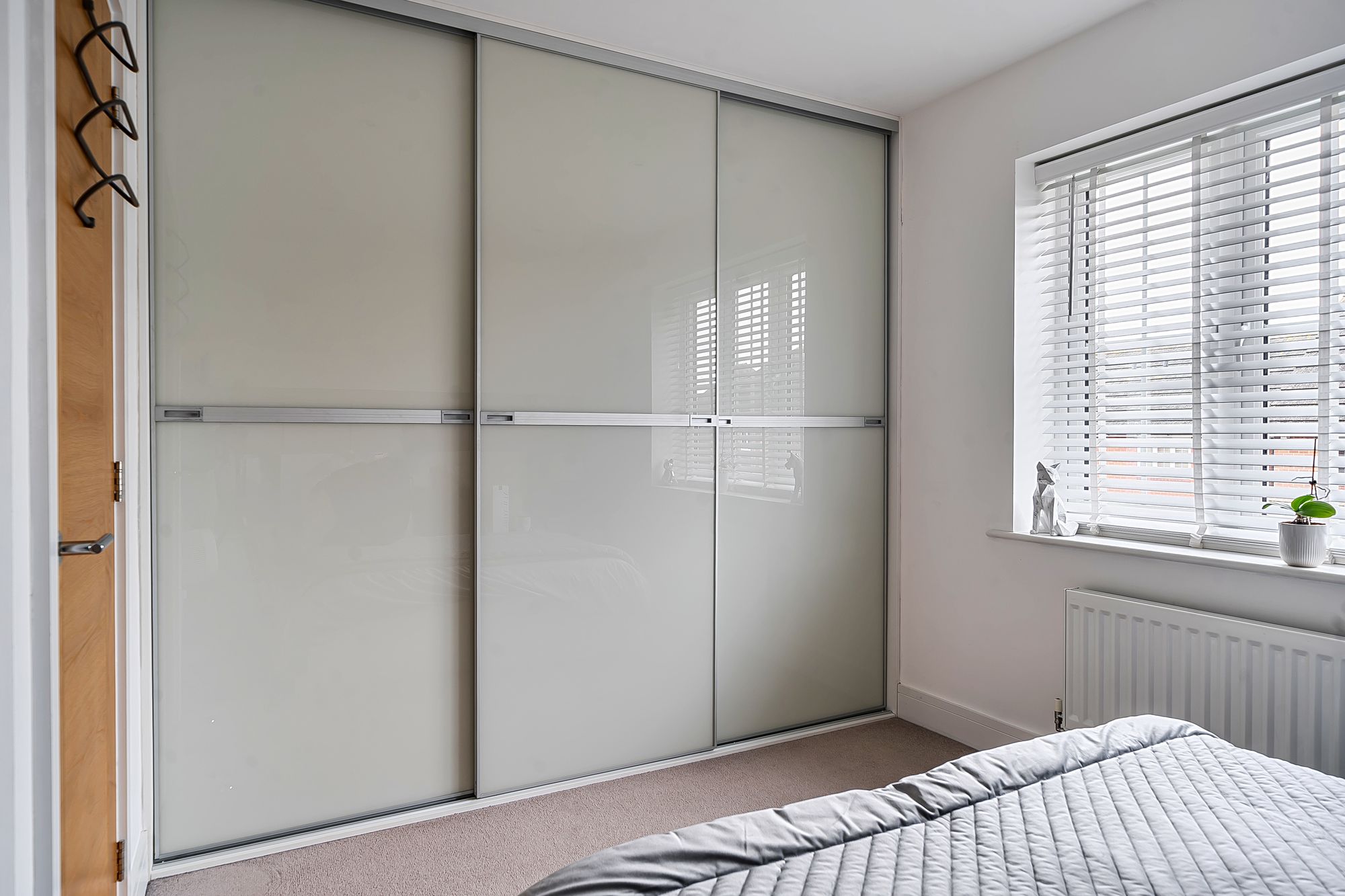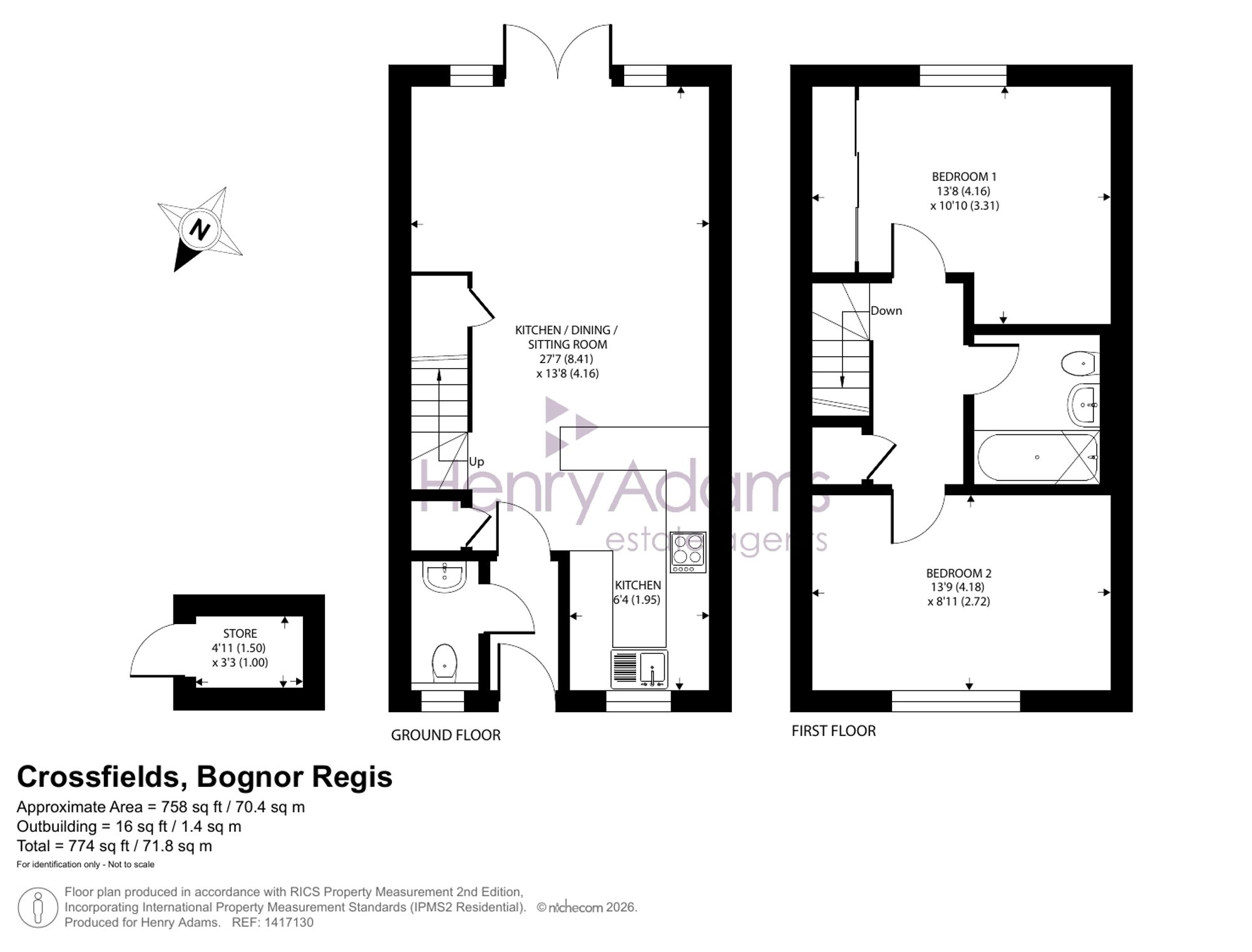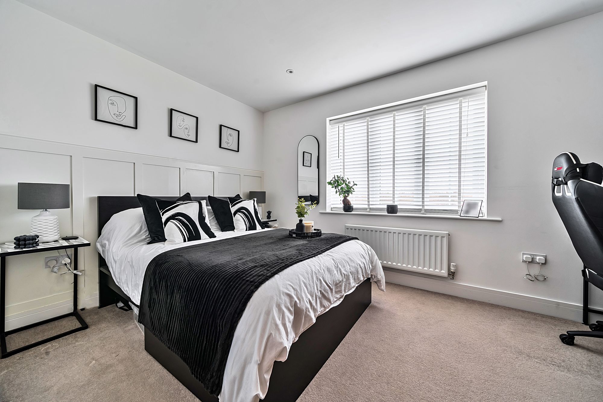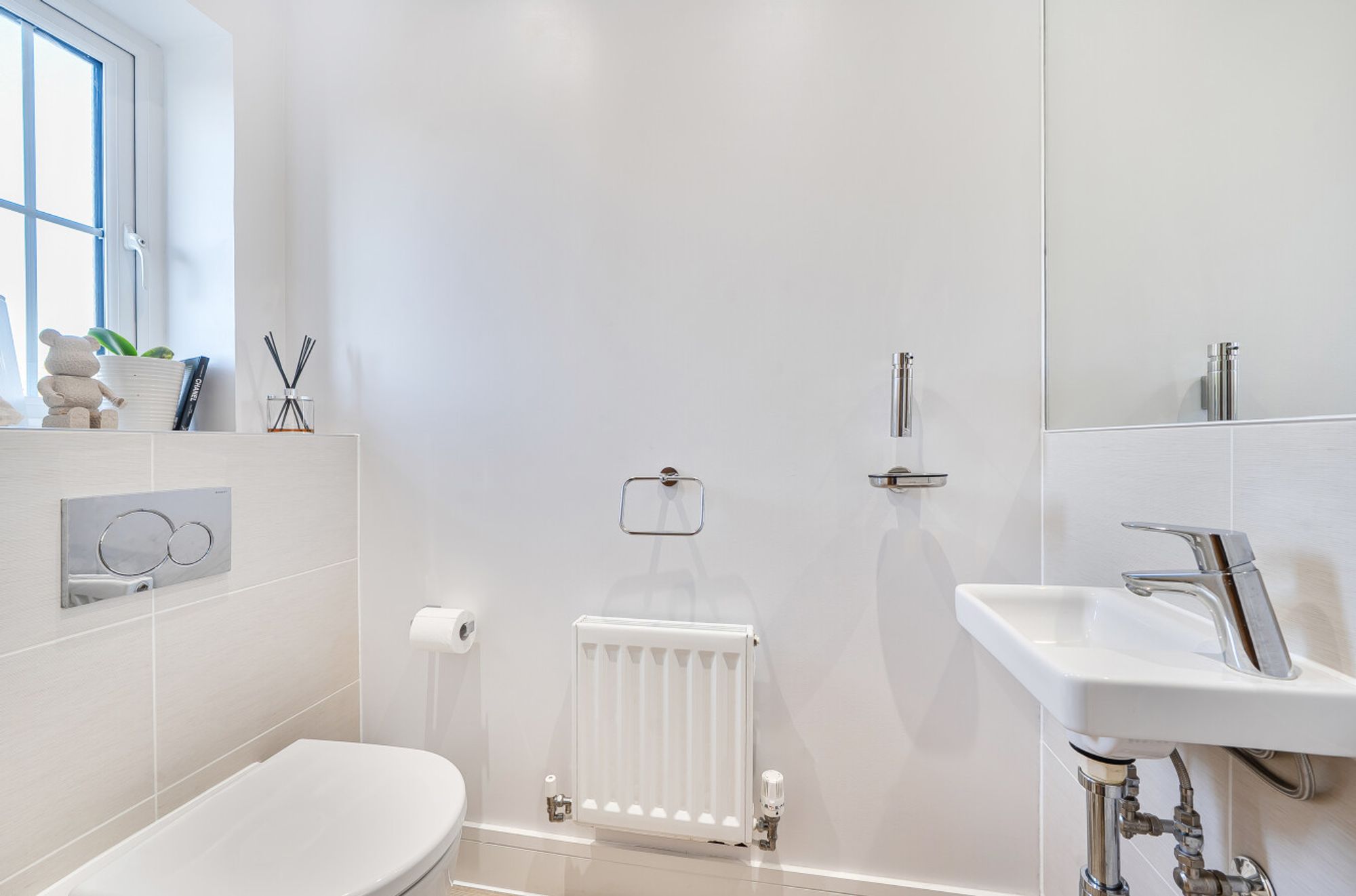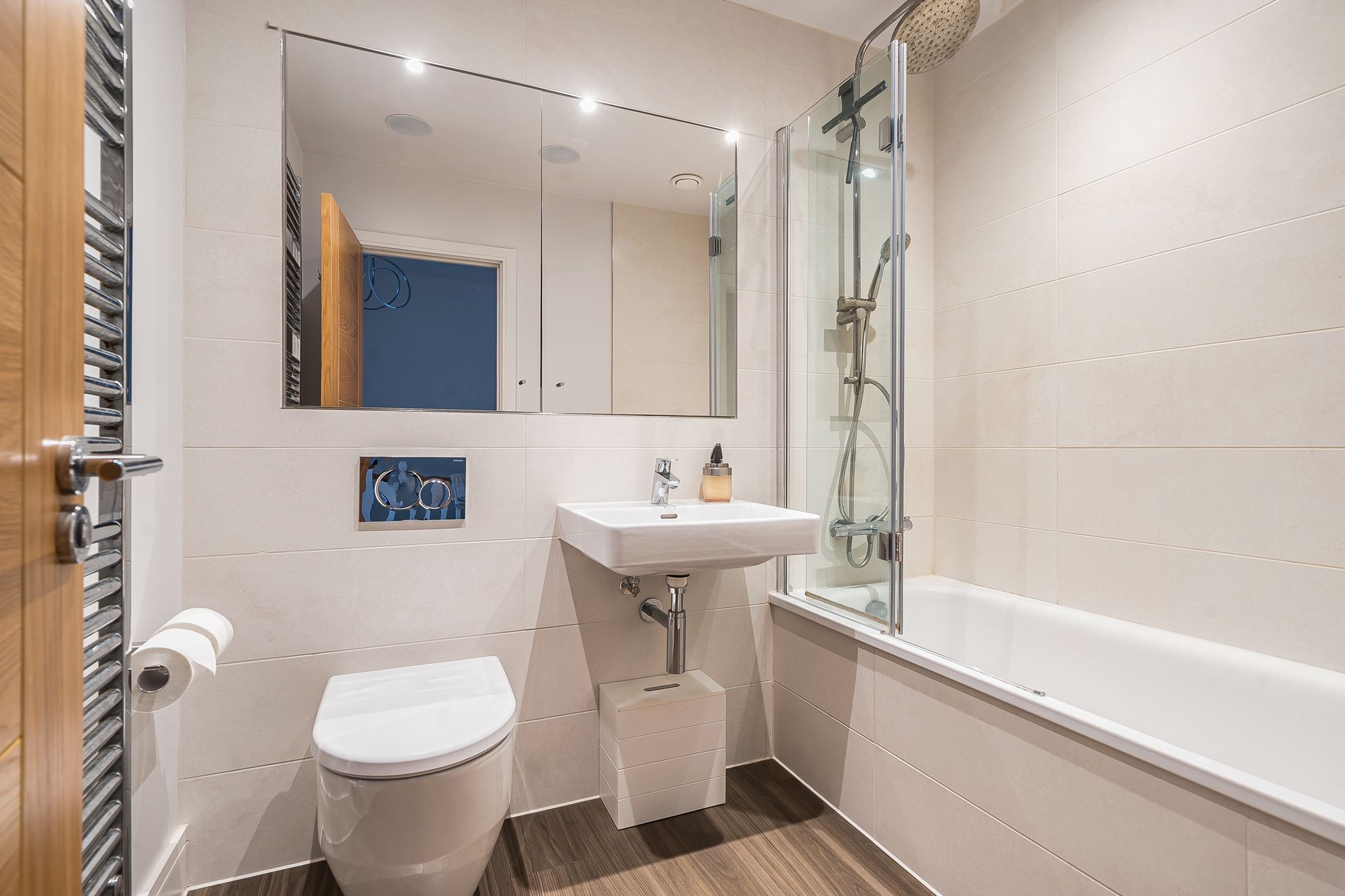 Upstairs, two generously sized bedrooms offer comfortable accommodation, each decorated to a high standard with fitted blinds and designed to maximise natural light. The stylish family bathroom is fitted with modern fixtures including Rainfall shower.