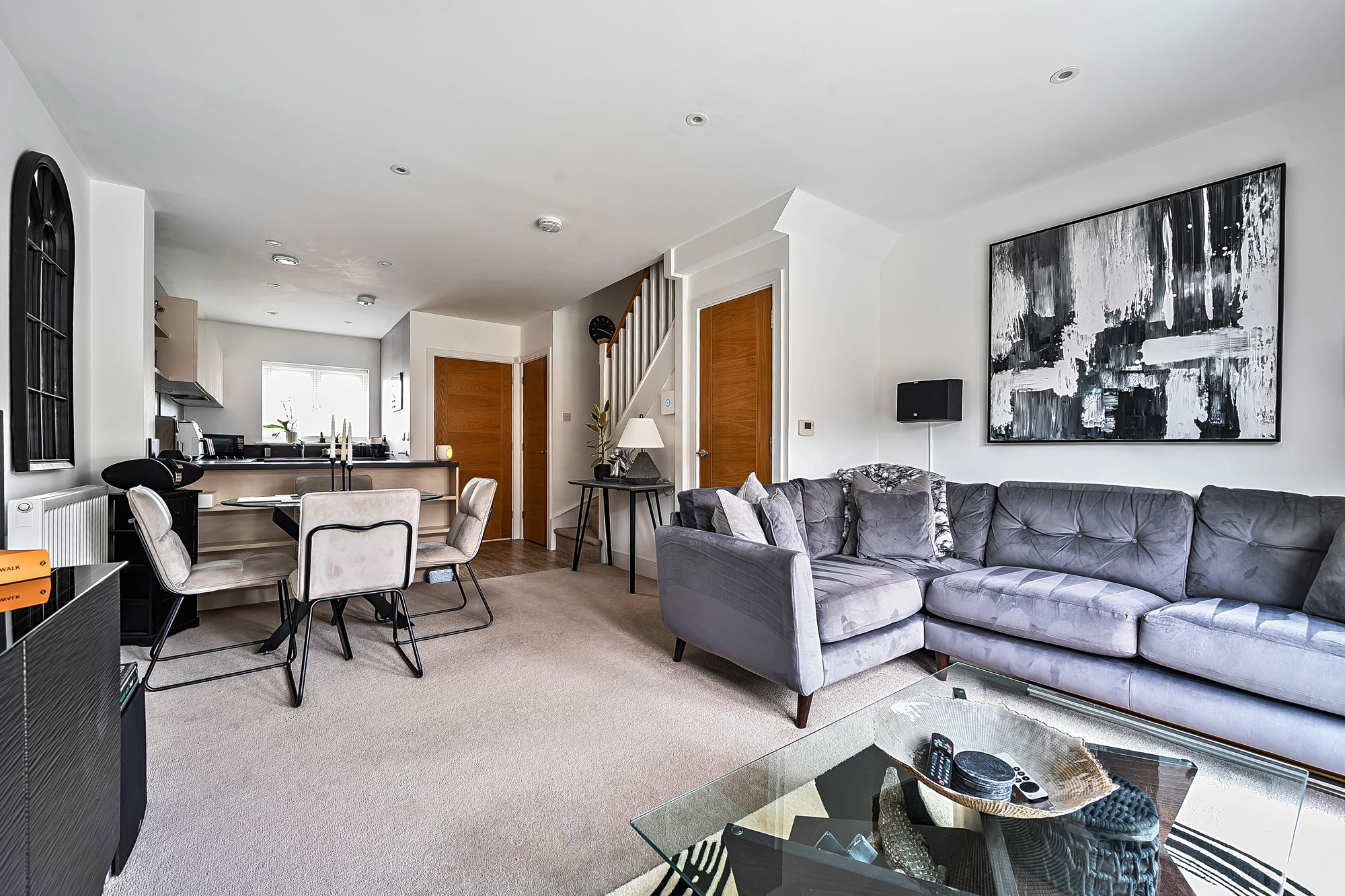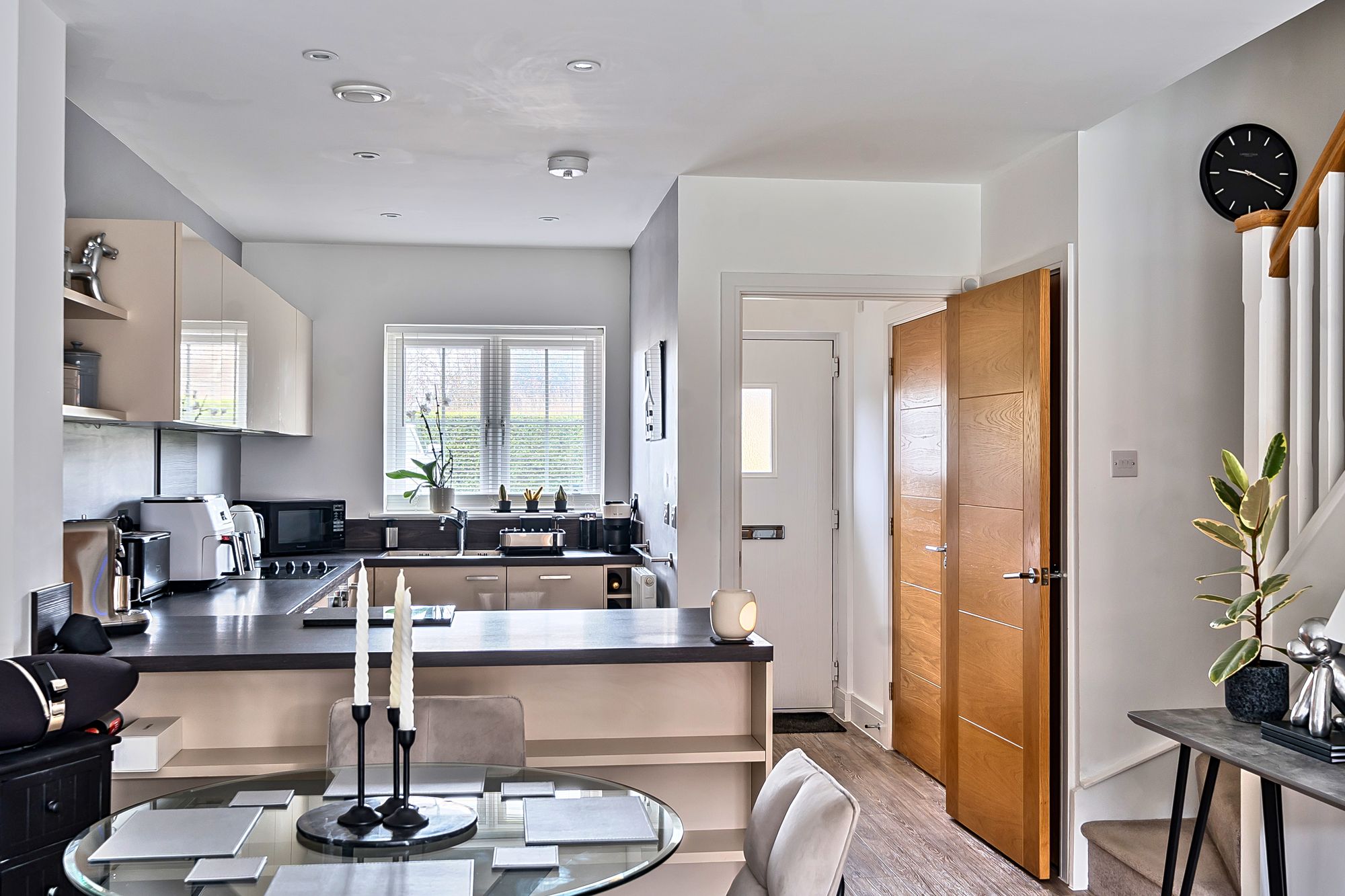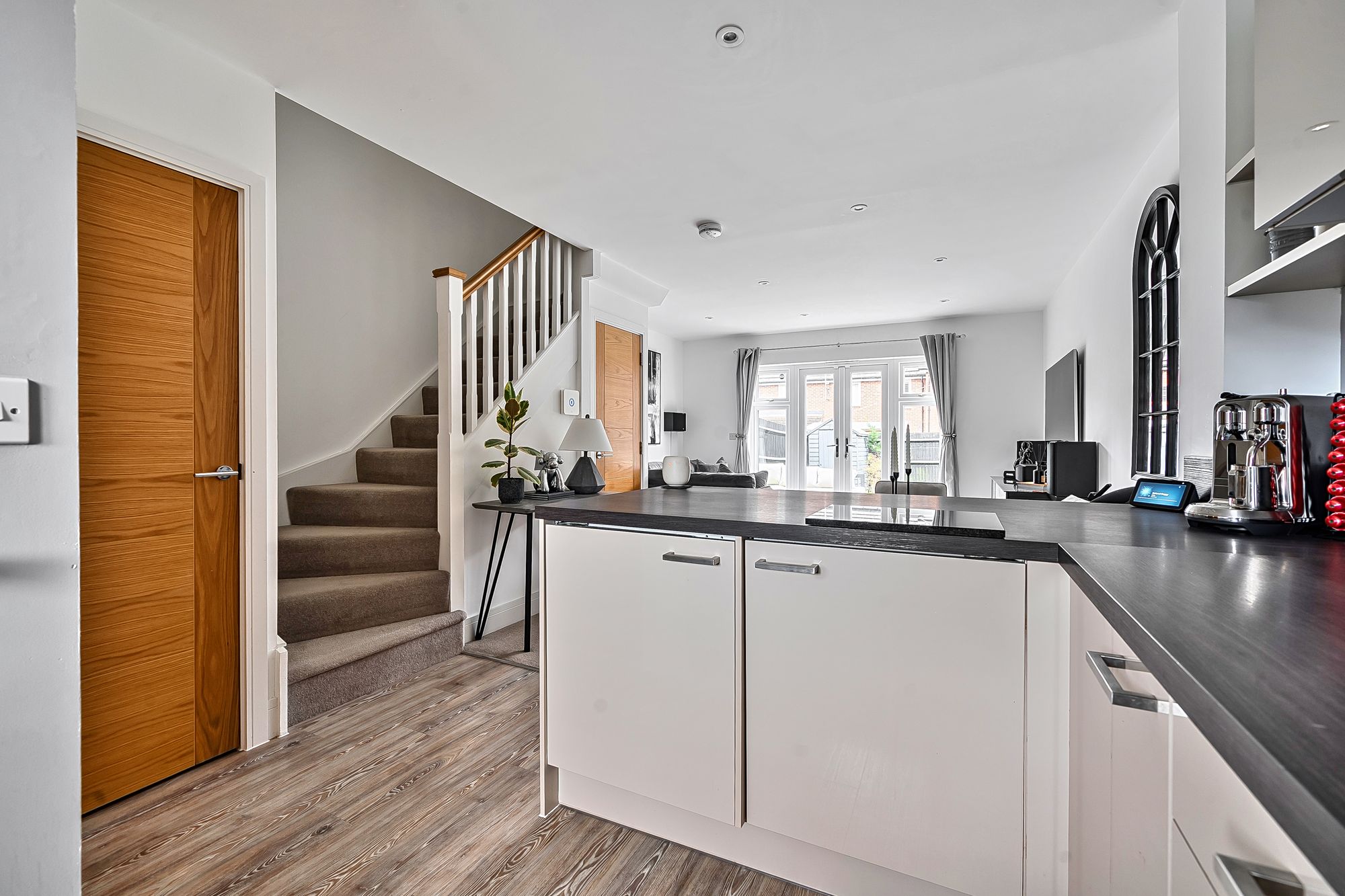 Upon entering, you are greeted by a welcoming hallway that leads into a spacious and tastefully decorated living area, where a state of the art integrated in-ceiling audio system provides seamless sound throughout the ground floor (ideal for entertaining or relaxing). The smart lighting system, installed in every room, allows you to tailor the ambience to your preference, whether hosting guests or enjoying a quiet evening in. The contemporary kitchen features high quality fittings and ample storage, blending effortlessly with the overall aesthetic of the property.