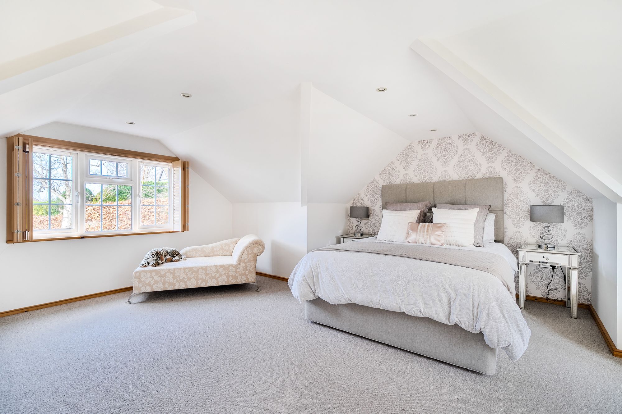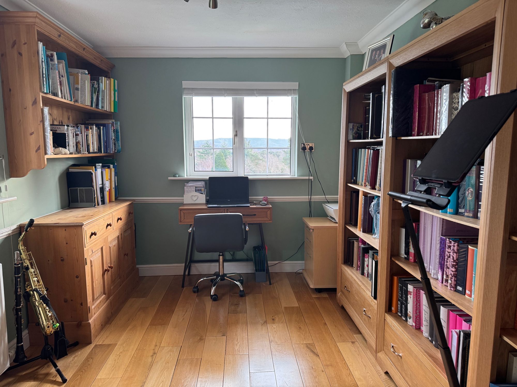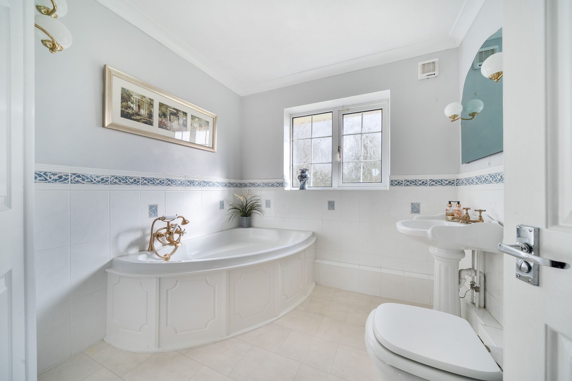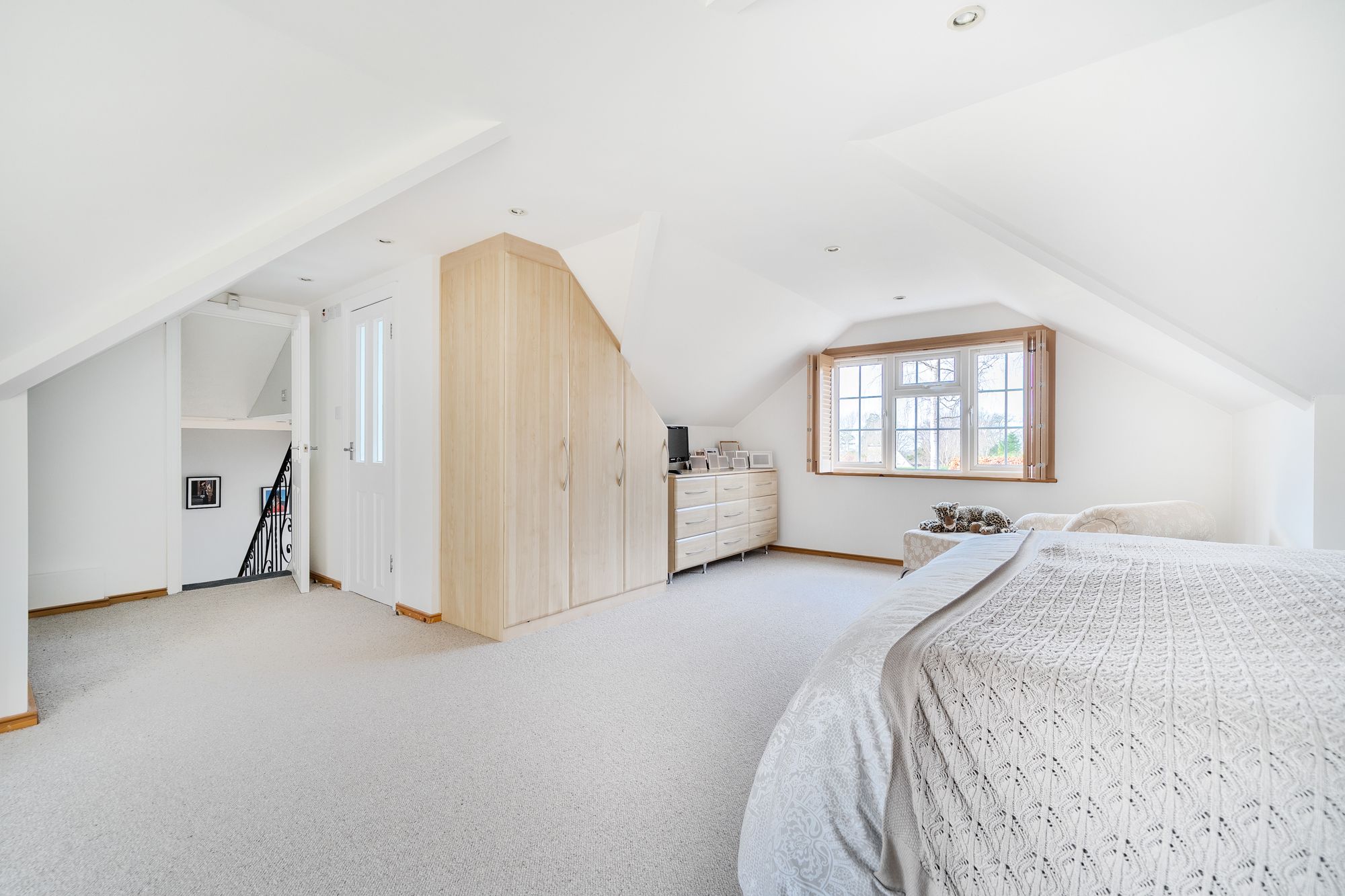 The principal bedroom boasts a Juliet balcony and an en-suite shower room, providing a peaceful retreat with lovely views. There are three additional double bedrooms two of which have en-suite bathrooms. A fifth double bedroom is being used as a study. The property is finished to a high standard throughout, combining modern comforts with a sense of light and space.