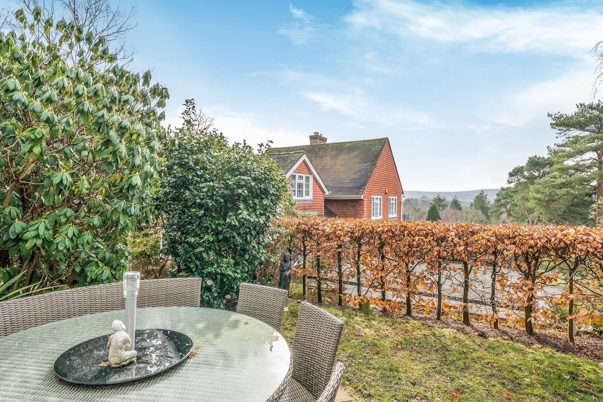 The outside space is equally impressive oasis, with delightful gardens extending to just under an acre. The gardens are beautifully landscaped, featuring a wide variety of mature plants and shrubs, providing year-round interest and colour. There are several seating areas positioned to make the most of the views and sunshine, ideal for outdoor dining or enjoying the tranquil surroundings.