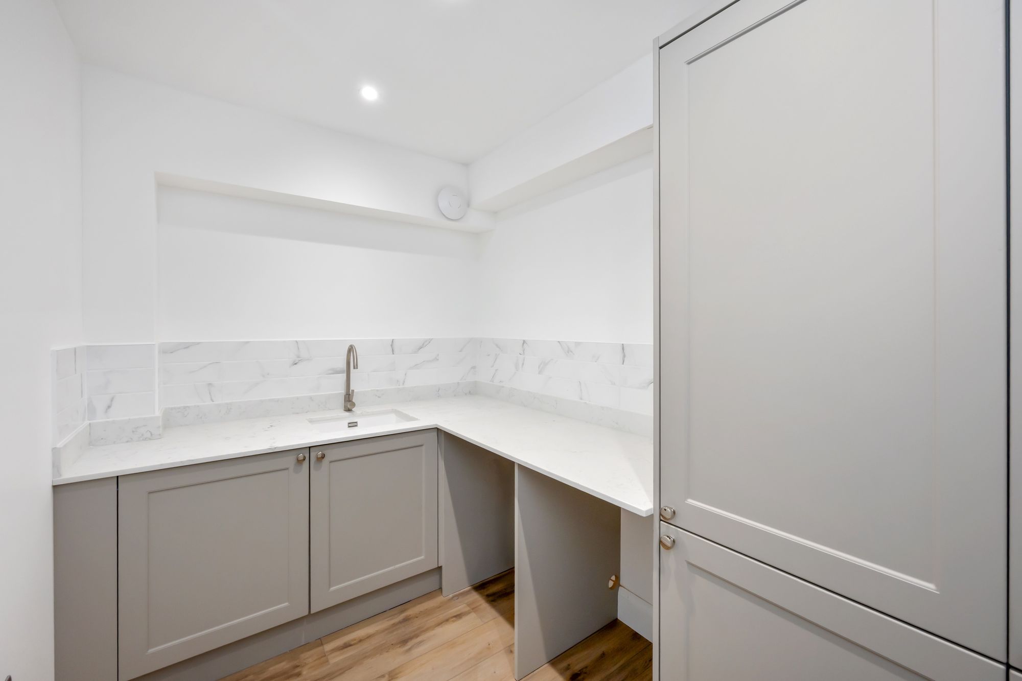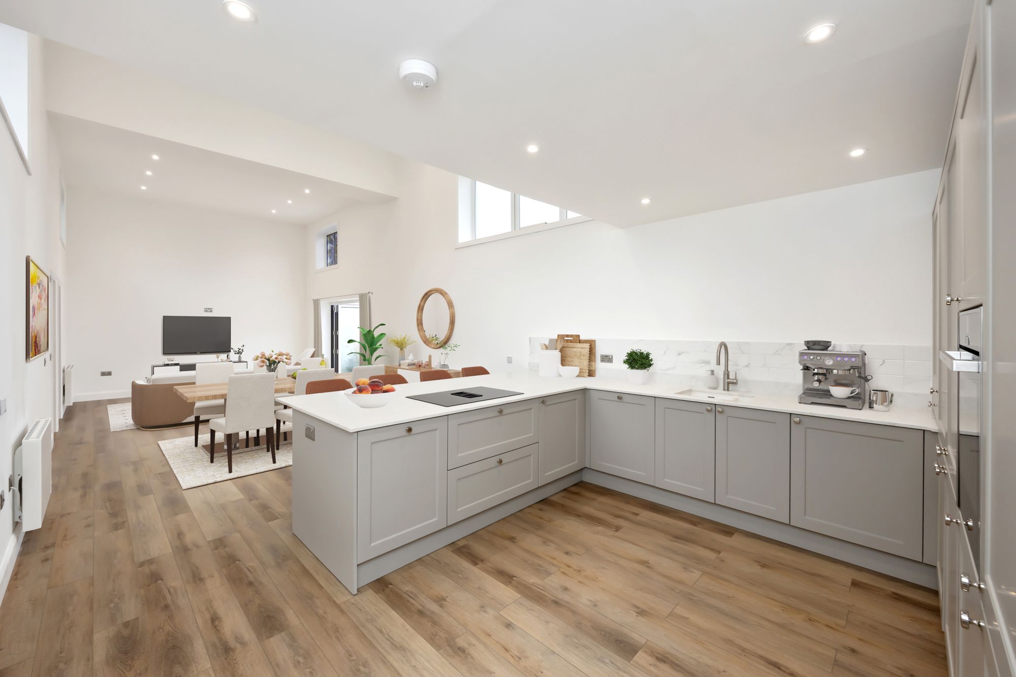 Stepping through into the rest of the ground floor living space you are greeted by elegance and a vast double-height living space. Retaining and complimenting some of the original features, including stain glass window, this room exudes charm and offers a space ready to welcome family and guests into the social space and hub of the home. The kitchen is fully fitted with shaker-style bespoke cabinetry (Brighton and Hove Kitchens), which is complimented by high quality fittings such as a Quooker tap (hot, cold and boiling), Neff oven, and a butler sink surrounded by granite worktops, and a peninsular breakfast bar with space for stools. The room then provides space for both dining and living areas too, with bifold doors out to the walled garden space perfect for Al Fresco dining and a space to make your own. The ground floor also features the principal bedroom with en-suite shower room, a separate utility with laundry facilities and separate cloakroom.