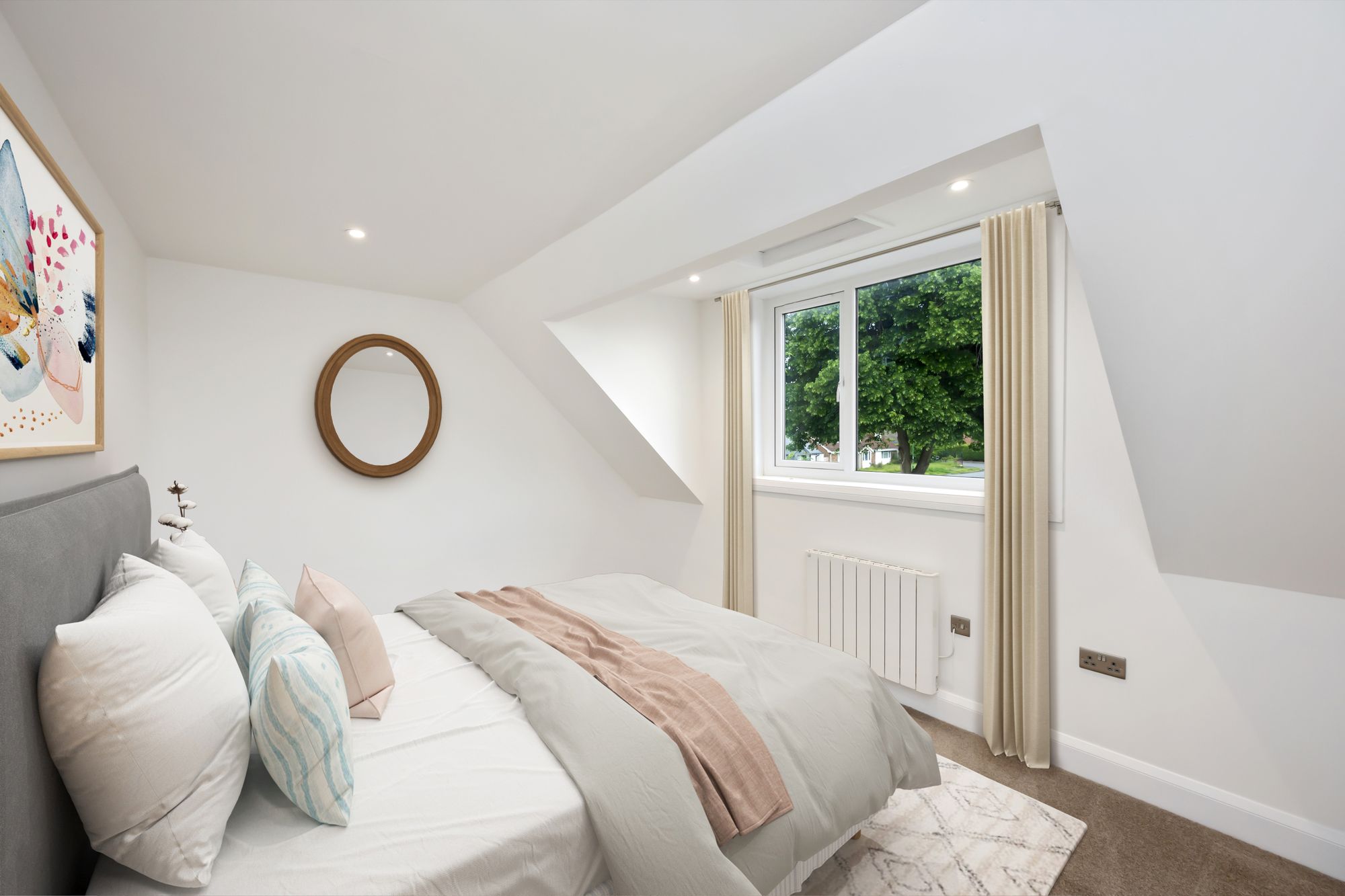 Upstairs, the further two double bedrooms, one of which boasts a large picture window overlooking the living space, and a main bathroom fitted with both shower cubicle and fitted freestanding bathtub ready for those relaxing bubble bath evenings, perfectly complimented by a glazed tile wall in a herringbone pattern, and finishing the room is the wc. and separate wash basin vanity unit with mirror above.