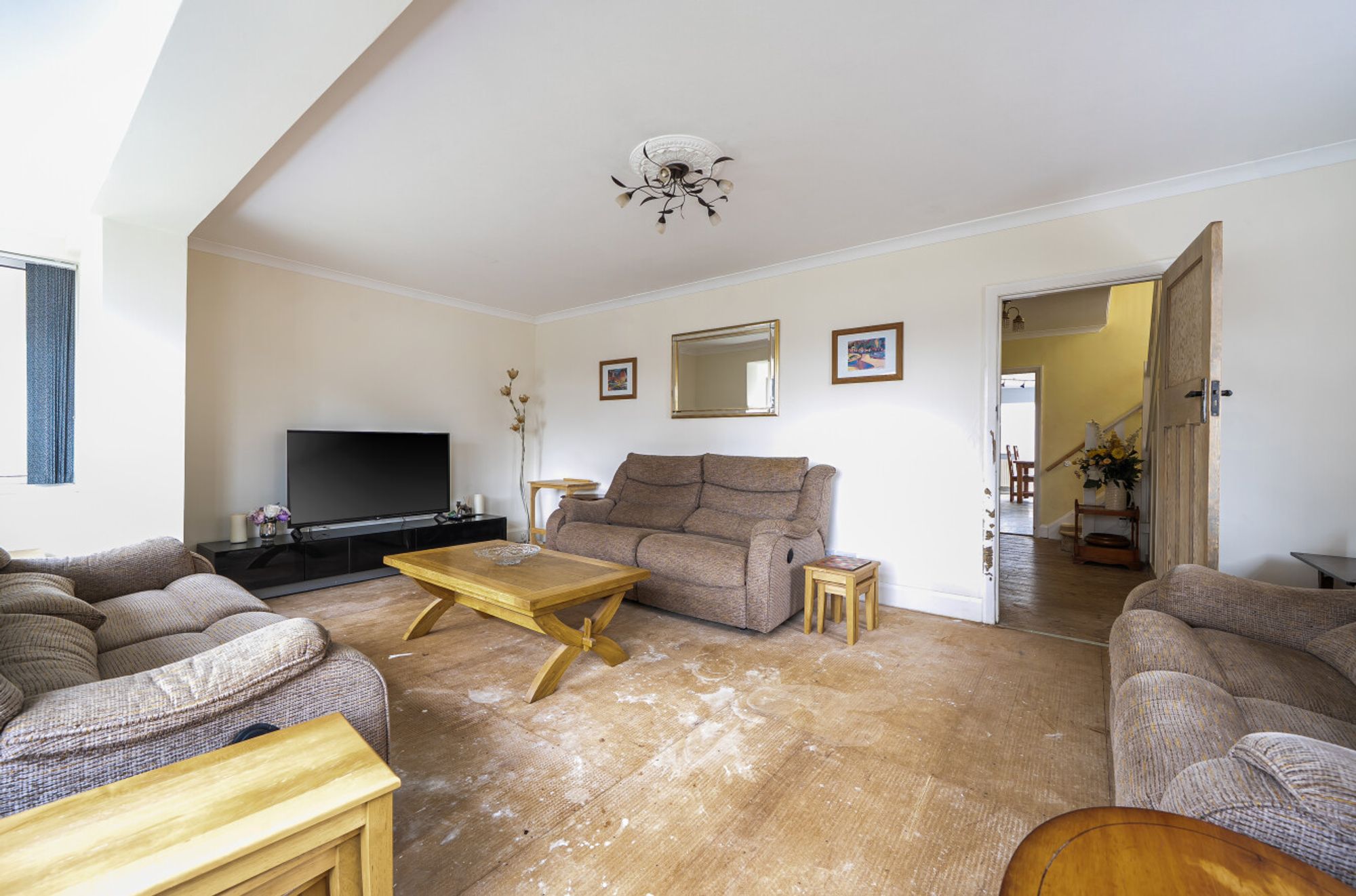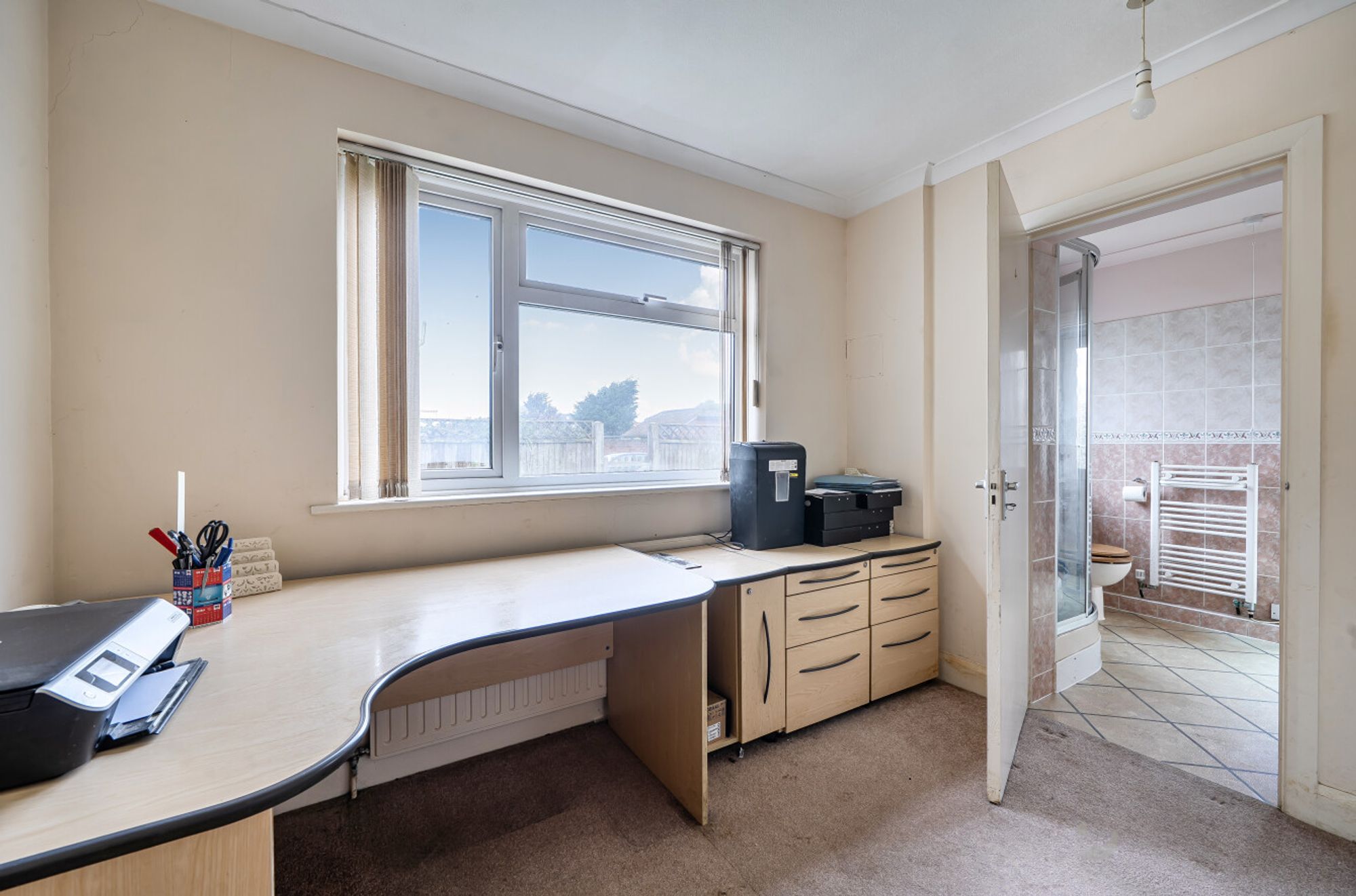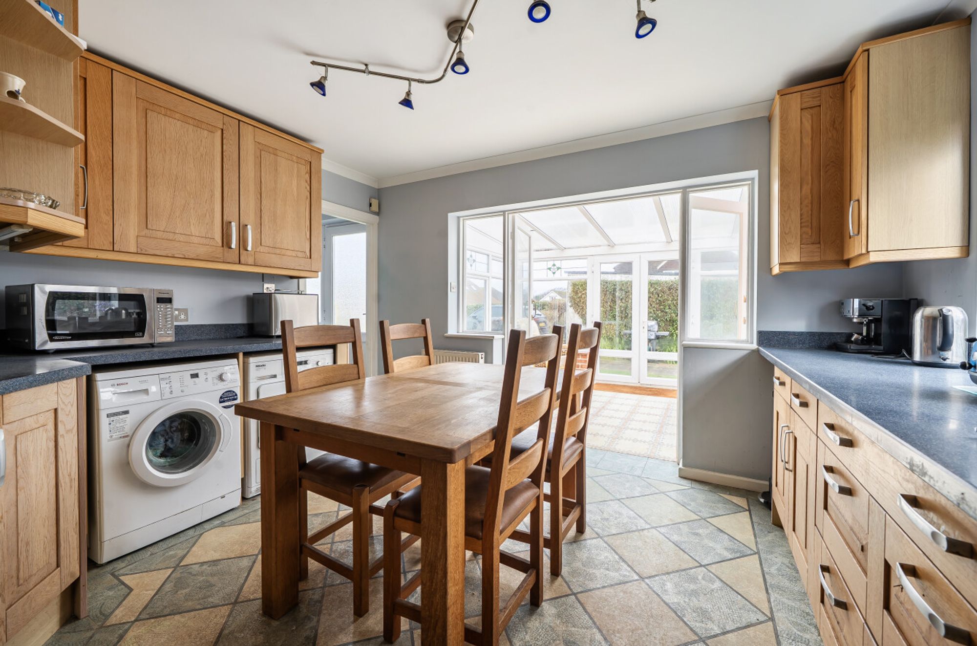 Stepping outside, the garden wraps around the property and provides ample parking via two separate driveways, one to the front and one at the end of the garden which leads to the garage and store. The garden itself is mainly laid to lawn with an area of patio.