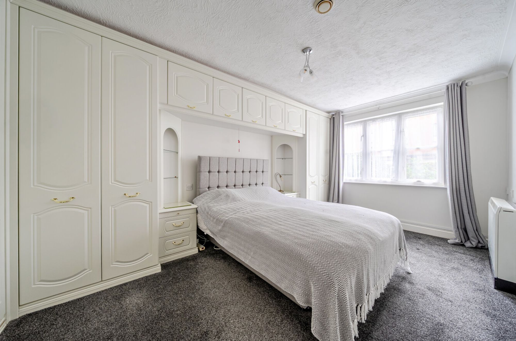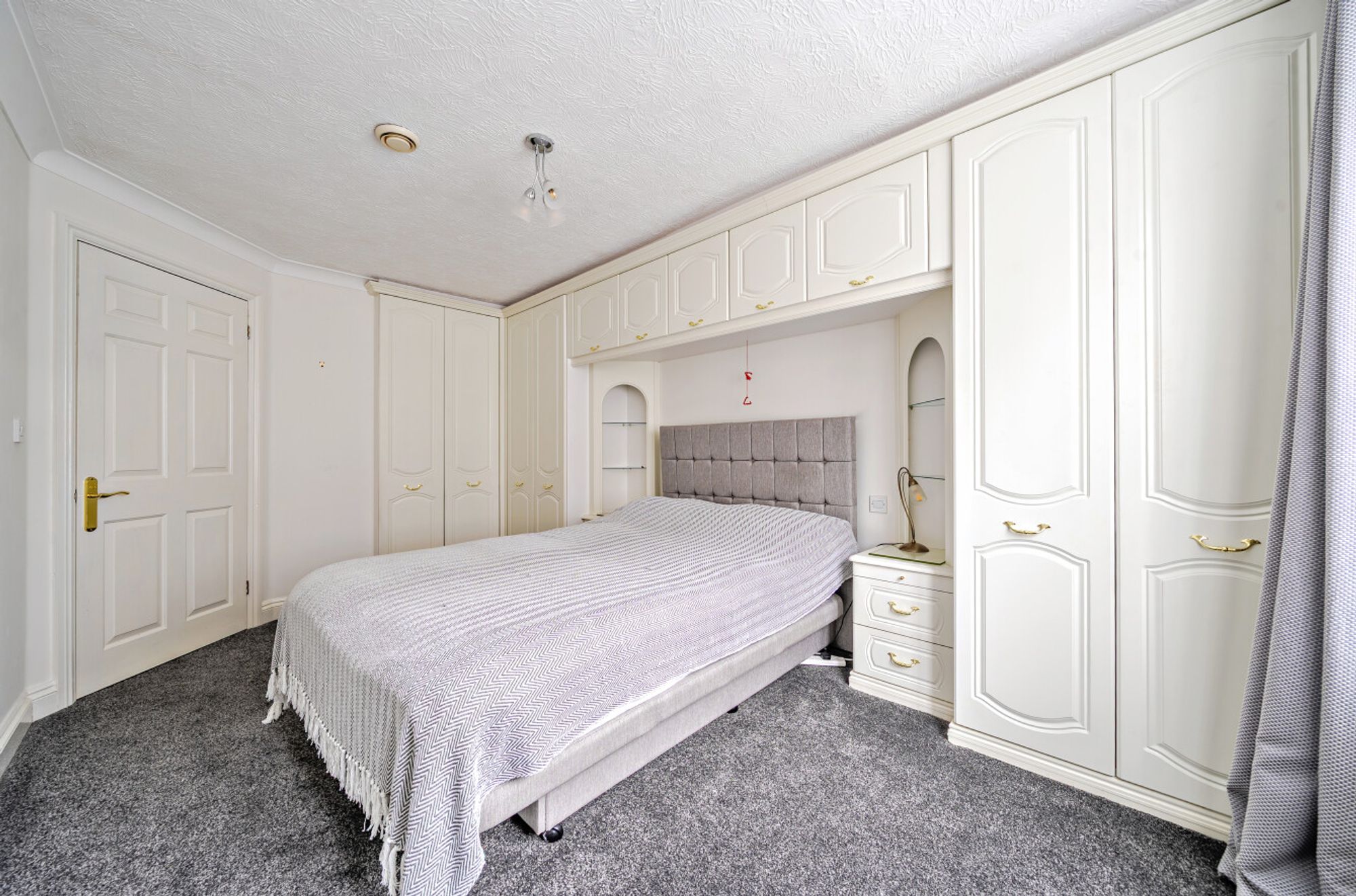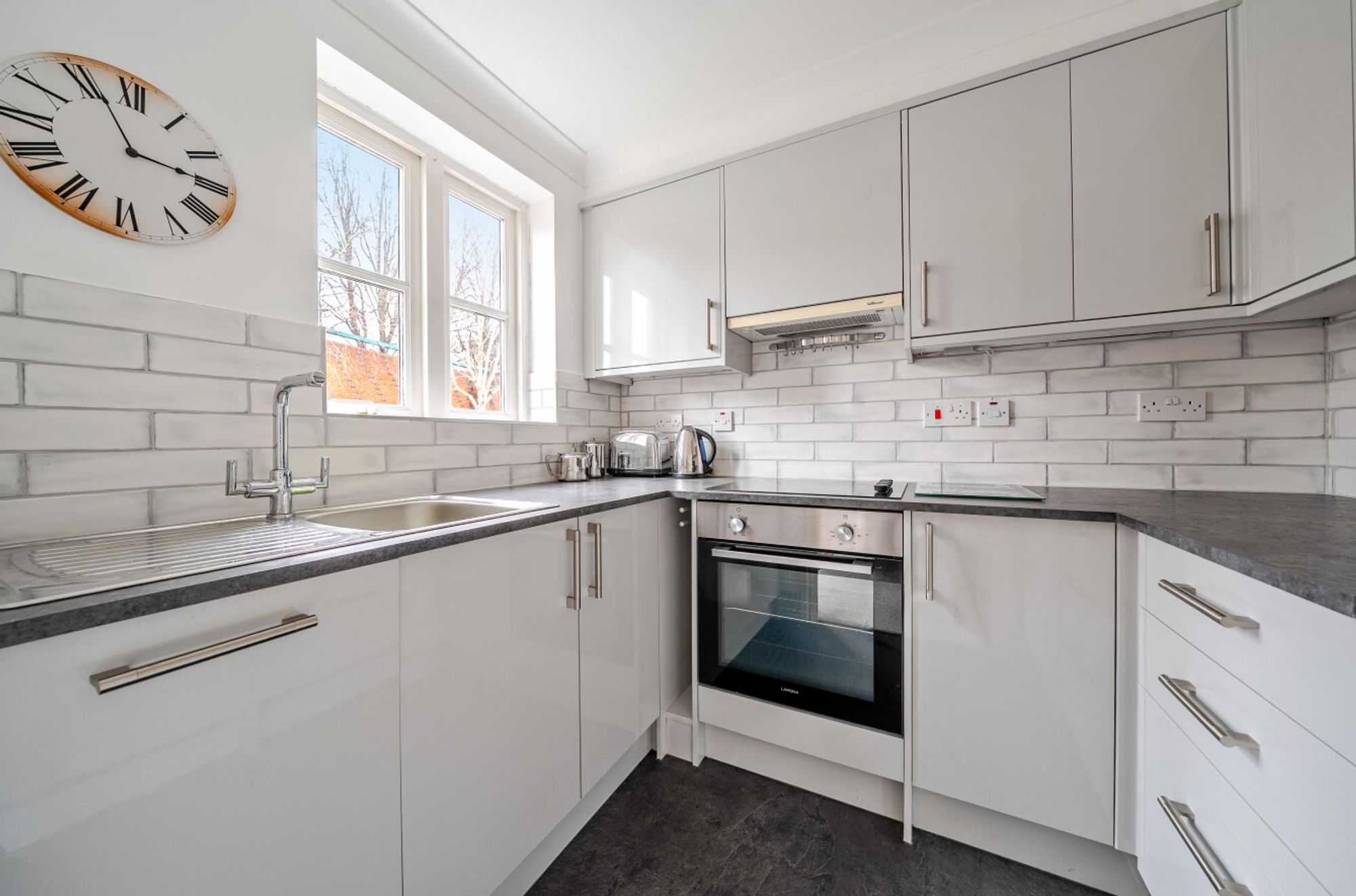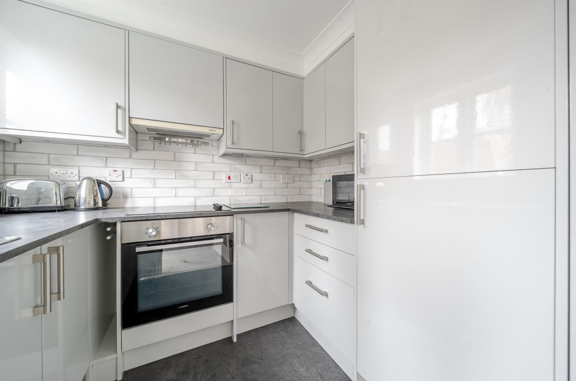 The fully updated fitted kitchen is finished with grey-fronted cupboards and includes an integrated electric oven, ceramic hob, cooker hood, fridge and freezer.