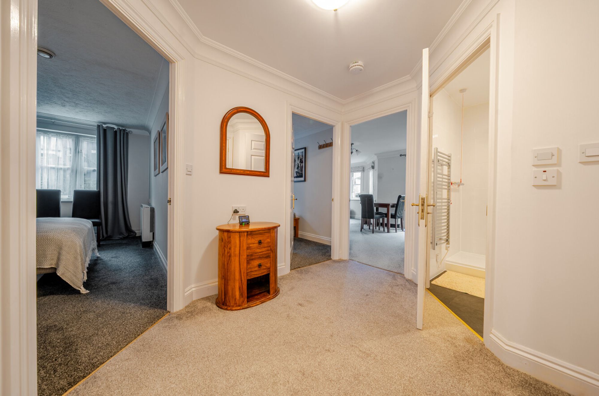 There are two well-proportioned bedrooms, both benefitting from built-in furniture, along with a modern shower room featuring a walk-in shower.