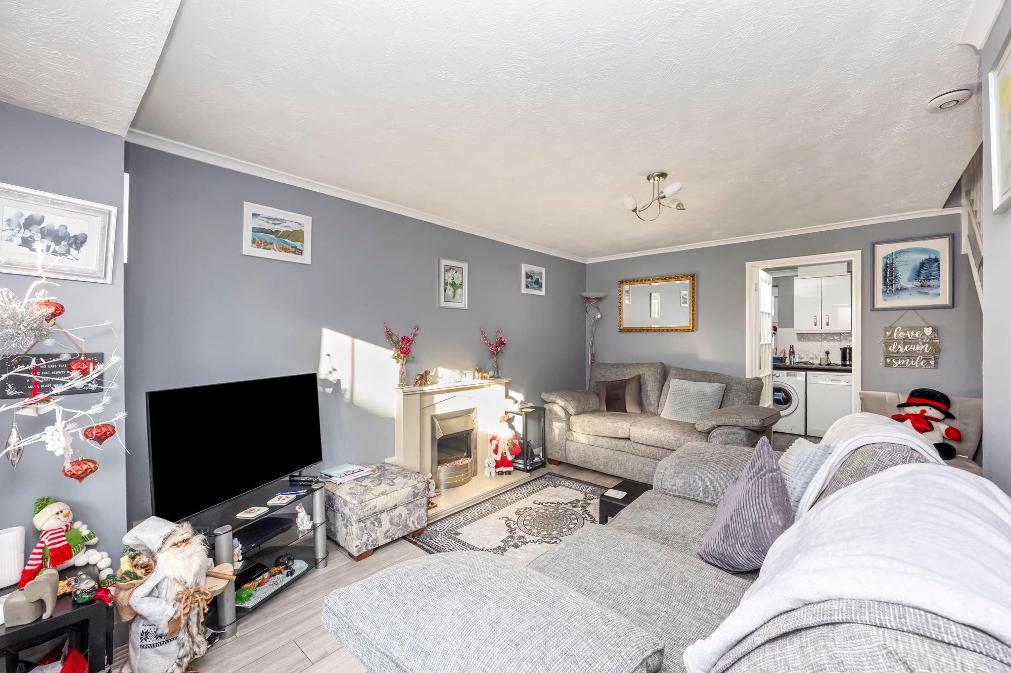 There is a modern kitchen and separate dining room and to the rear is a lovely sun room overlooking the rear garden.