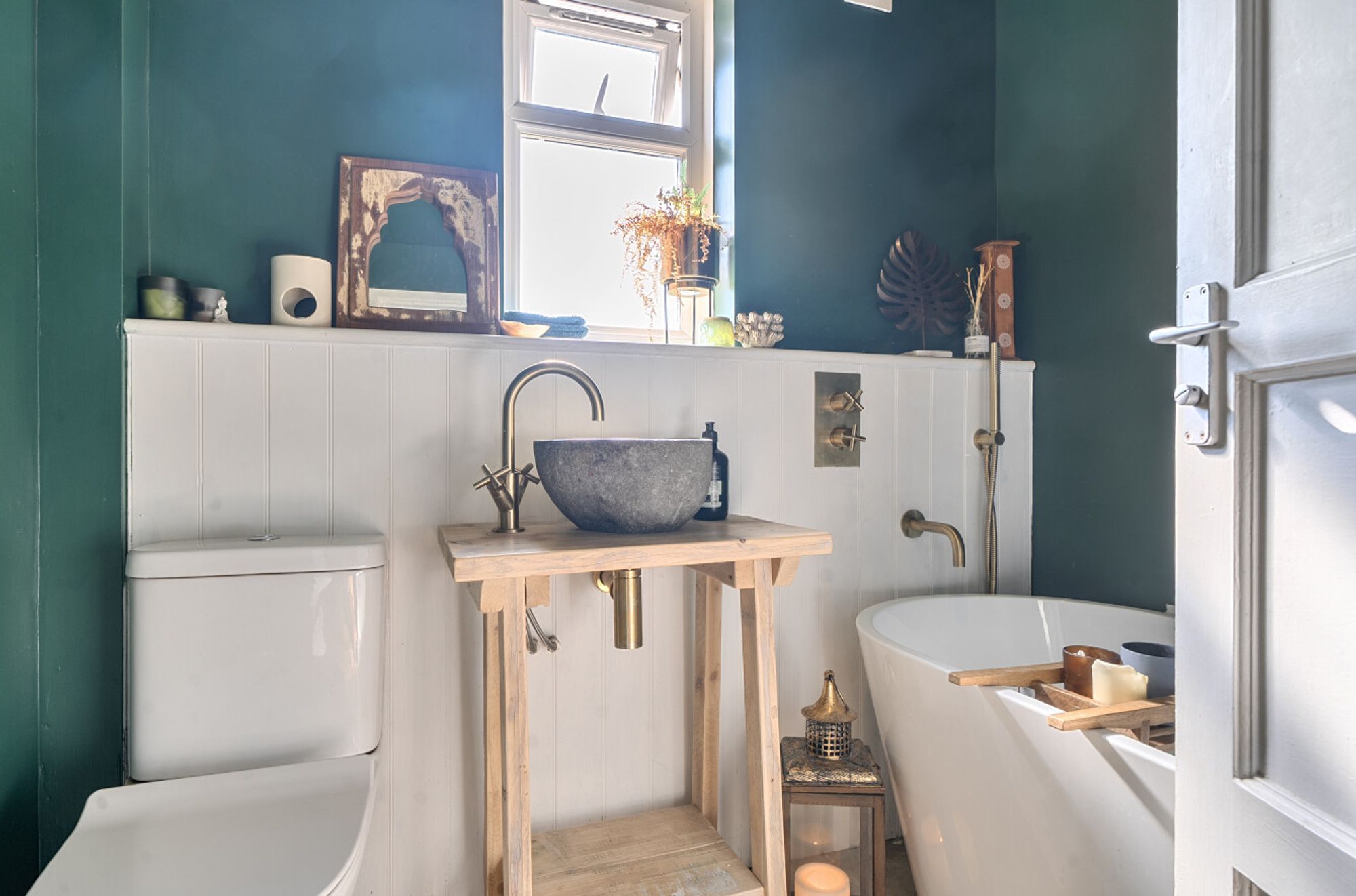 The accommodation comprises an entrance hall leading into a delightful dual-aspect sitting room, featuring a cosy wood burner. To the rear, a beautifully designed shaker-style kitchen boasts striking deep blue units, contrasting worktops, a butler sink and space for a range-style cooker. This space flows seamlessly into a bright dual-aspect dining area, perfect for entertaining. The ground floor also benefits from a refitted contemporary bathroom, complete with a freestanding bath.