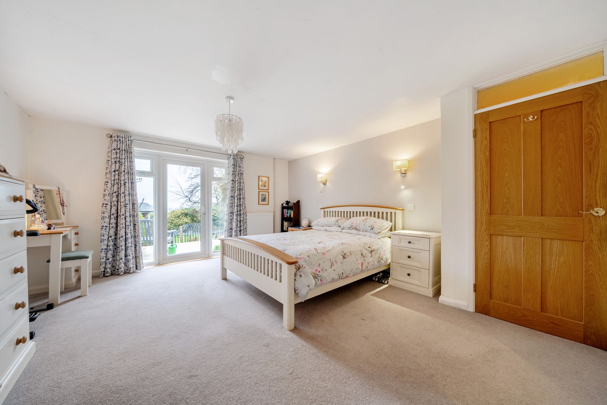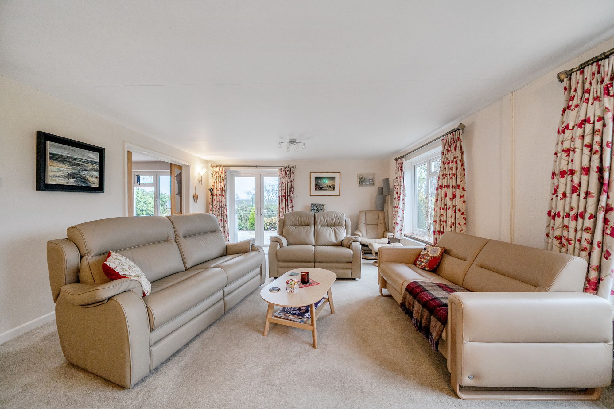 To the front of the property a generous gravelled driveway provides ample parking and leads to a substantial detached double garage. A double-glazed storm porch leads to the front door which opens into a spacious ‘L’ shaped entrance hall, with parquet flooring and ample built-in storage space, doors from the entrance hall lead to all rooms. The fabulous triple aspect sitting room benefits from a wood burning stove as well as double doors that open onto the garden. The dining room is accessible from the sitting room via sliding doors and again enjoys views over the terrace and garden beyond. The kitchen/breakfast room features and a generous run of worktops with base and eye level storage as well as ample pull out storage. There is a one and half bowl sink unit, ceramic hob, extractor hood, double oven and an integrated dishwasher. The adjoining utility room houses the gas boiler as well as providing space and plumbing for washing machine and tumble dryer and a door provides access to the front of the property. In total there are four bedrooms, all doubles, with the principal bedroom benefitting from a large en-suite shower room and door onto the terrace.