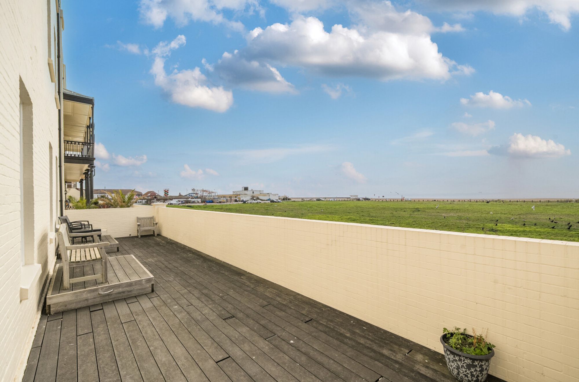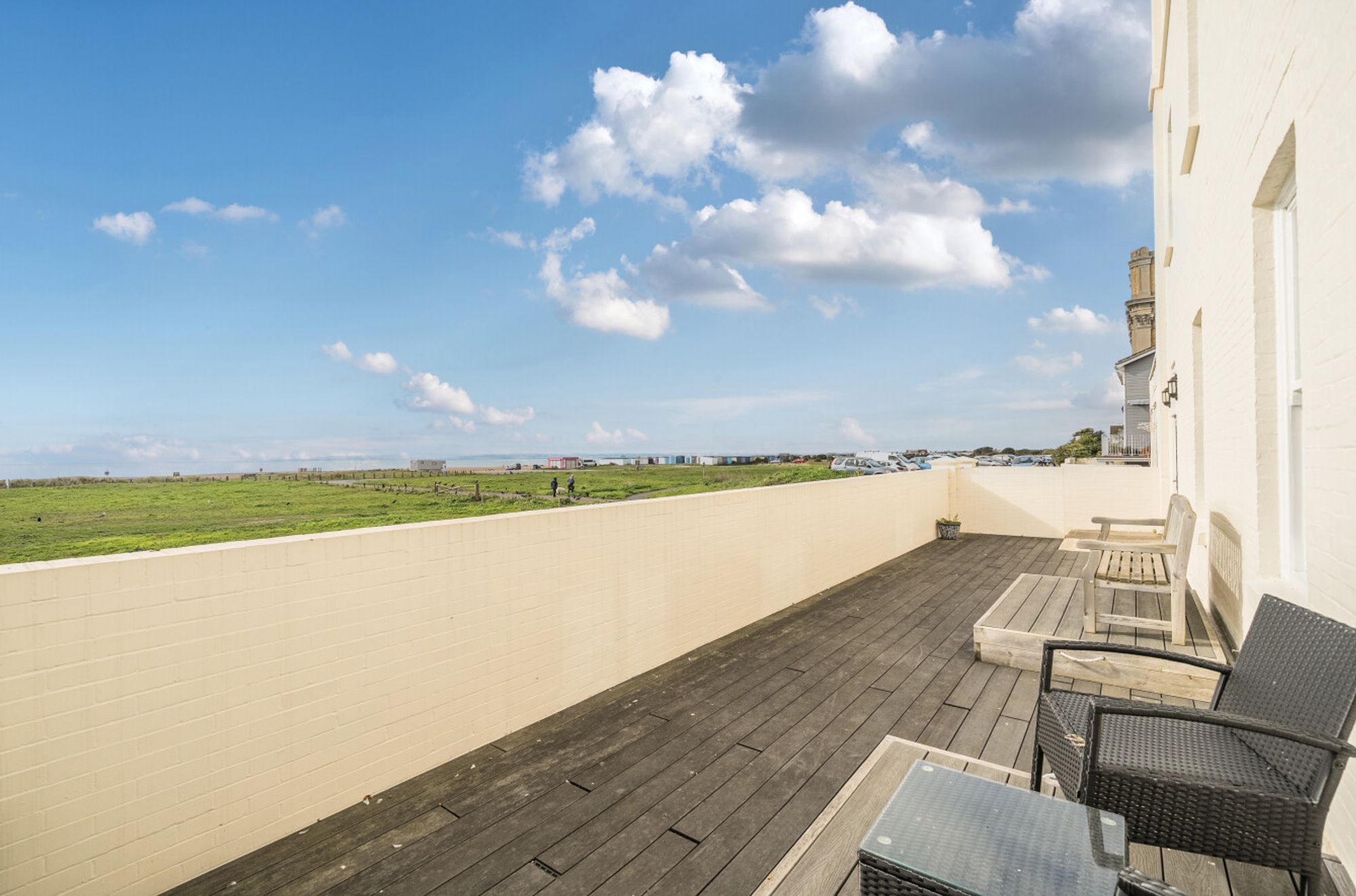 The expansive private terrace, spanning the width of the property, offers raised decked areas perfect for al fresco dining, and includes a private gate leading to the common and beach.
