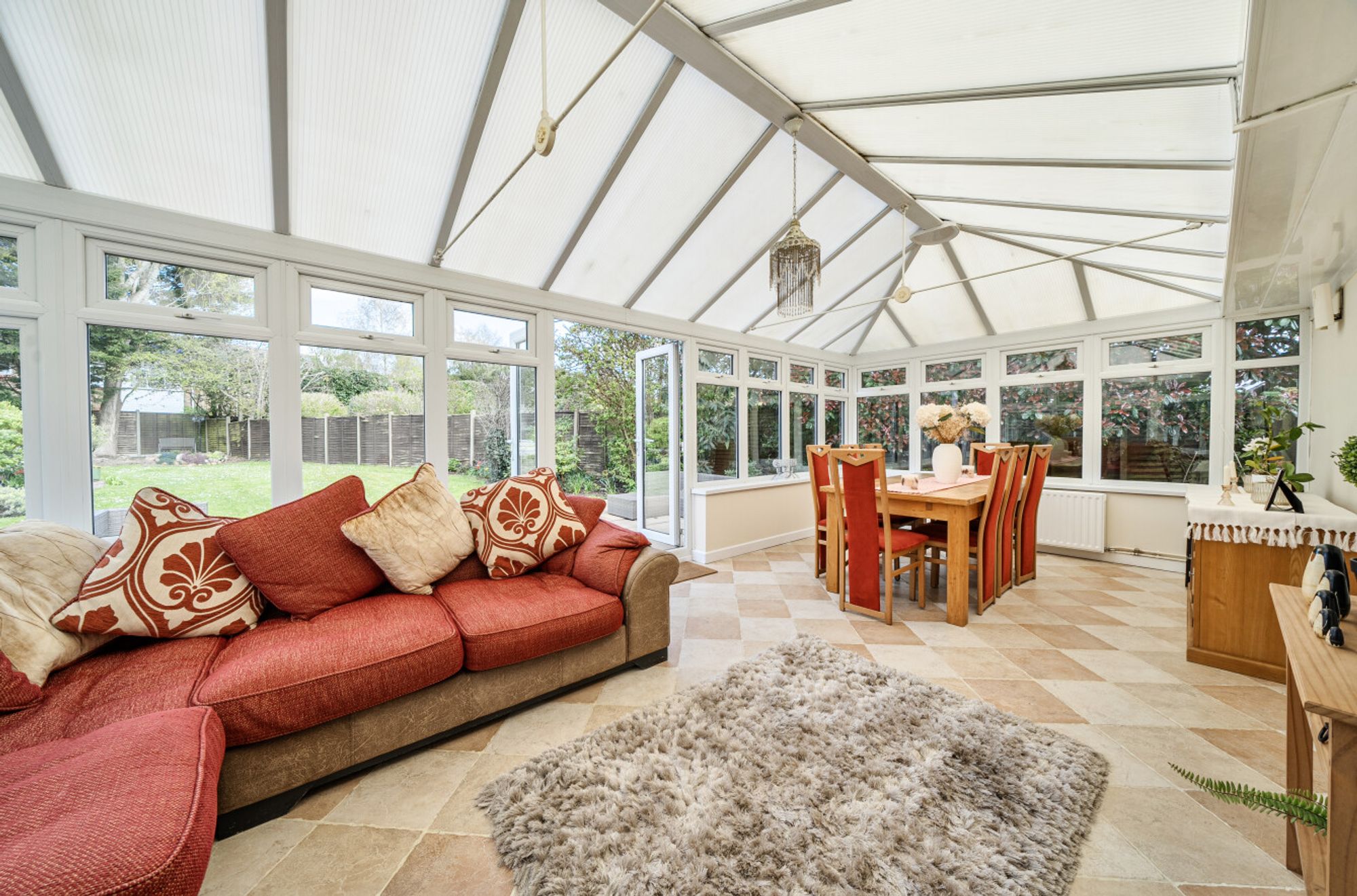 The property offers a spacious and versatile layout, enhanced by an abundance of natural light throughout. The entrance hall leads into a comfortable sitting room, where a bay window and fireplace create a welcoming focal point. To the rear, a glazed garden room provides a flexible space for dining or relaxation, enjoying views over the garden and direct access outside. The kitchen is both practical and sociable, featuring generous storage and a central island ideal for everyday living.